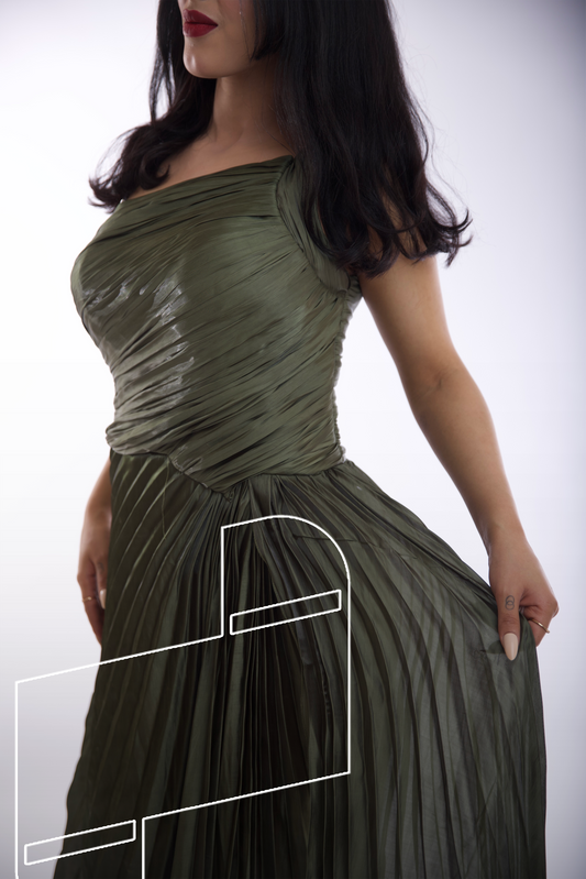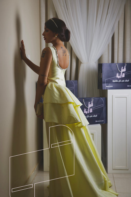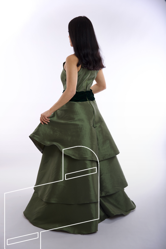فستان سهرة زيتي فاخر بتصميم أنيق وانسيابي للمناسبات الراقية
