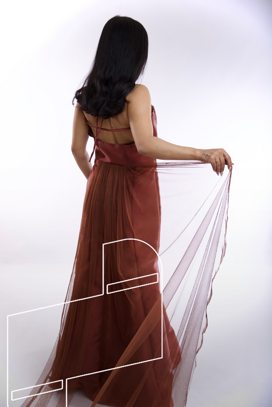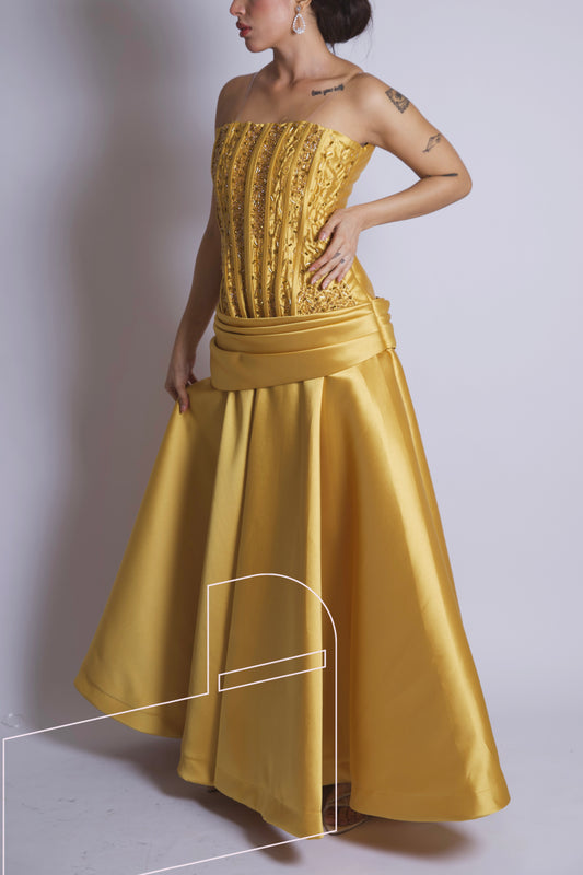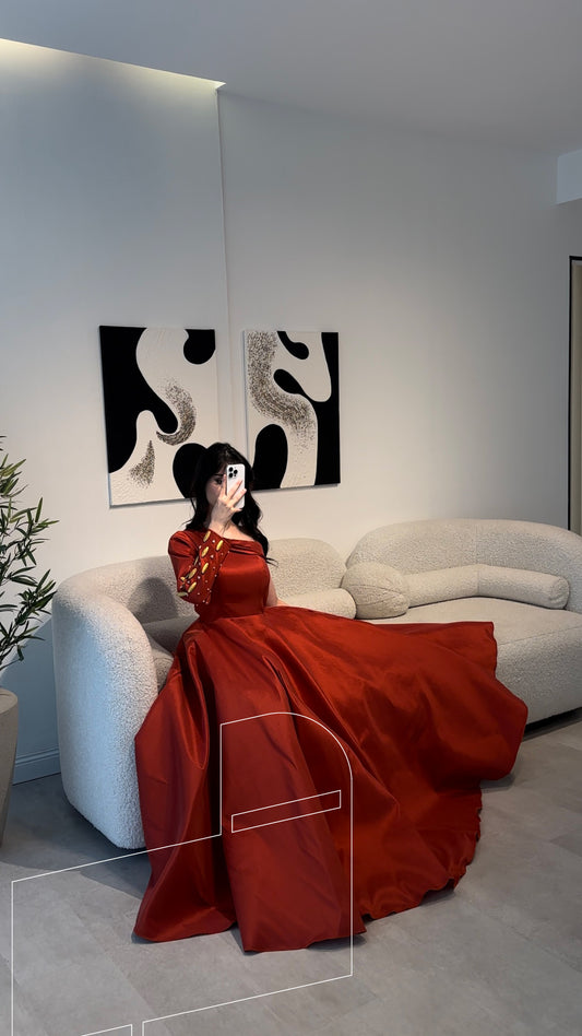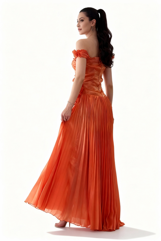 فستان ساحر بتصميم أنيق وجريء، يجمع بين العصرية والفخامة. مصنوع من قماش مميز لامع ، مما يمنحه مظهراً راقياً ومفعماً بالحيوية. يتميز بلونه البرتقالي الذي يعكس طاقة وإشراقة جذابة، مثالي للمناسبات الفاخرة.