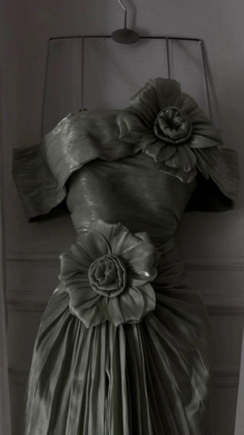 فستان سهرة زيتي فاخر بتصميم أنيق وانسيابي للمناسبات الراقية