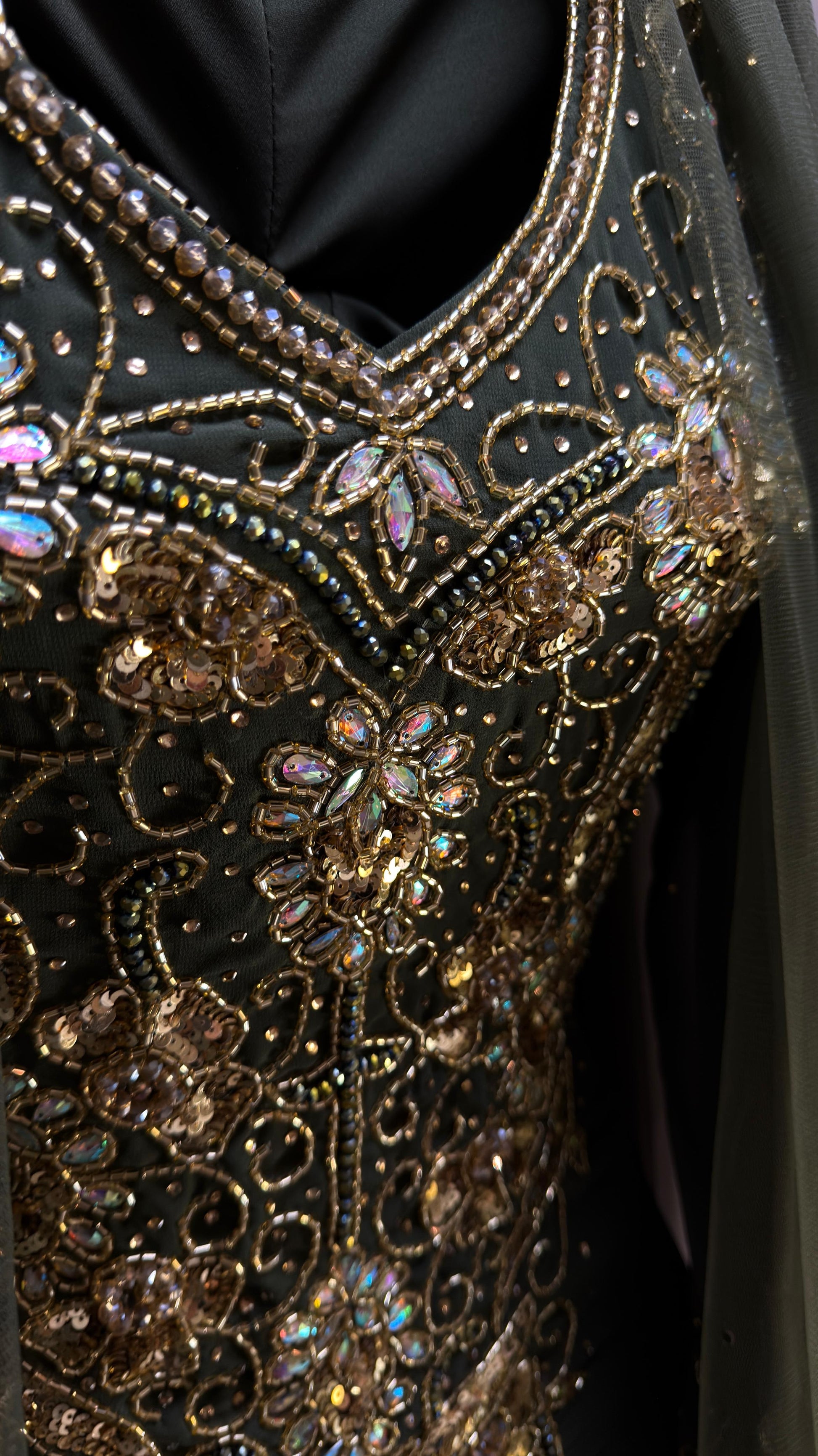 - **تطريز فاخر:** يضفي لمسة من الفخامة مع التفاصيل الذهبية التي تعزز من جاذبية الفستان.