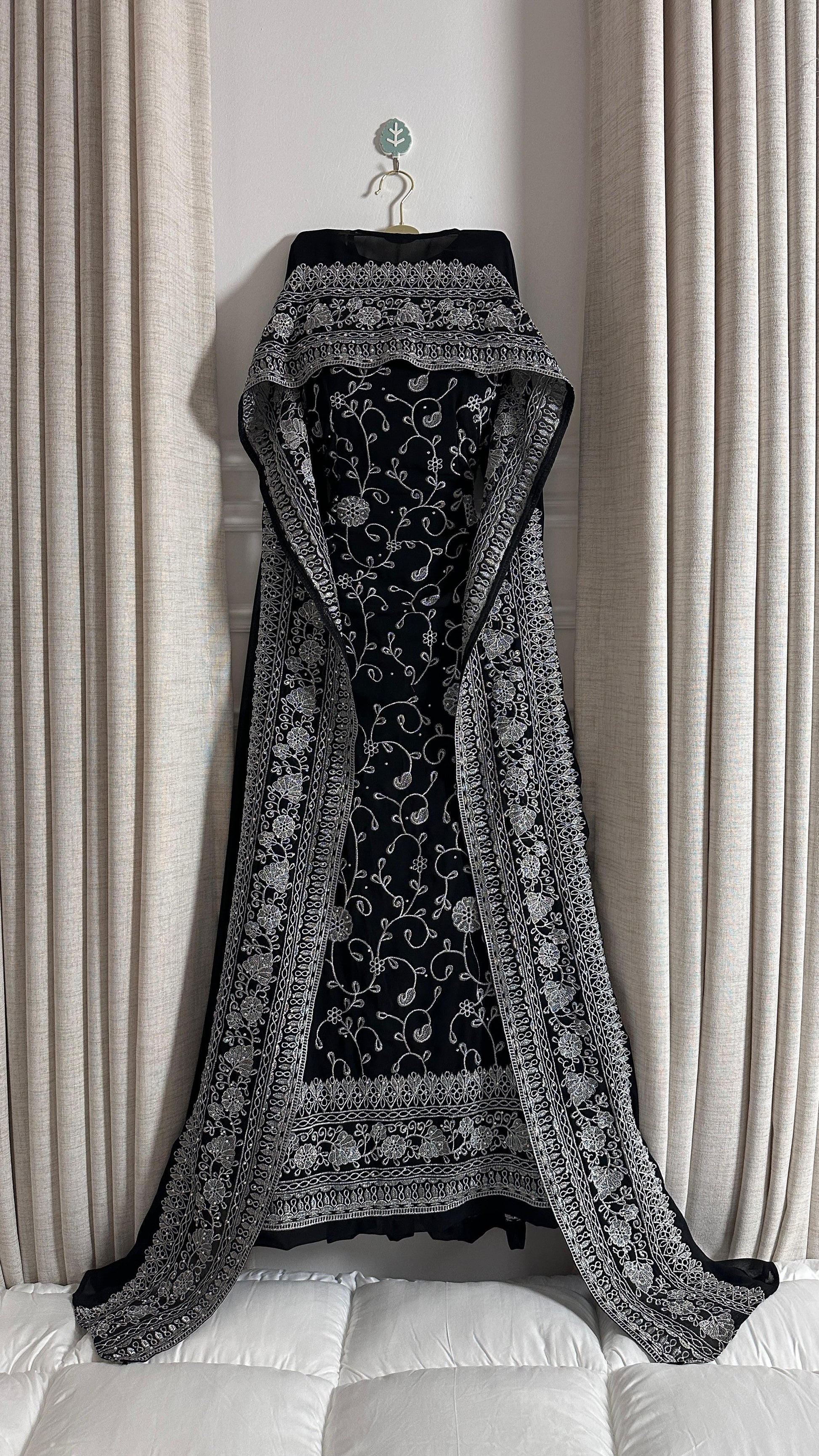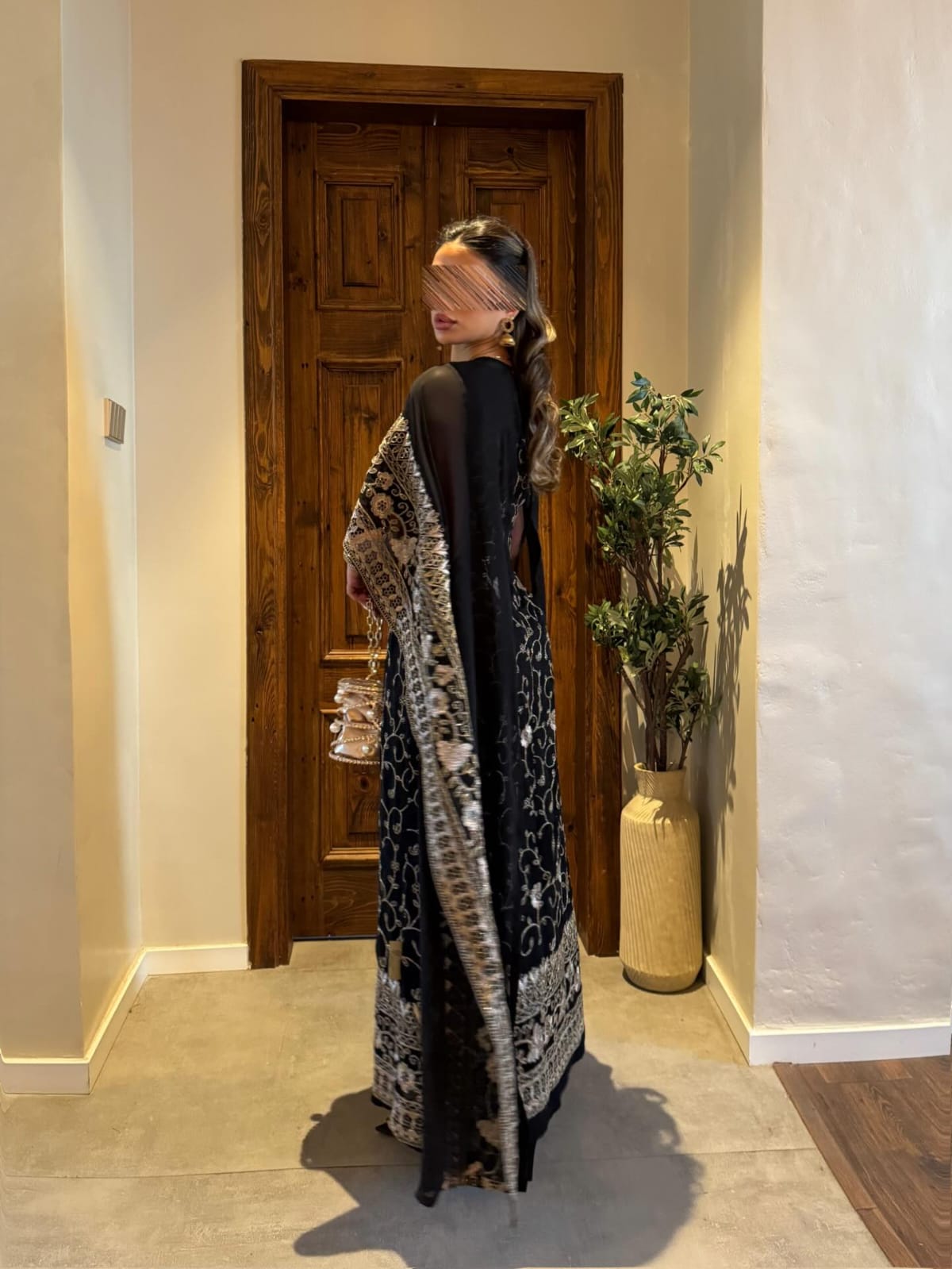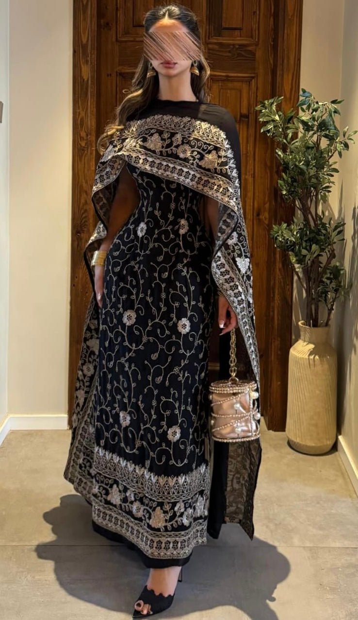 - **فستان أسود طويل:** يغطي الجسم بشكل رشيق ويتميز بنقوش مزخرفة باللون الفضي أو الذهبي، مما يضيف لمسة فاخرة.