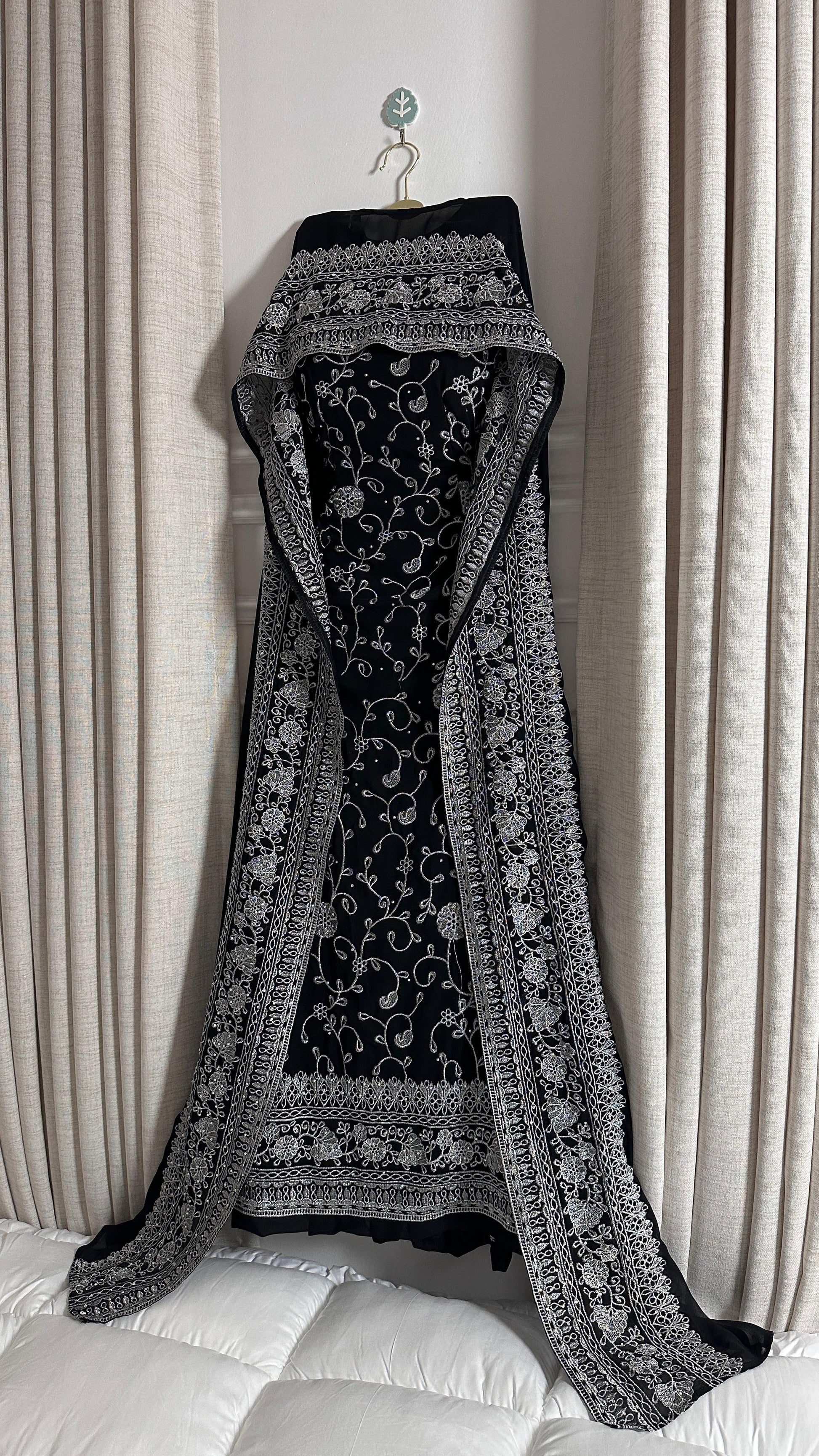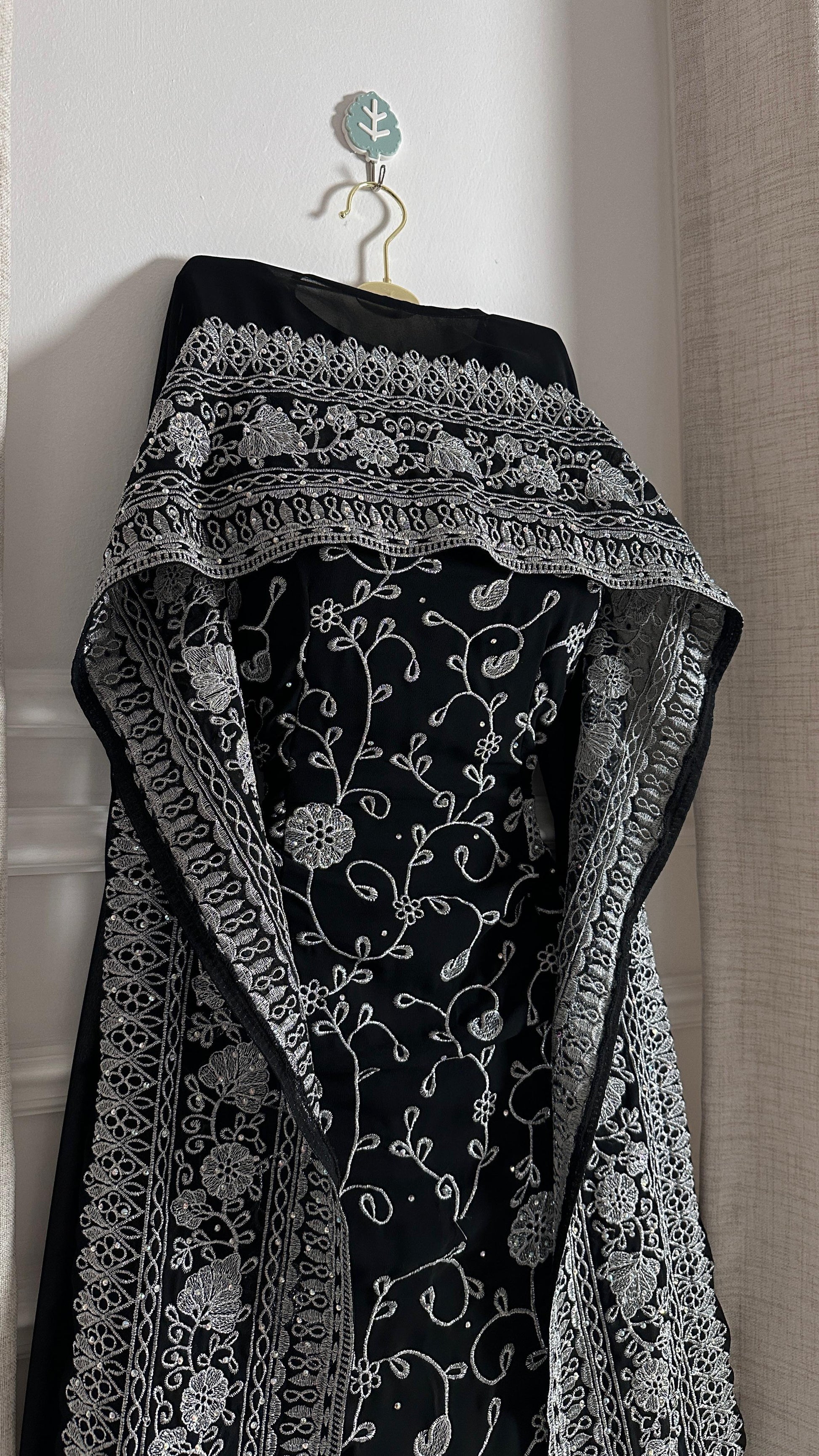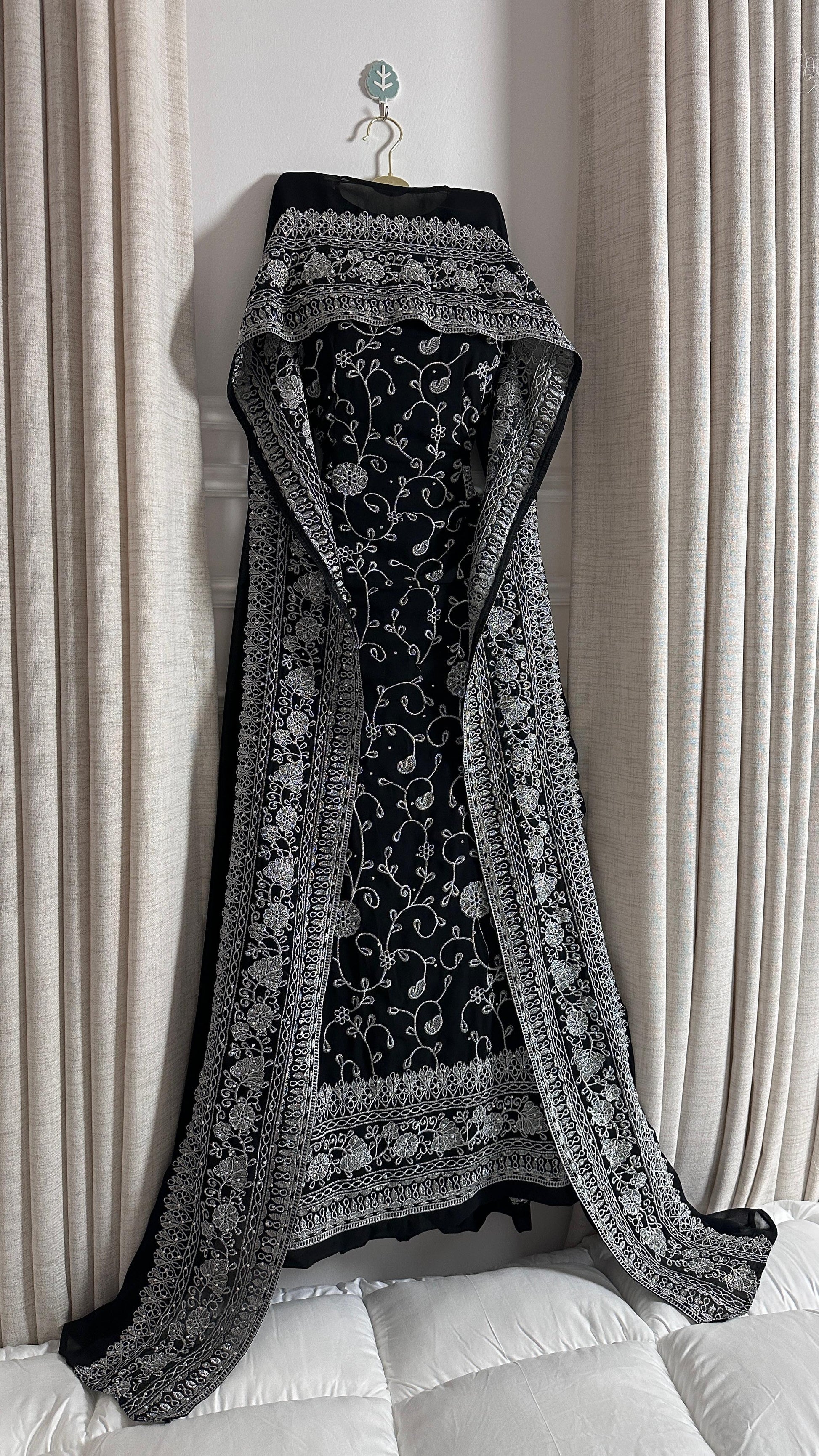- **فستان أسود طويل:** يغطي الجسم بشكل رشيق ويتميز بنقوش مزخرفة باللون الفضي أو الذهبي، مما يضيف لمسة فاخرة.