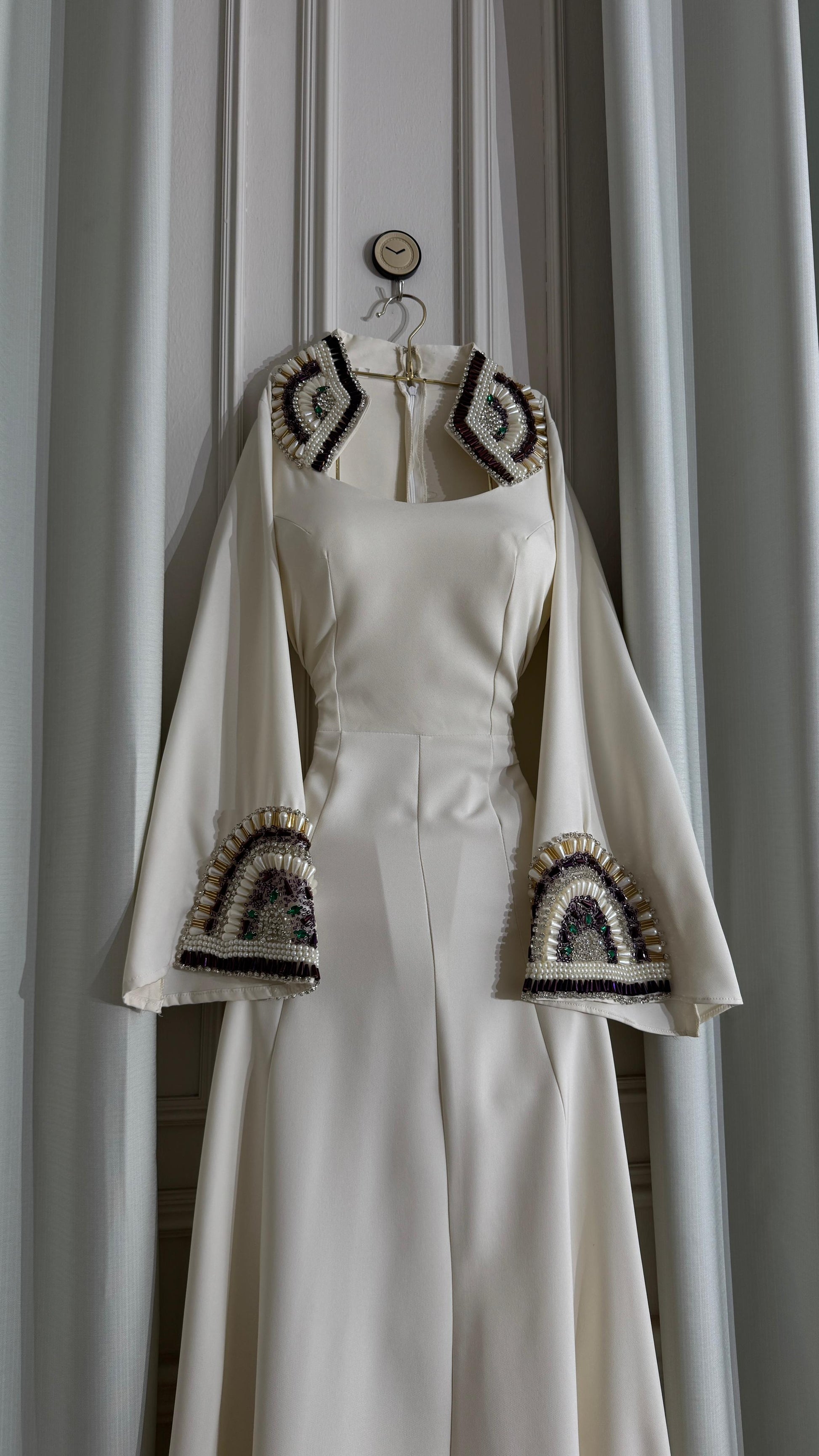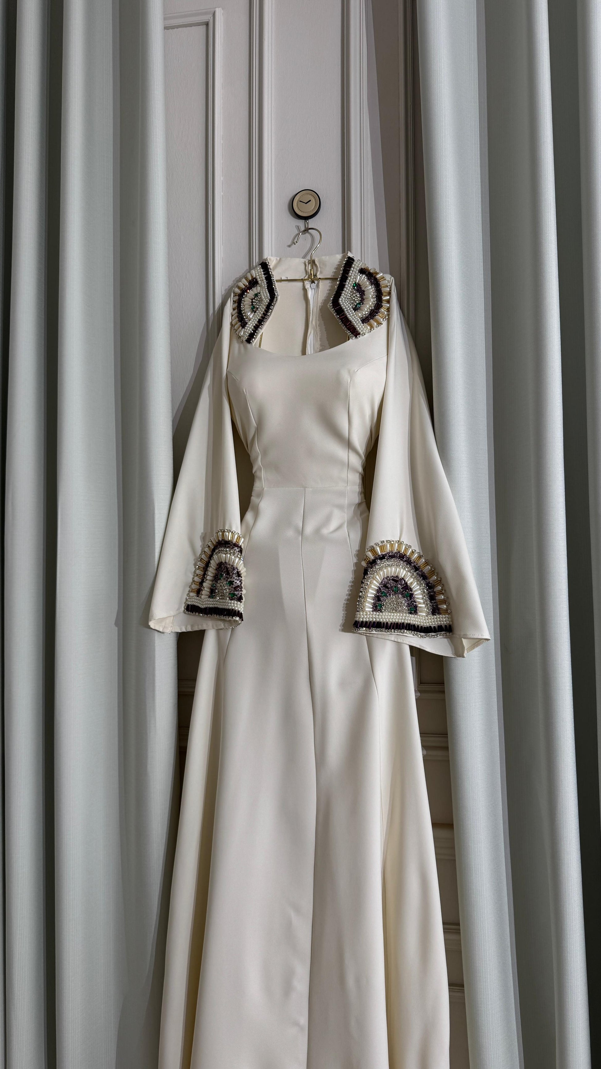 - **أكمام مزخرفة:** أكمام واسعة مزينة بتفاصيل فاخرة، حيث تضيف لمسة فنية للهيكل العام للفستان.