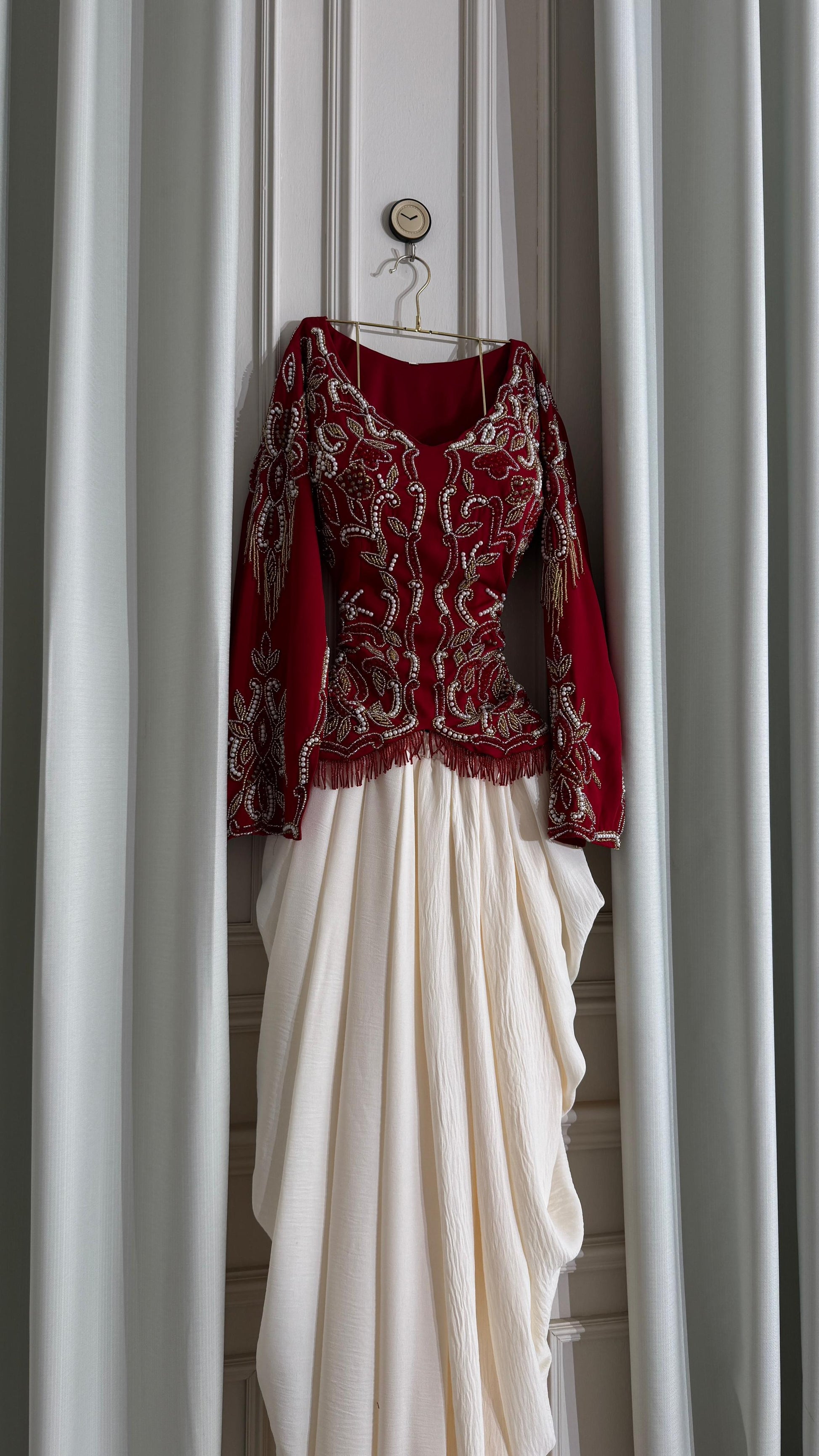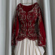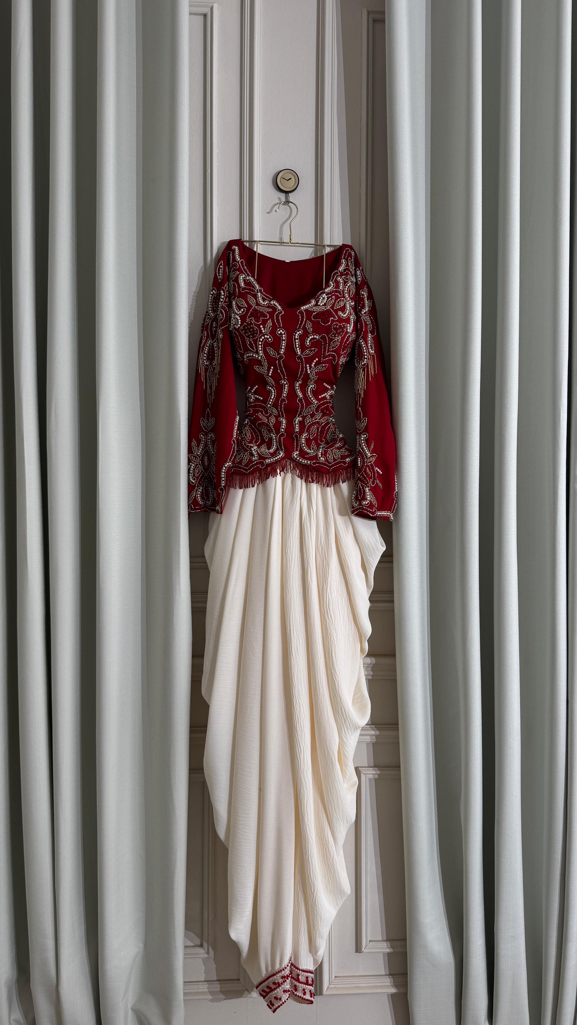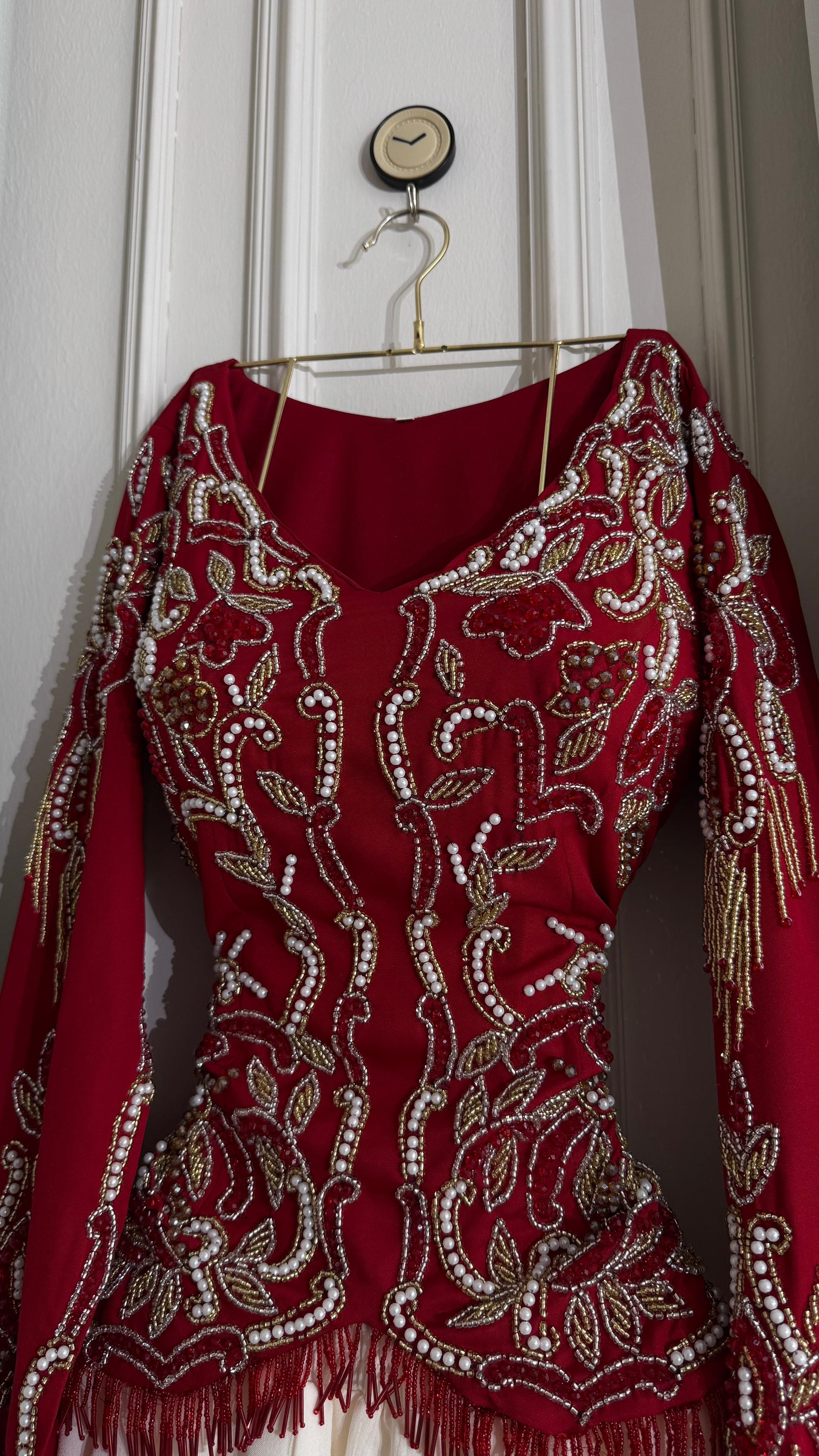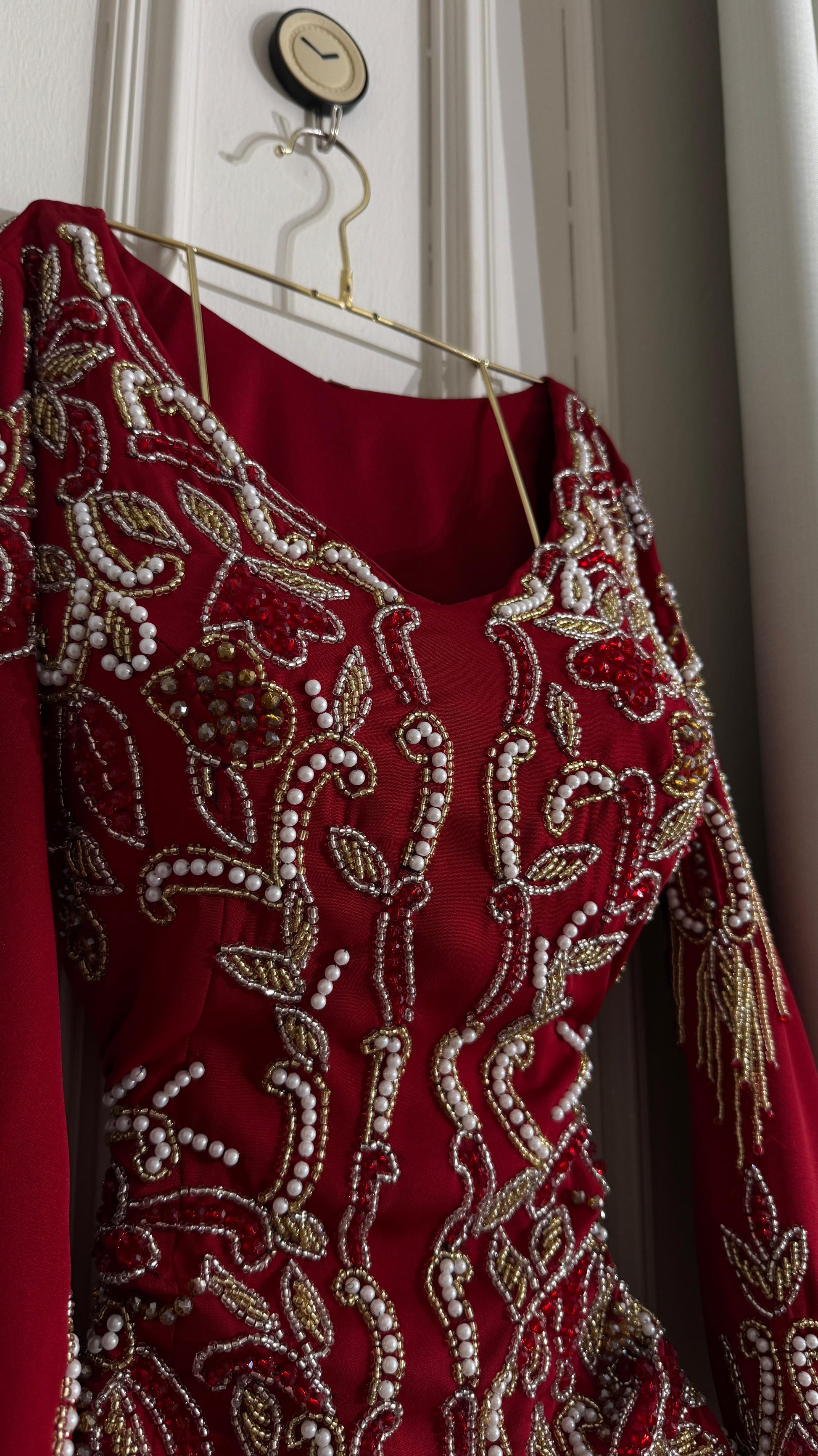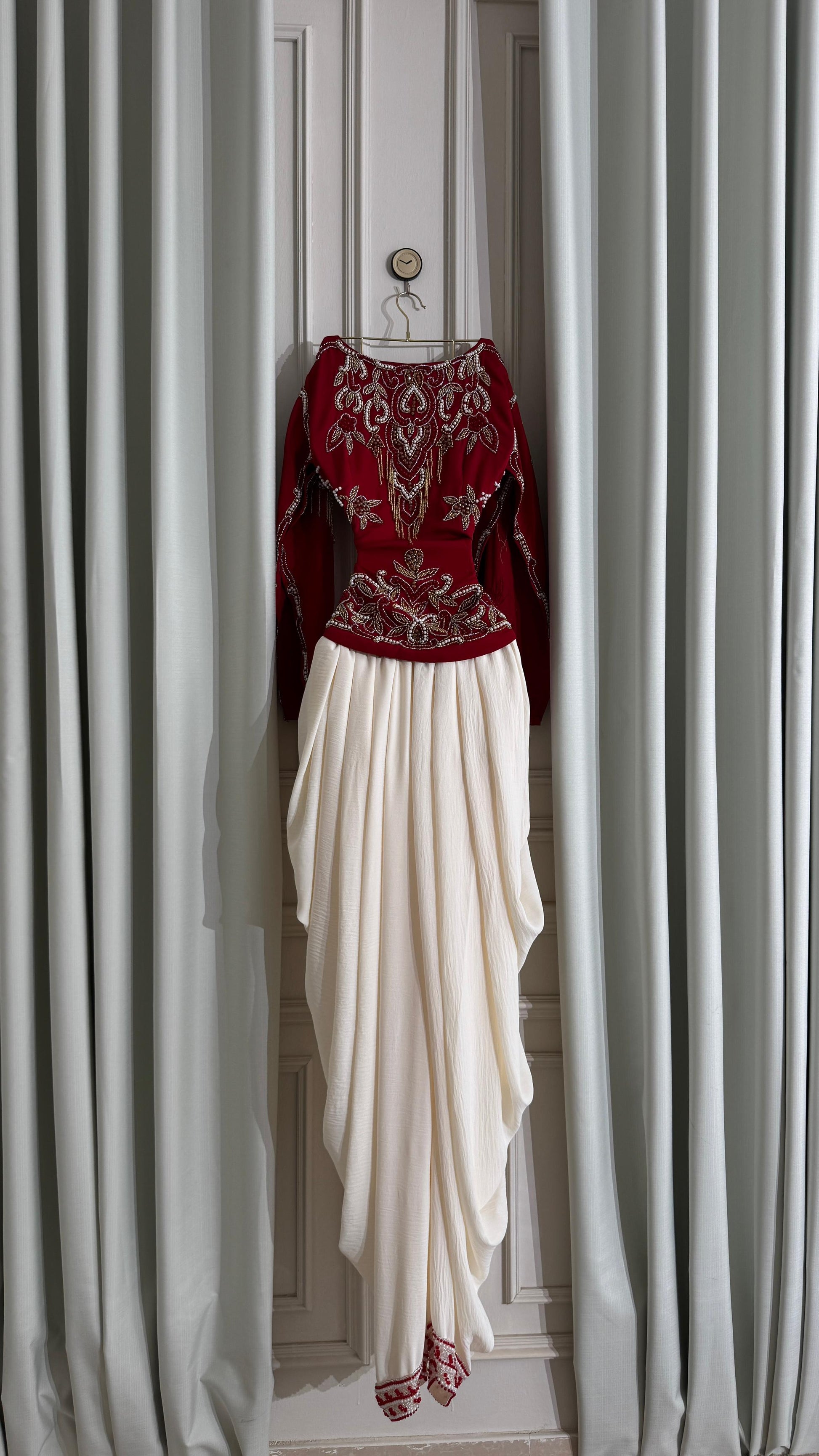 - **جزء علوي مزخرف:** الجزء العلوي باللون الأحمر مزين بتطريزات فاخرة تبرز الجمال والتفاصيل الدقيقة.