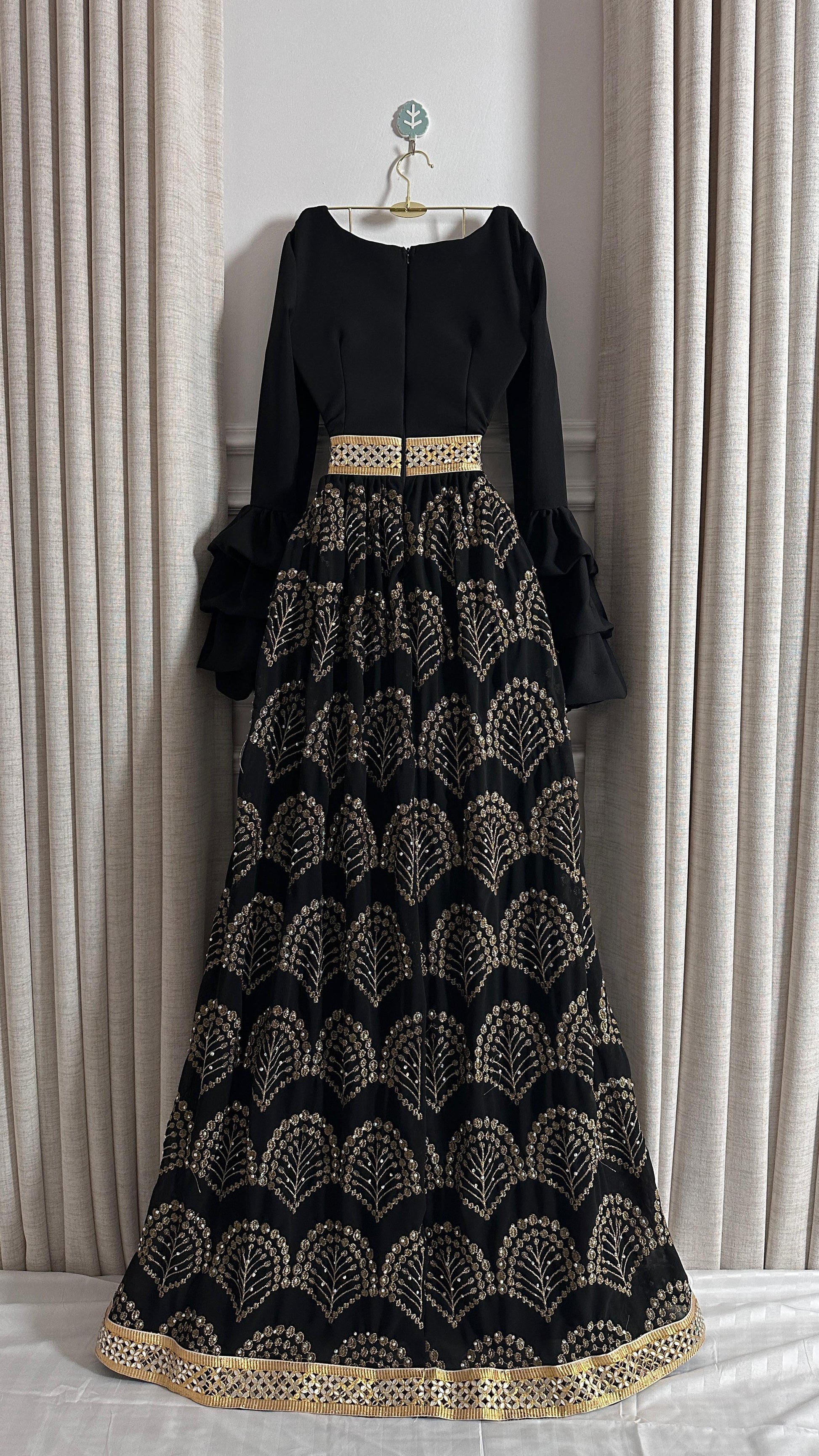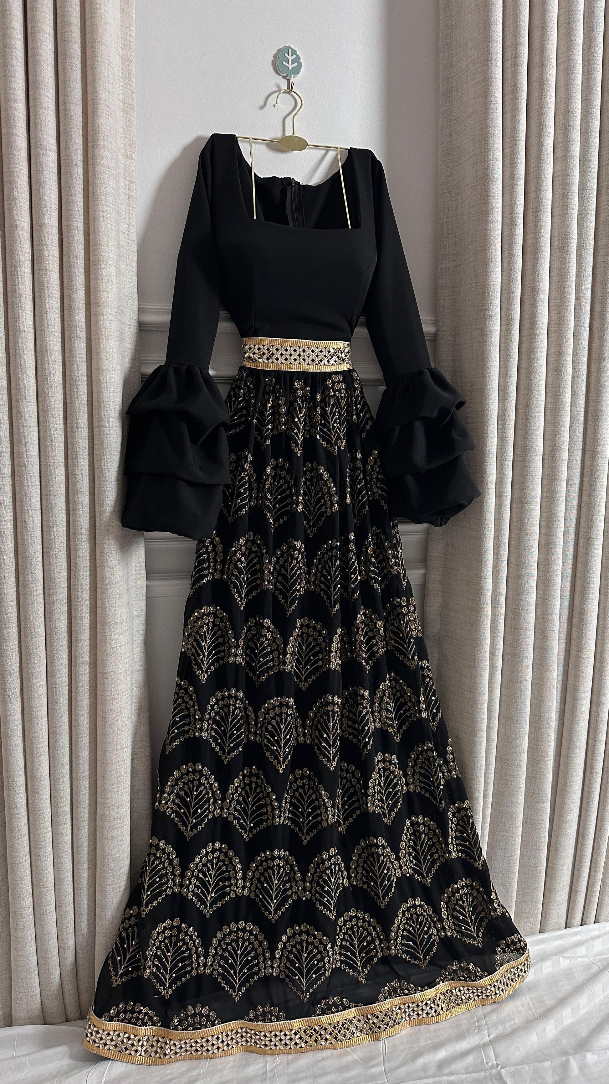 - **جزء علوي أسود:** يتميز بقصة عصرية مع أكمام فضفاضة مزخرفة، مما يضيف لمسة درامية وإبداعية.