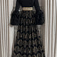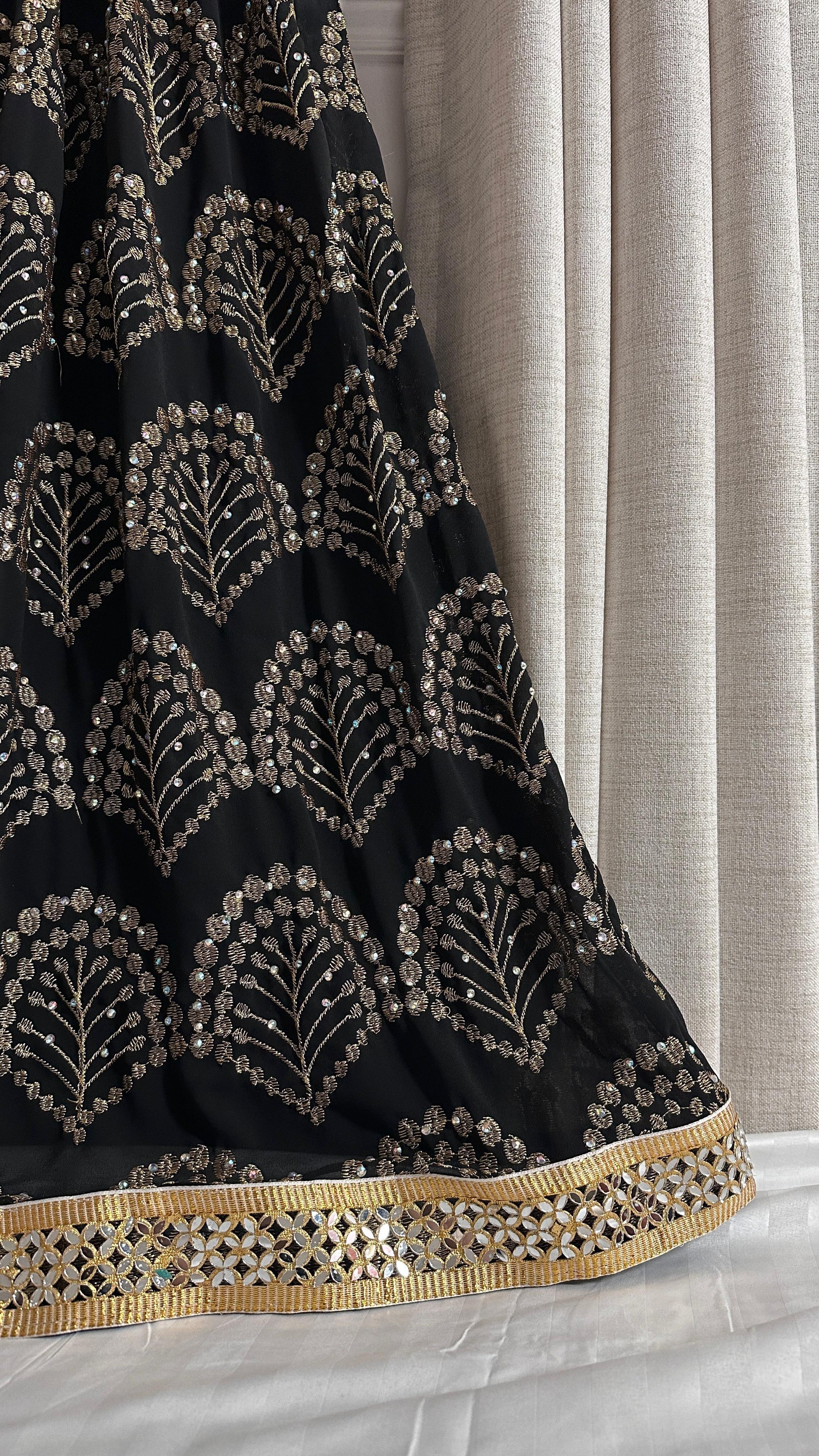 - **تنورة سوداء مزخرفة:** تحمل نقوشًا ذهبية تمثل أشكال طبيعية، تضيف عمقًا وجمالًا للتصميم.