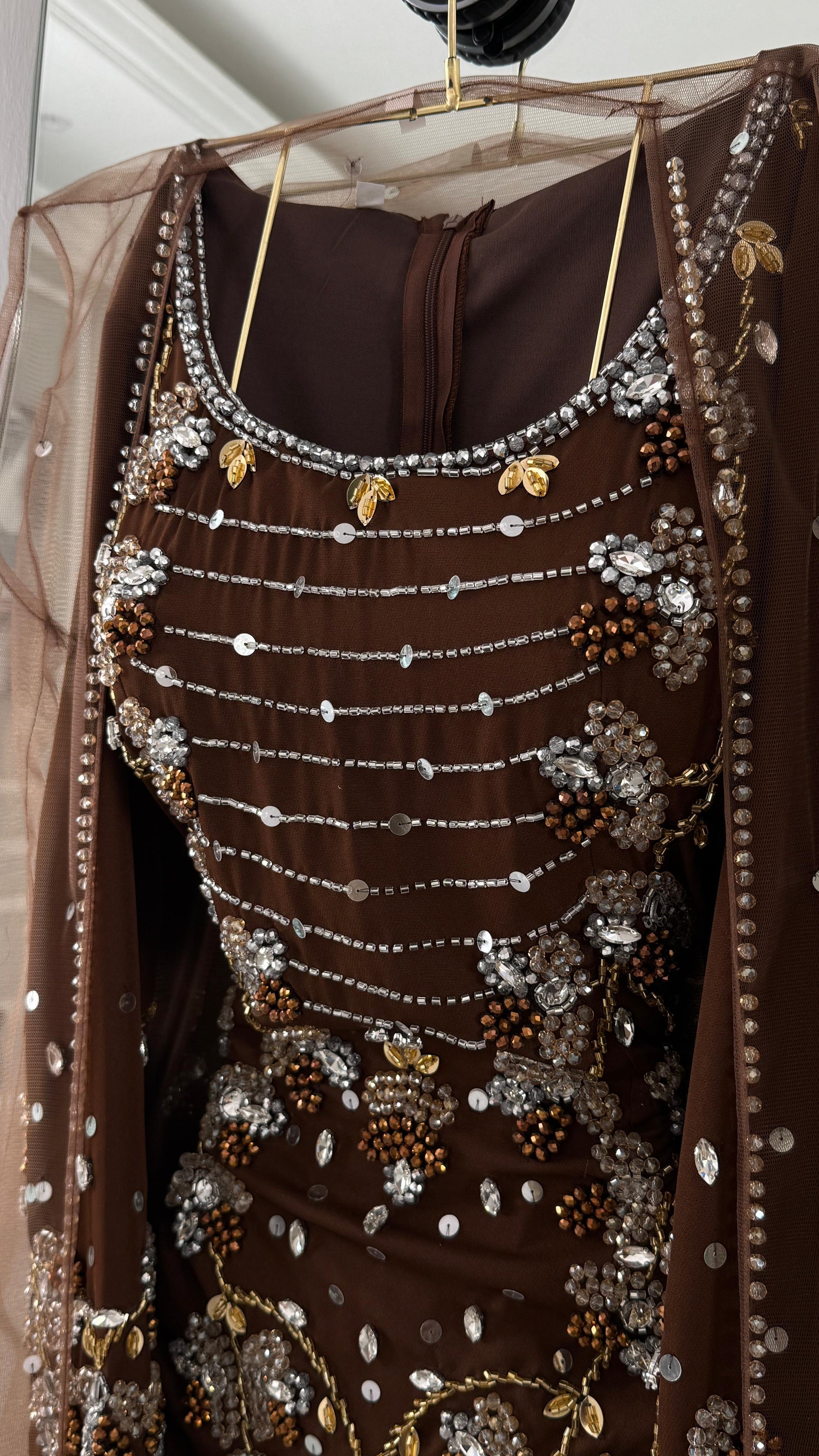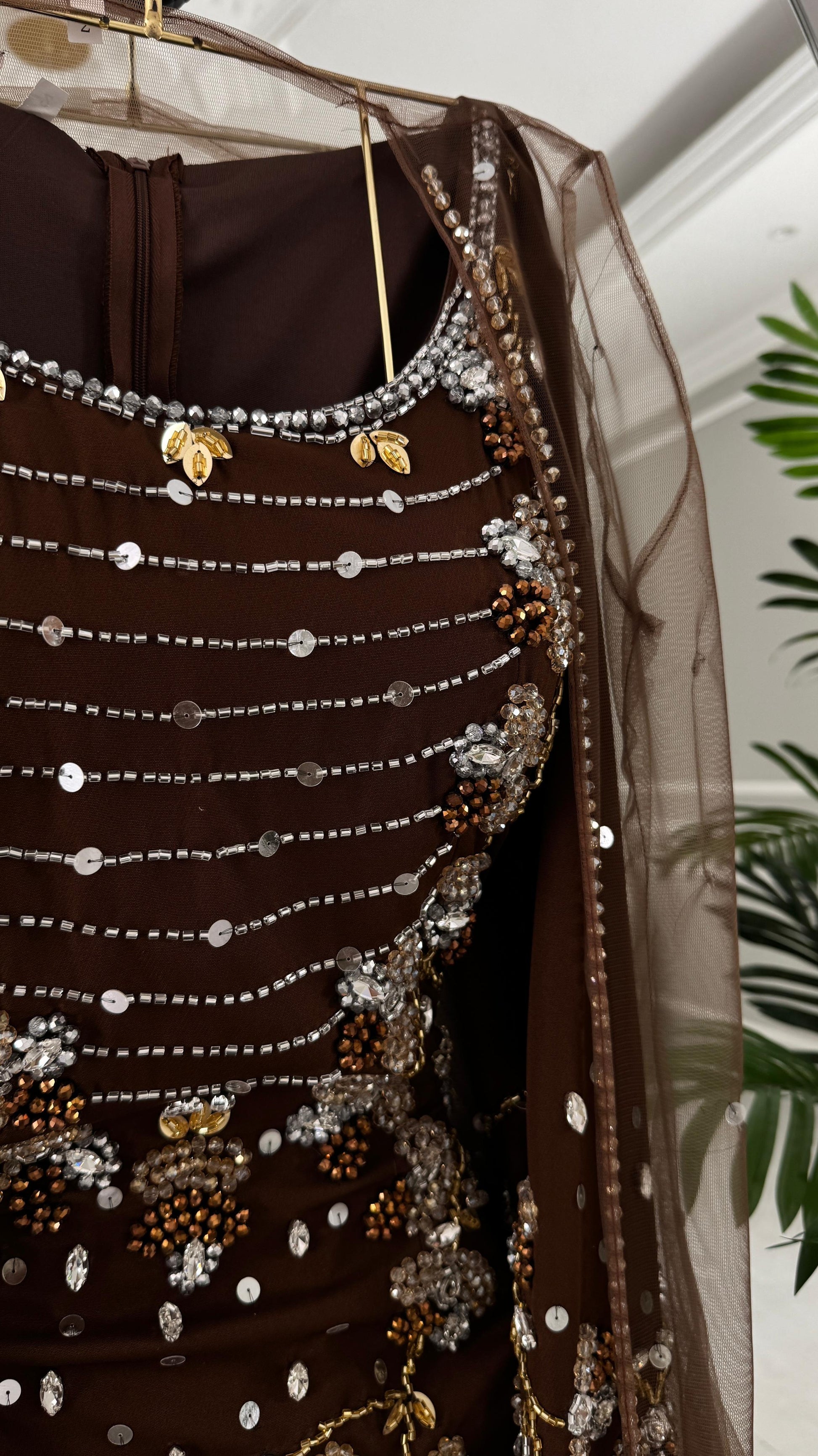 - **فستان بني ضيق:** يتميز بقصة بسيطة وجذابة، يبرز منحنيات الجسم بشكل جميل.
