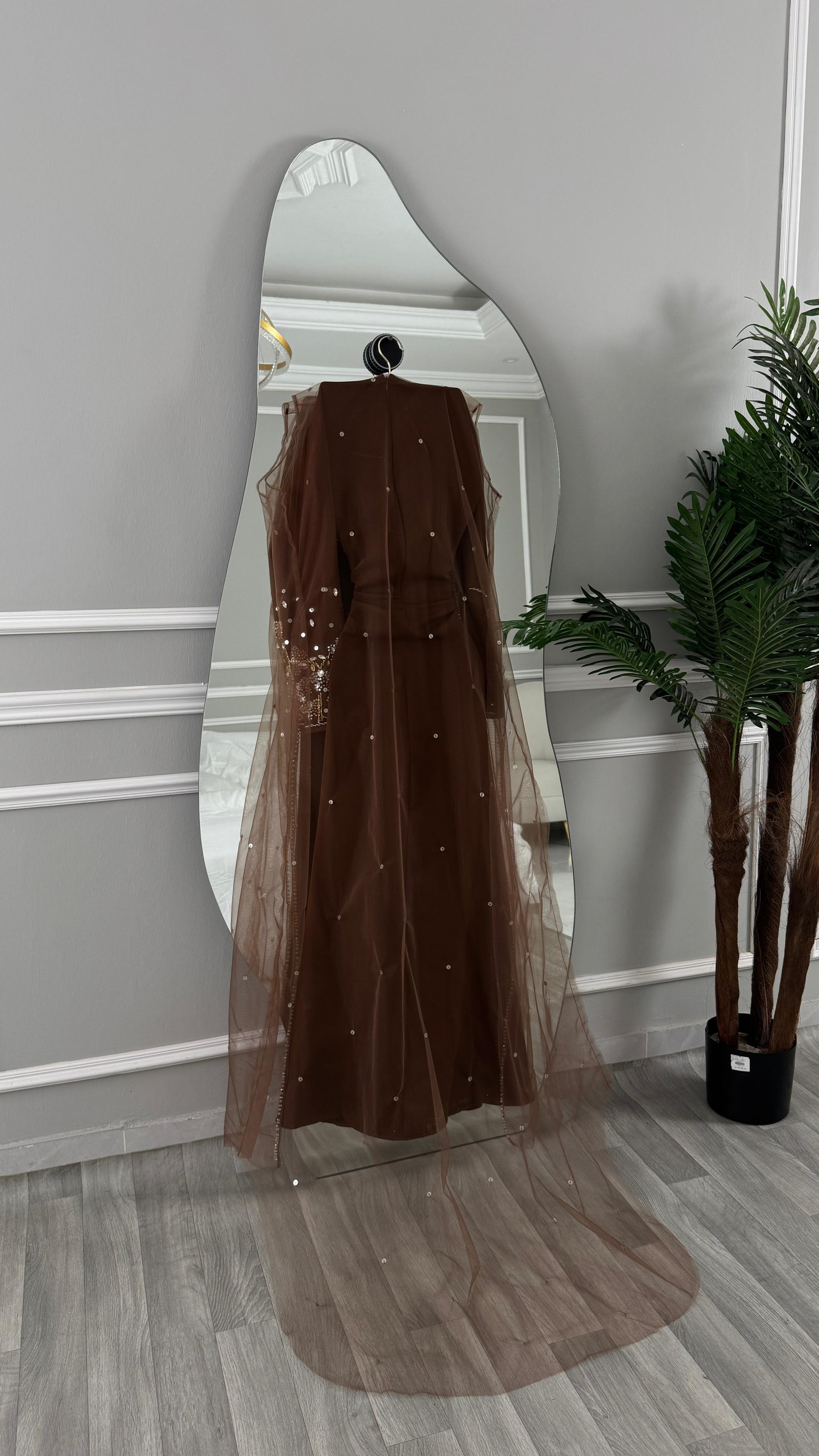 - **كاب شفاف:** يأتي مع الفستان، يغطي الكتفين وينسدل برشاقة، مما يعطي لمسة درامية للأناقة.