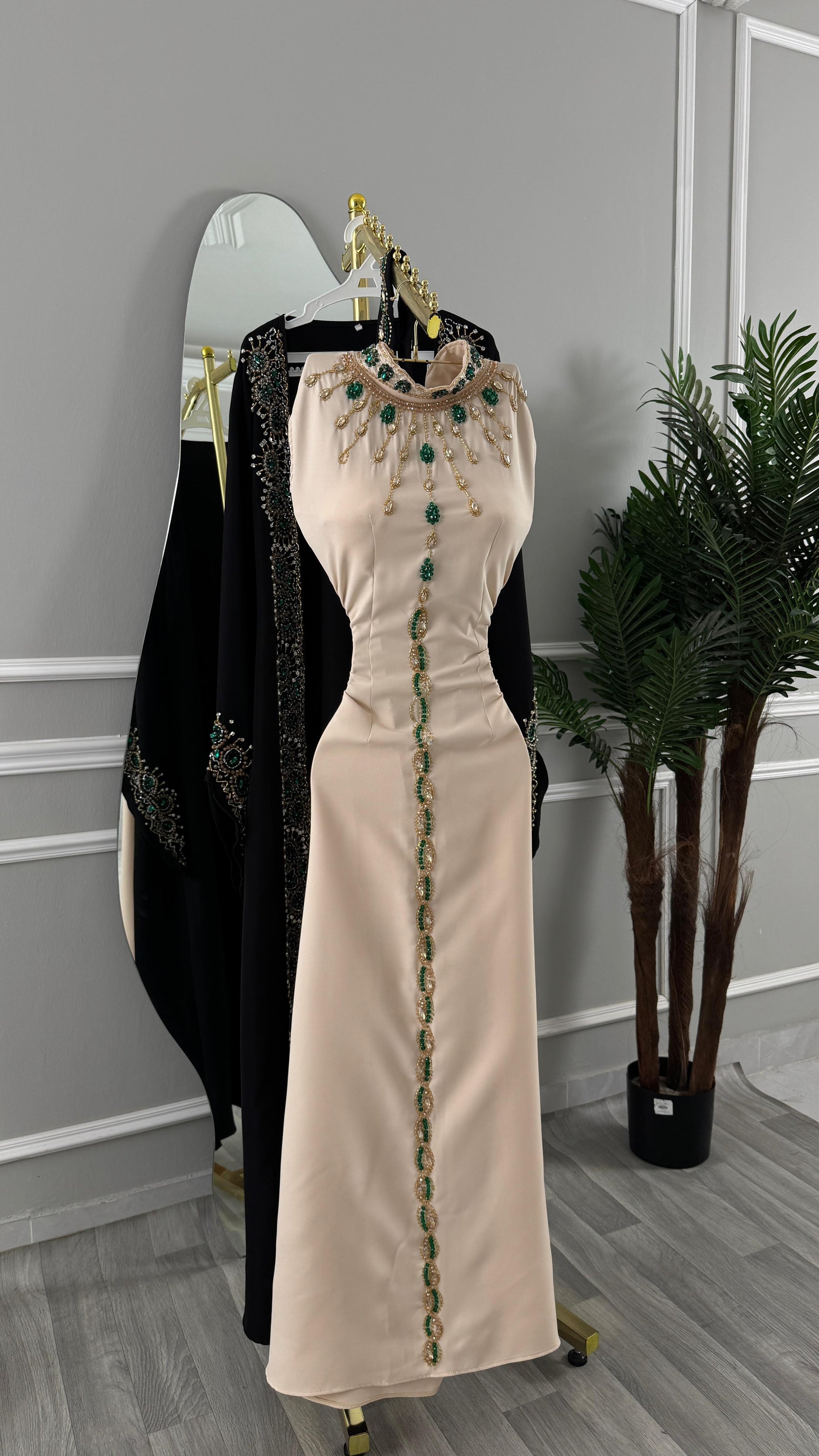 - **جزء علوي بلون البيج:** يجمع بين اللونين بشكل أنيق، مع تفاصيل مزخرفة تضيف عمقًا وجاذبية.