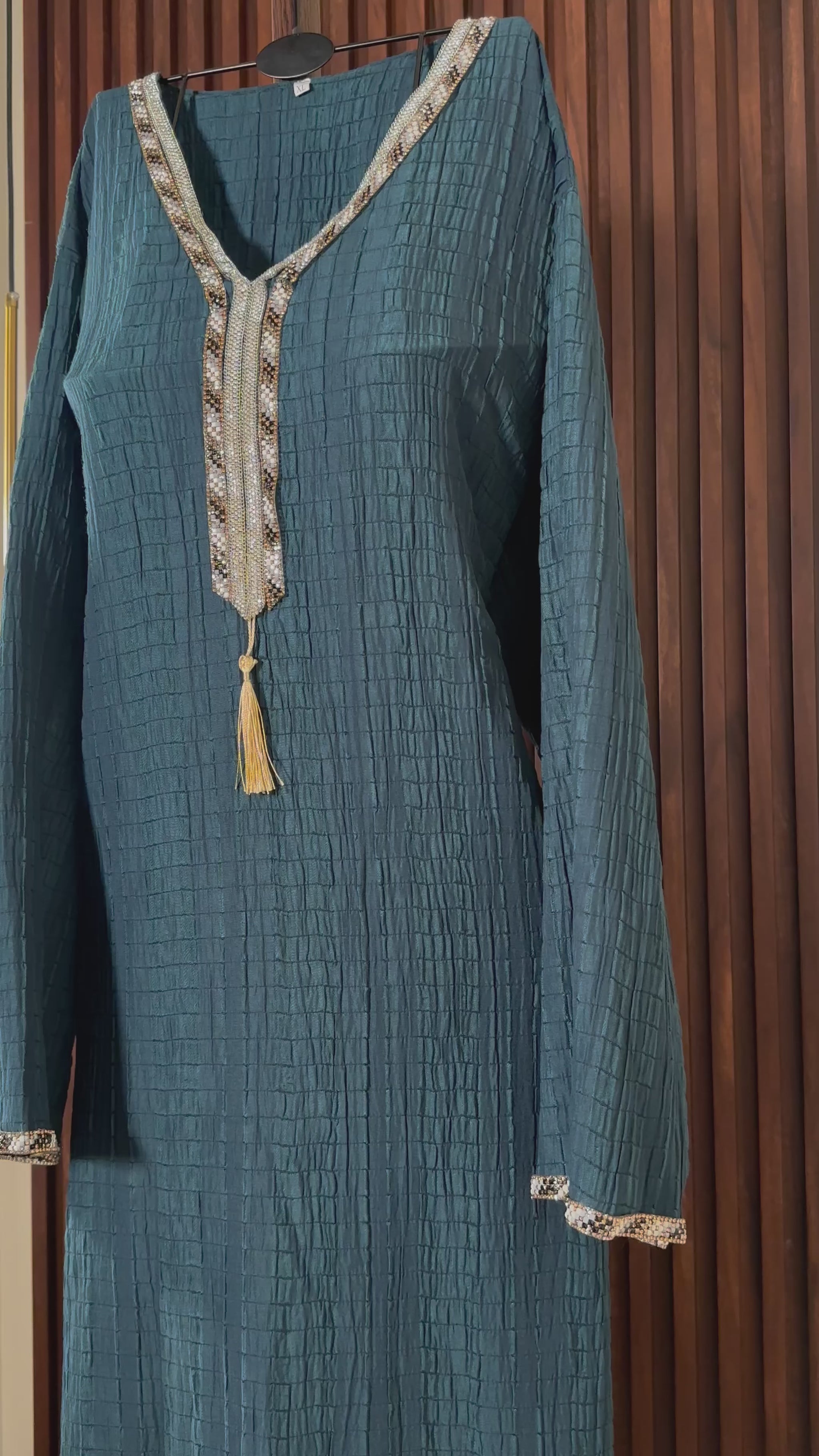 • الياقة: مفتوحة على شكل V مزينة بخيوط لامعة ناعمة تضيف لمسة أنيقة دون مبالغة