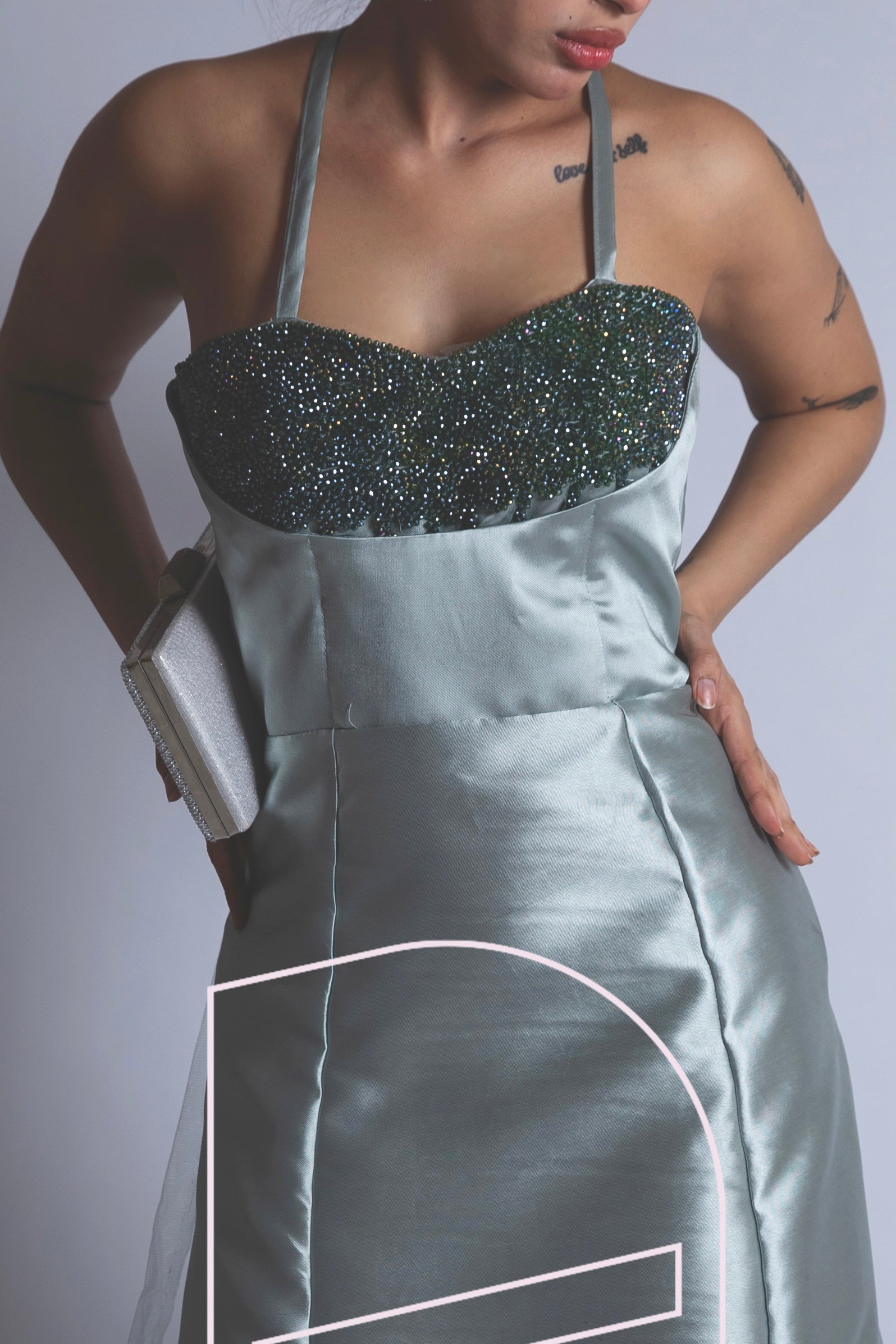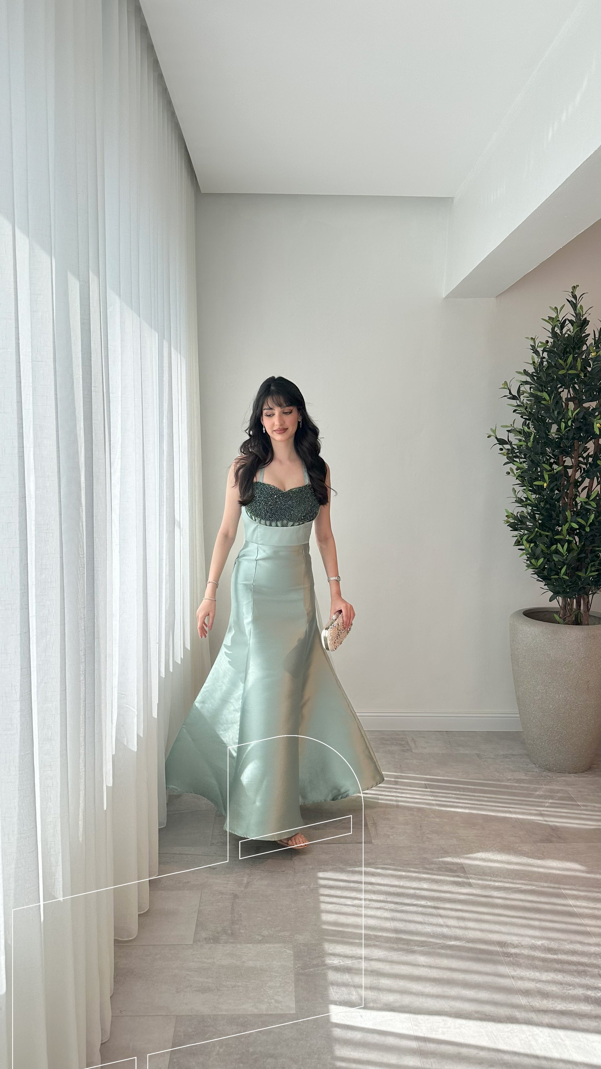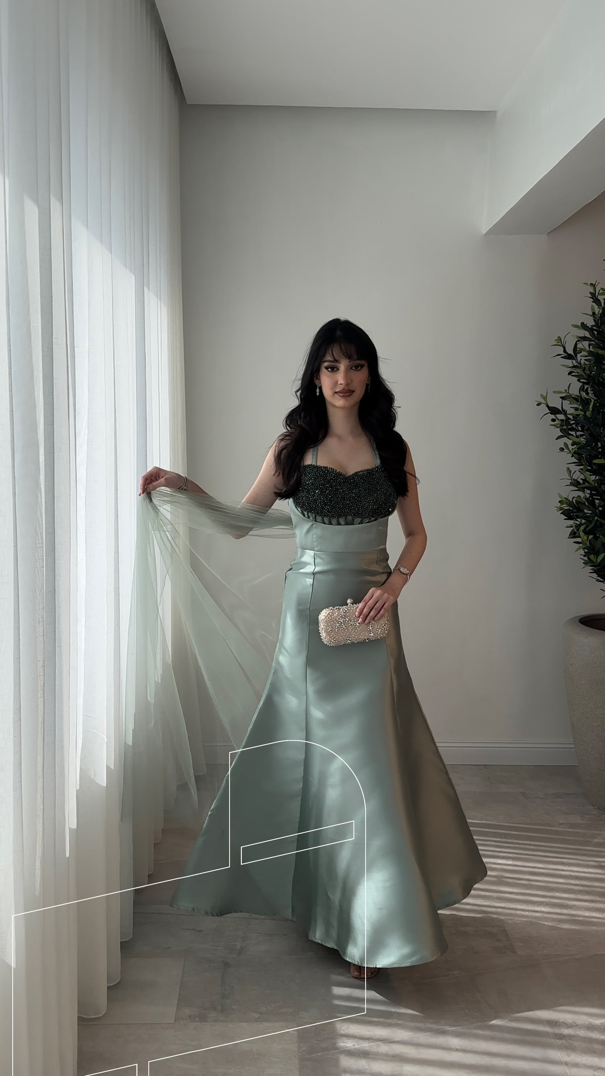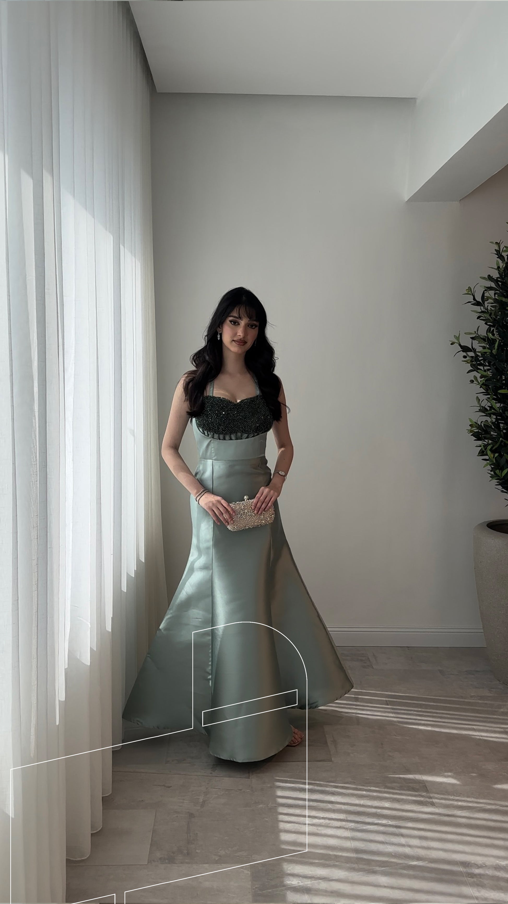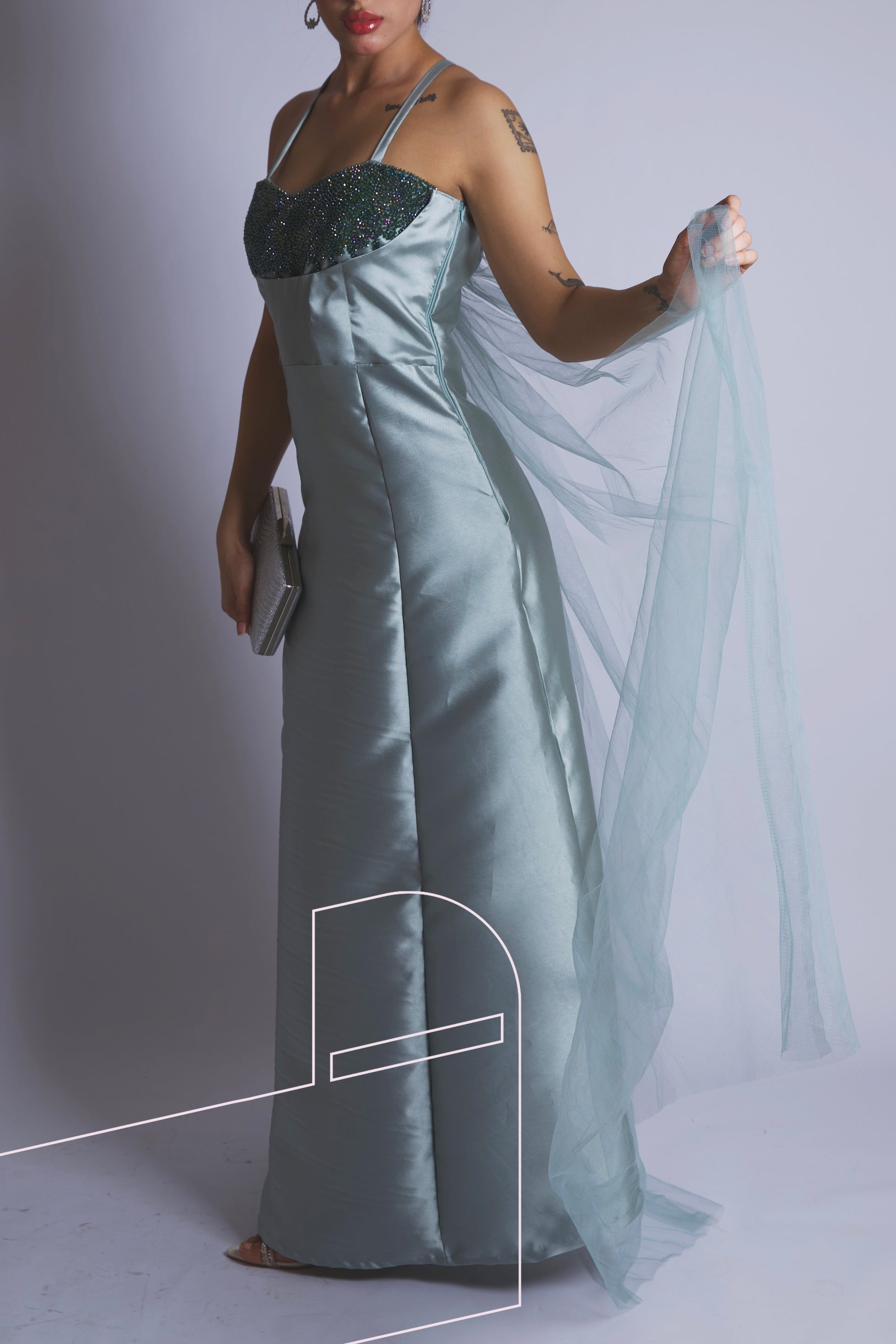 فستان سهرة بلون الازرق التيفاني الساحر وكرستال براق بقصة تبرز جمال القوام وذيل طويل يضفي لمسة درامية راقية لإطلالة تخطف الأنظار يأتي بتطريز يدوي بالخيوط الفضية التي تجعل الفستان يلمع برقي تحت الاضواء ليمنحك اطلالة مميزة و جذابة