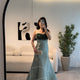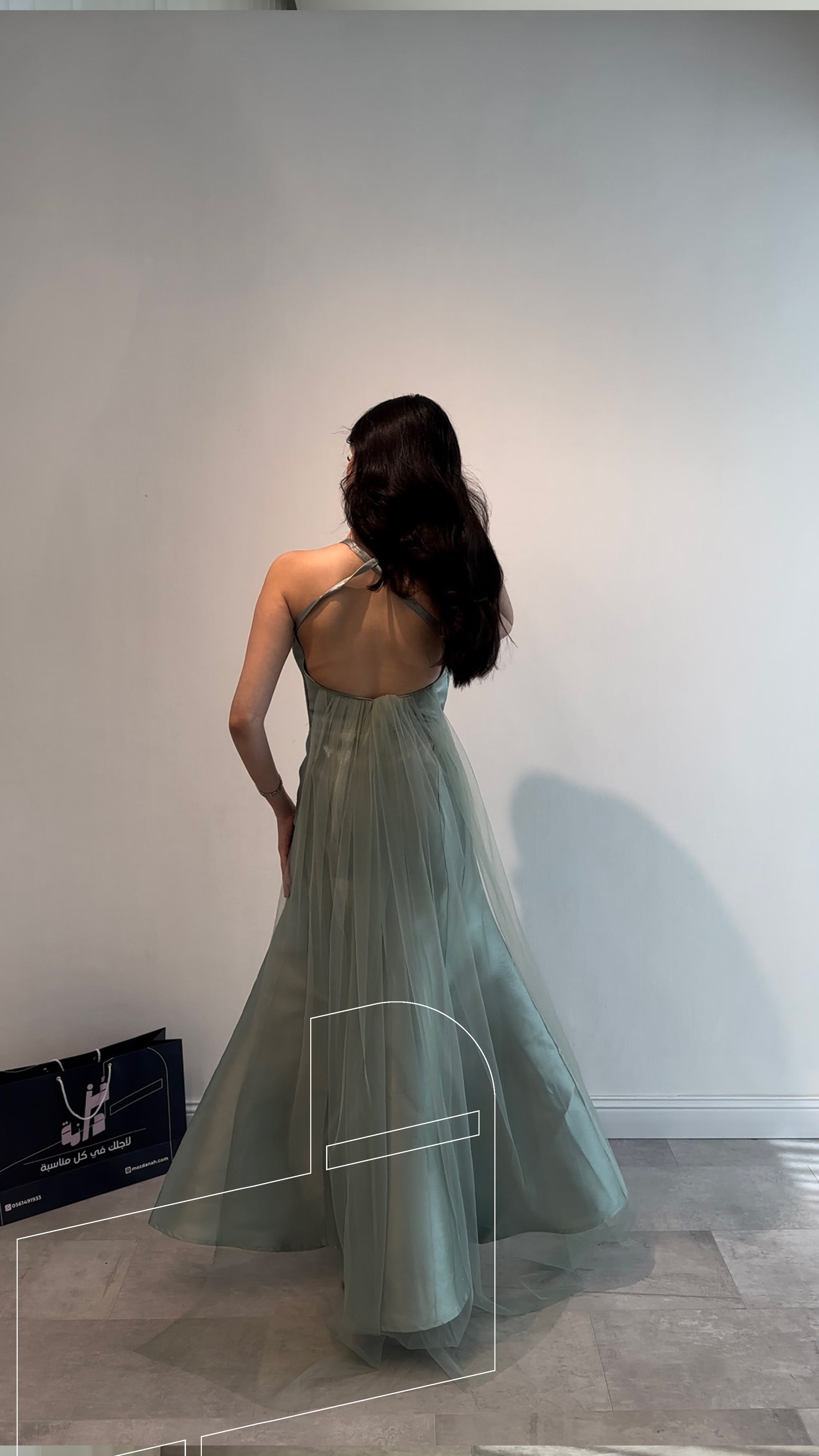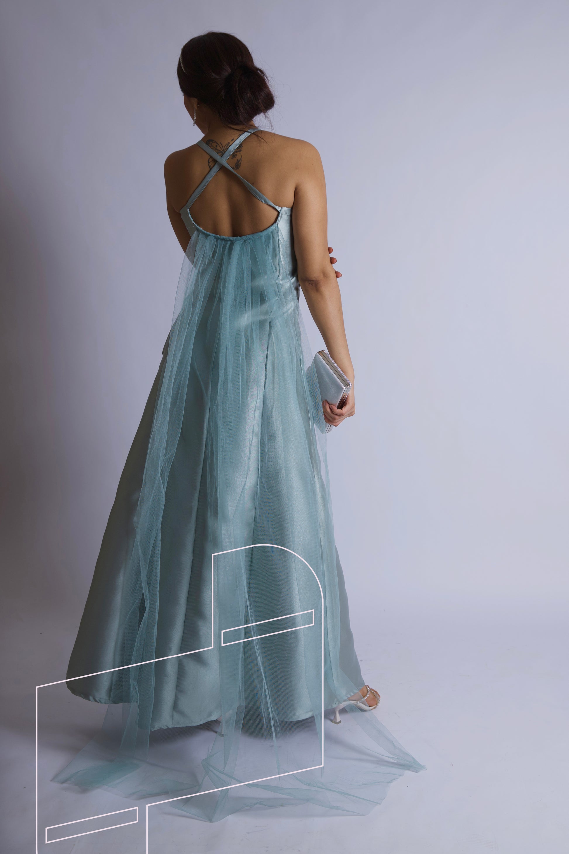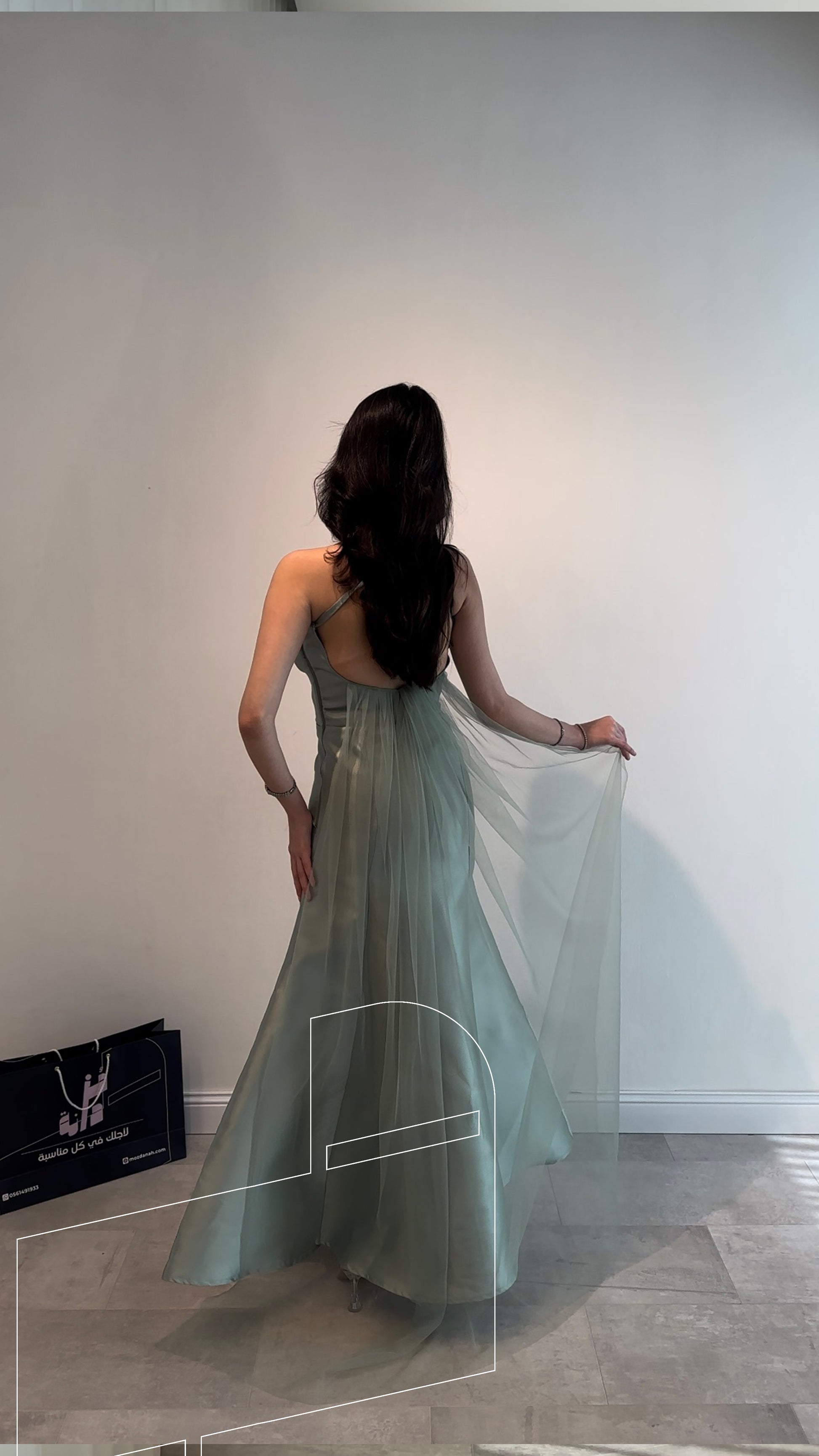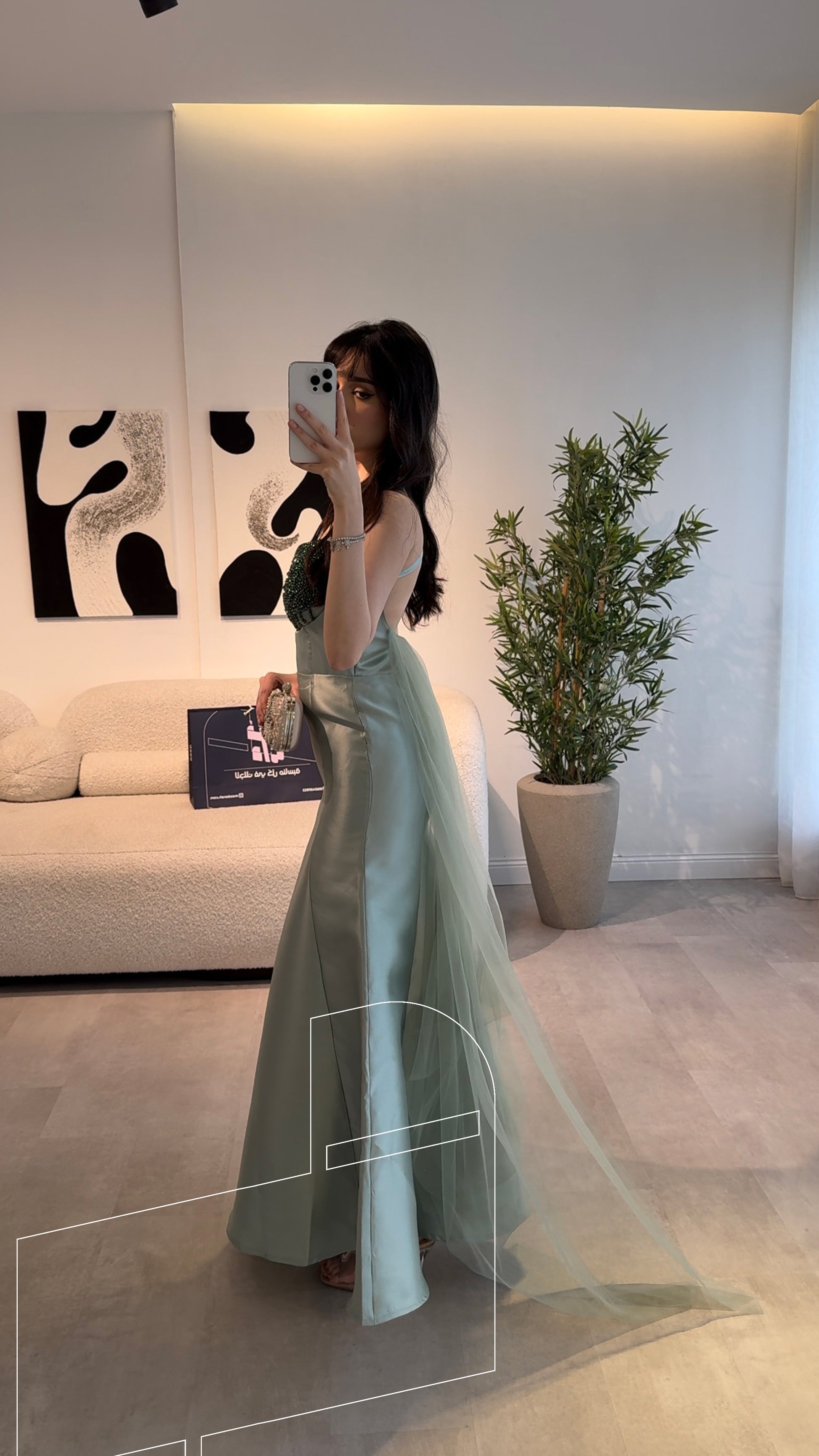فستان سهرة بلون الازرق التيفاني الساحر وكرستال براق بقصة تبرز جمال القوام وذيل طويل يضفي لمسة درامية راقية لإطلالة تخطف الأنظار يأتي بتطريز يدوي بالخيوط الفضية التي تجعل الفستان يلمع برقي تحت الاضواء ليمنحك اطلالة مميزة و جذابة