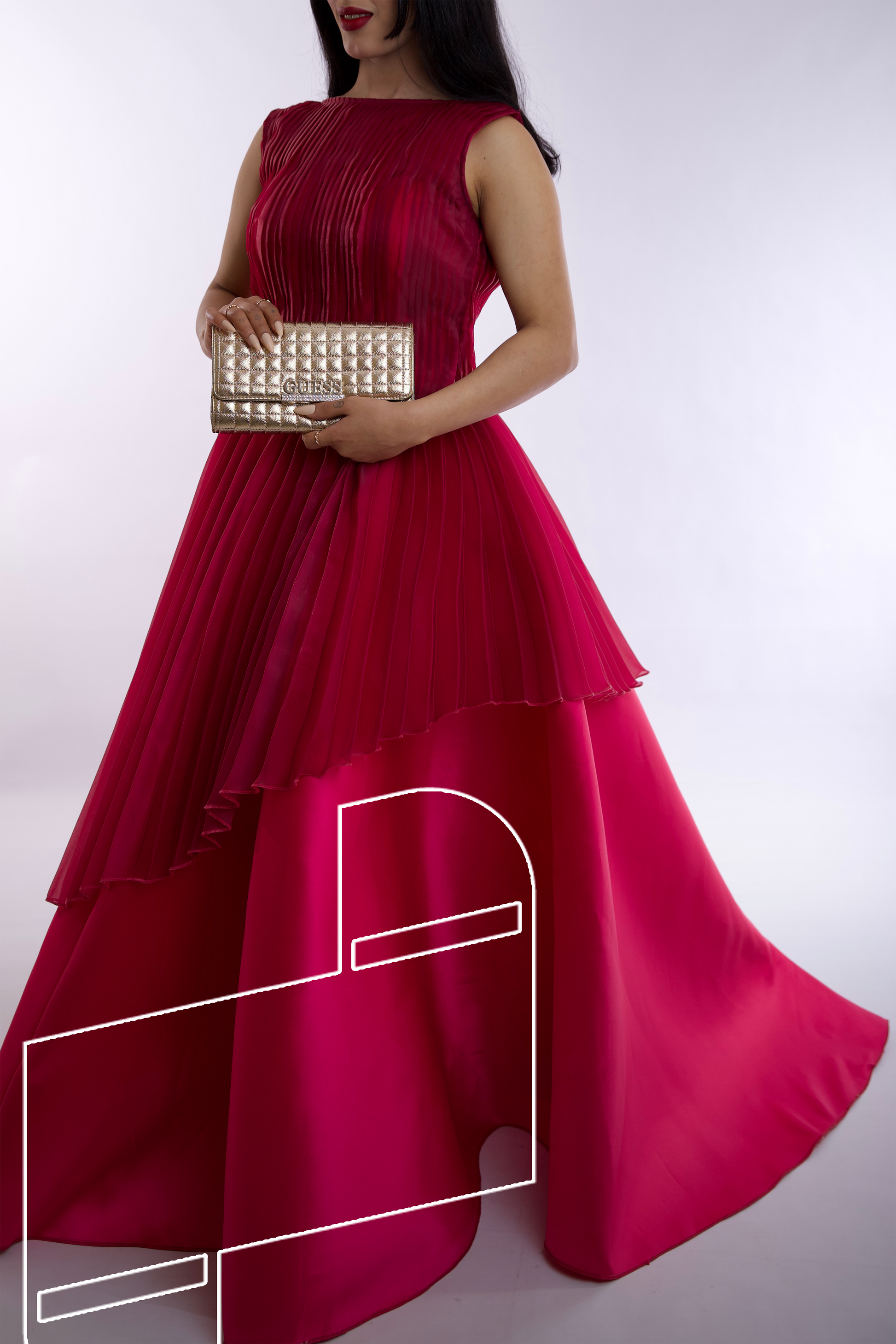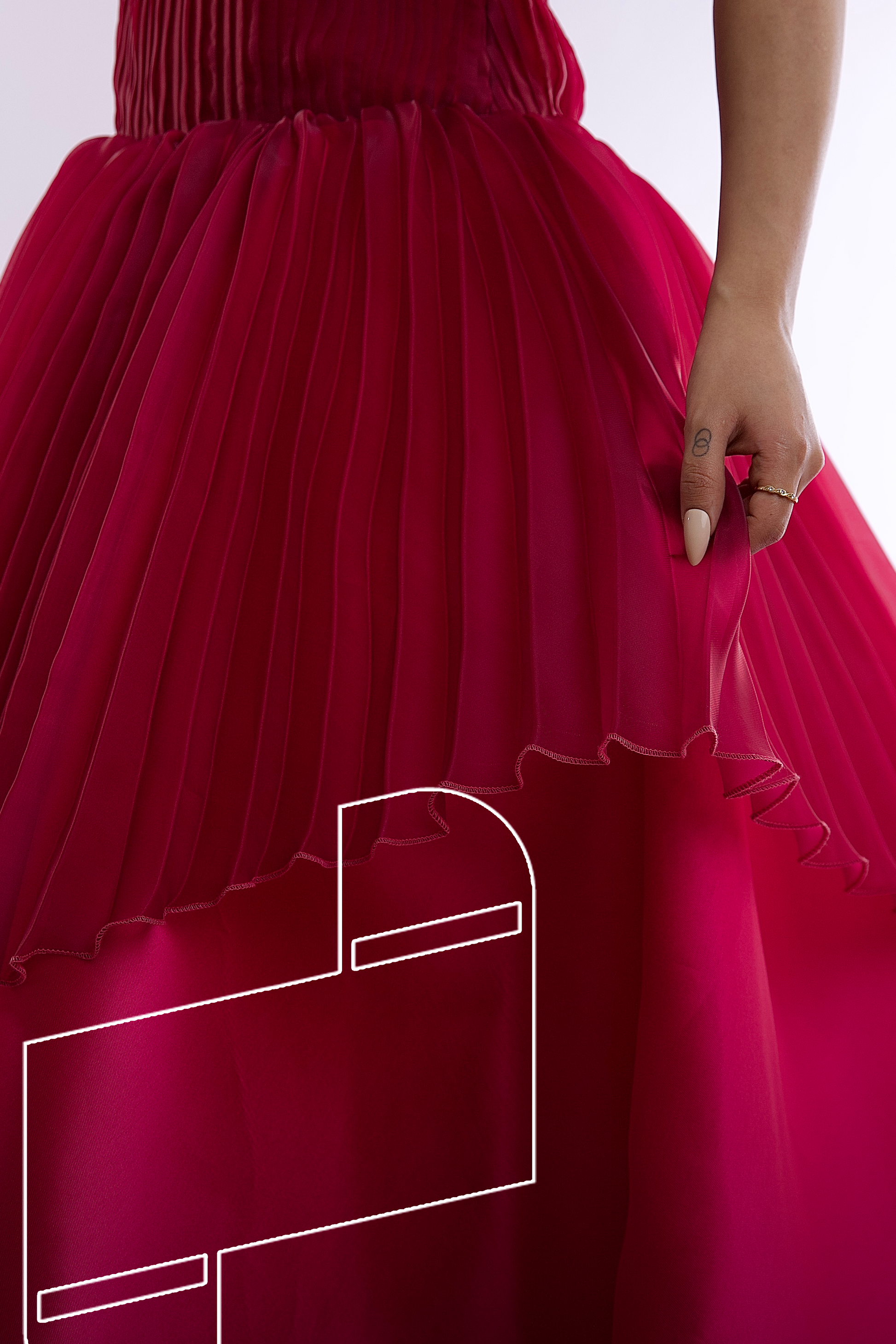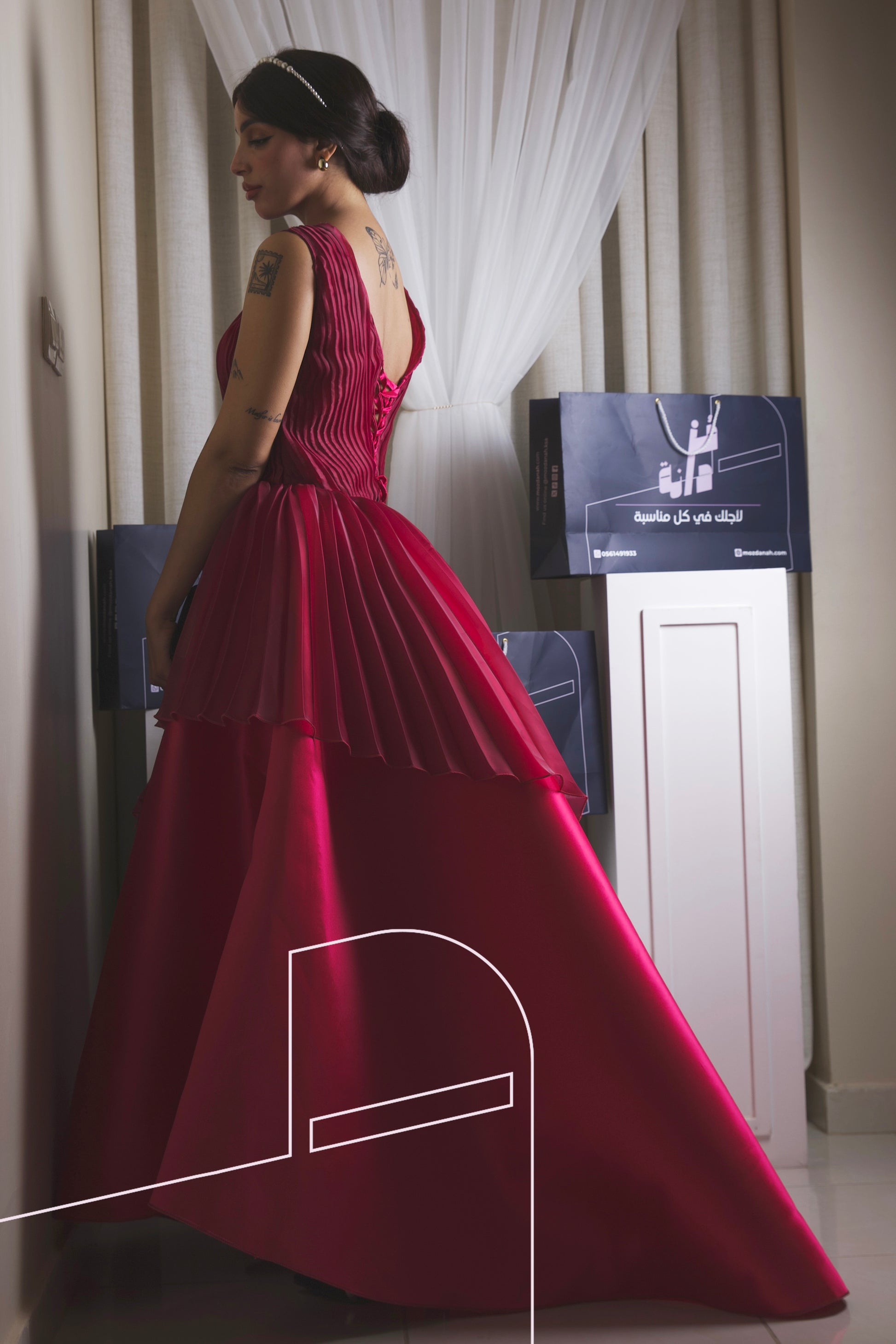 تصميم الفستان بخصر واسع يمنح إطلالة ملكية راقية، مع تداخلات من الكسرات الناعمة التي تضيف بعداً أنثوياً جذاباً.