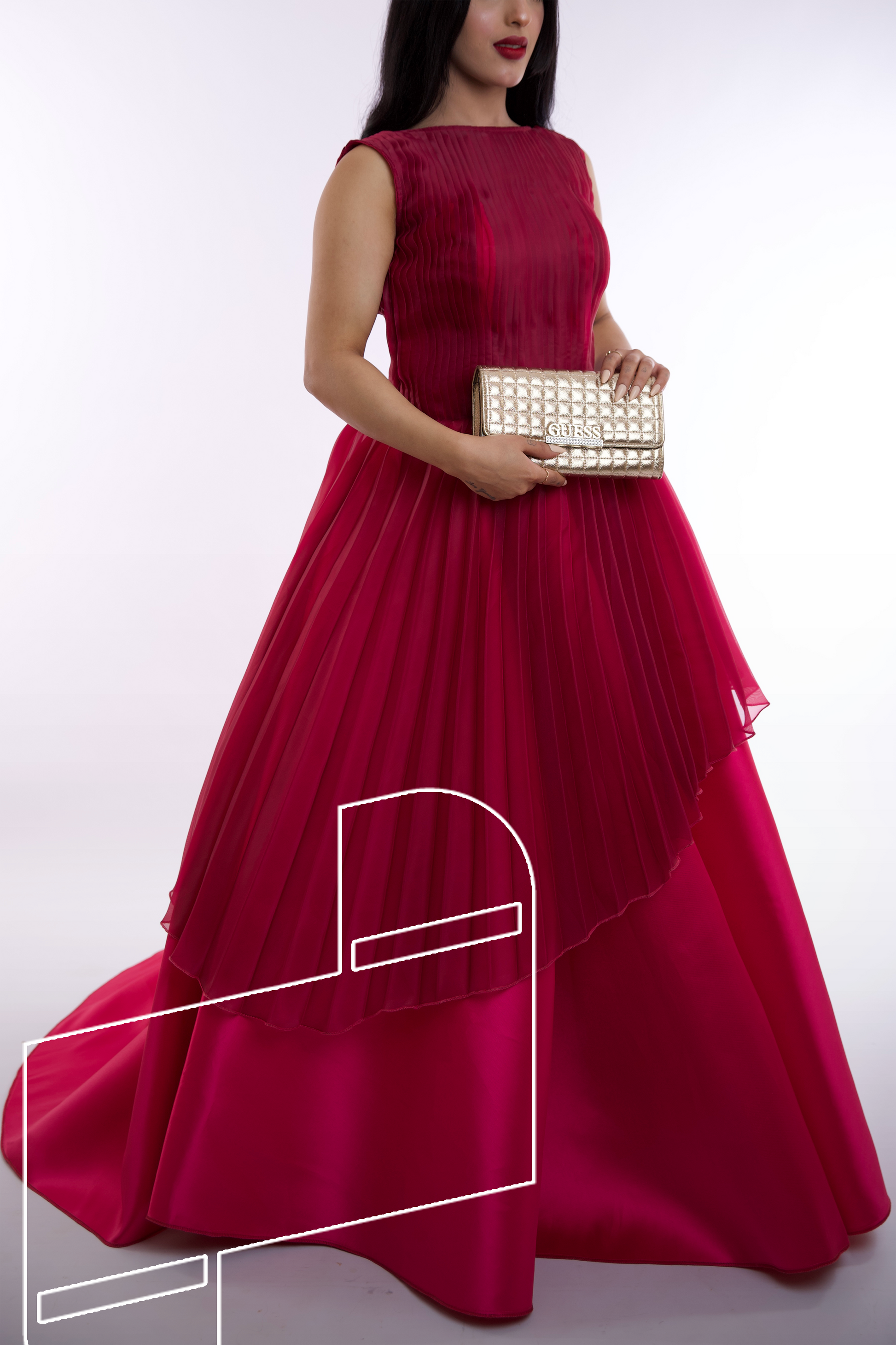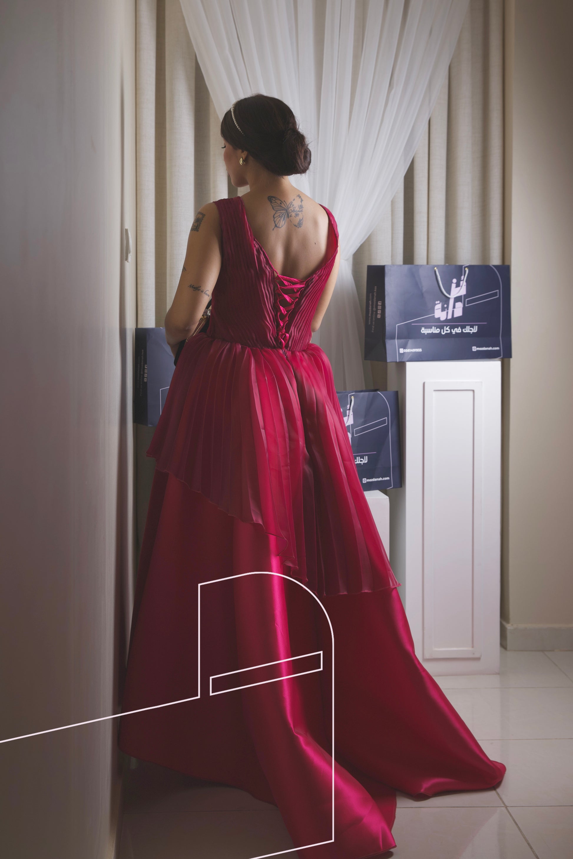 الفستان يتميز بتصميم فخم يجمع بين الأناقة والفخامة بلون فوشيا جريء وجذاب