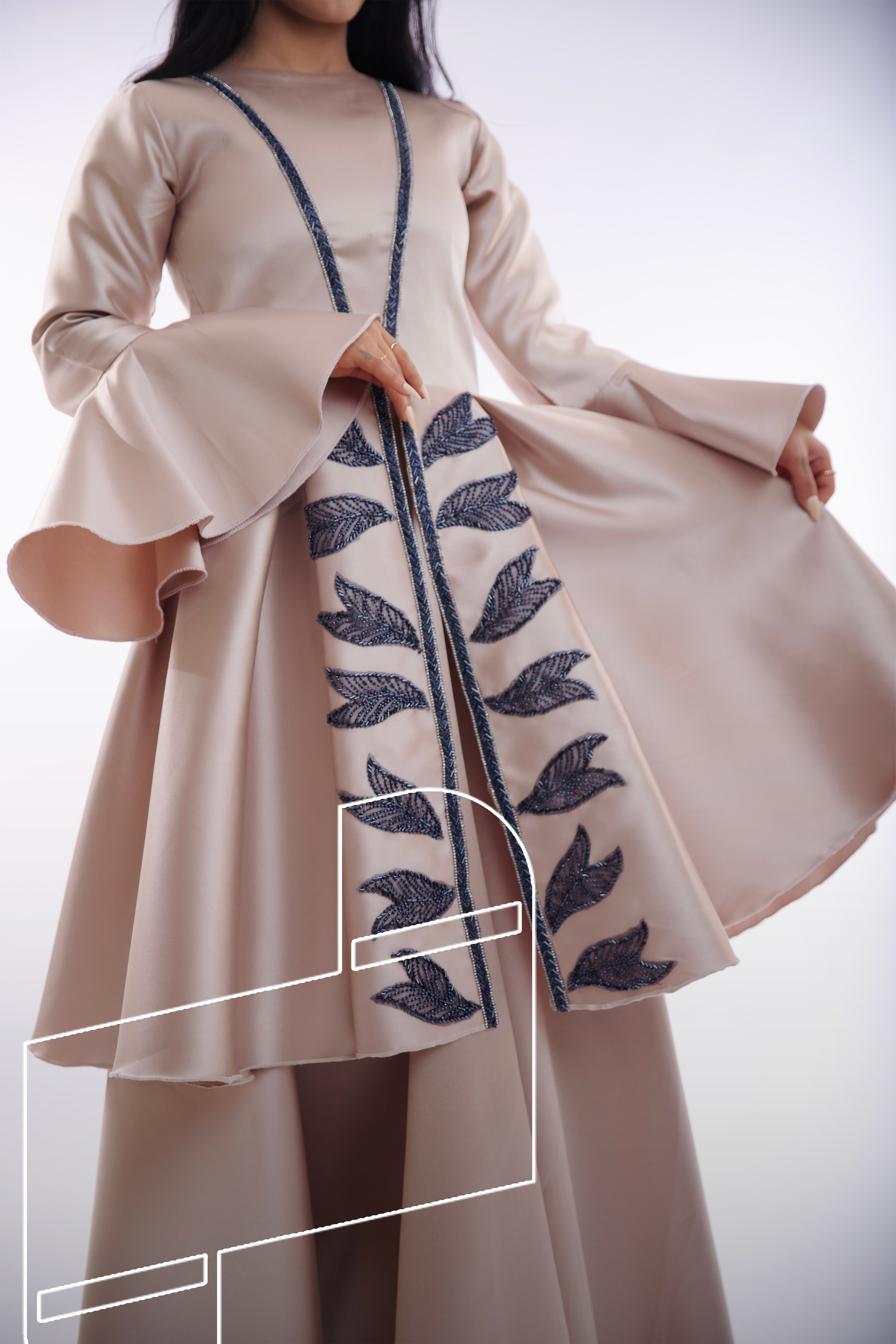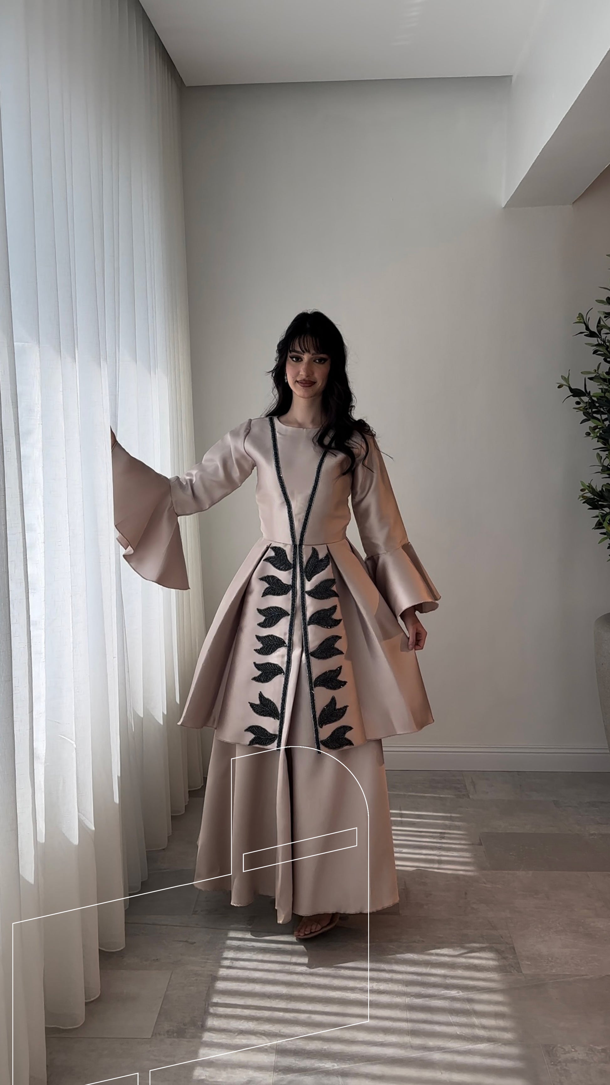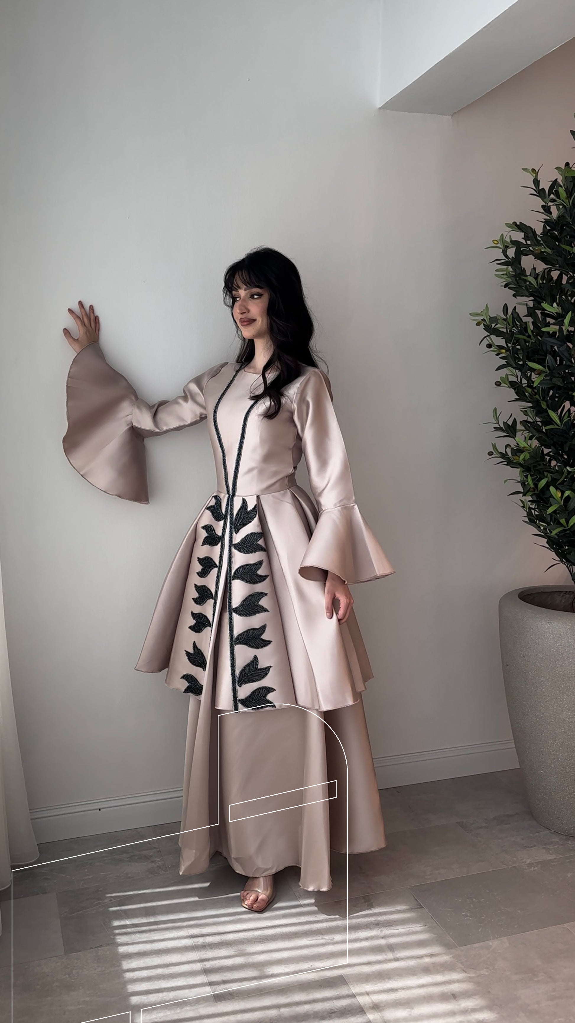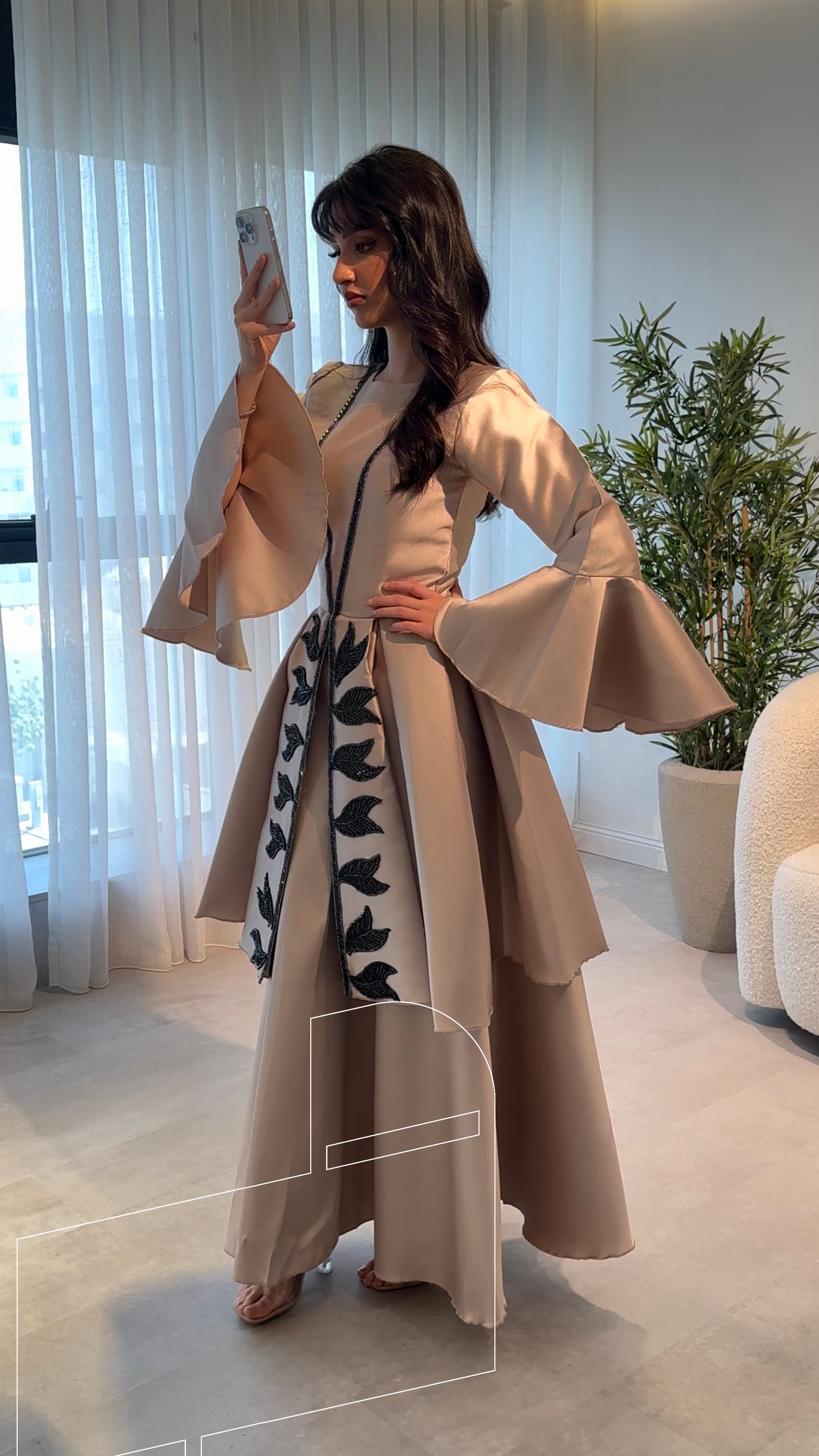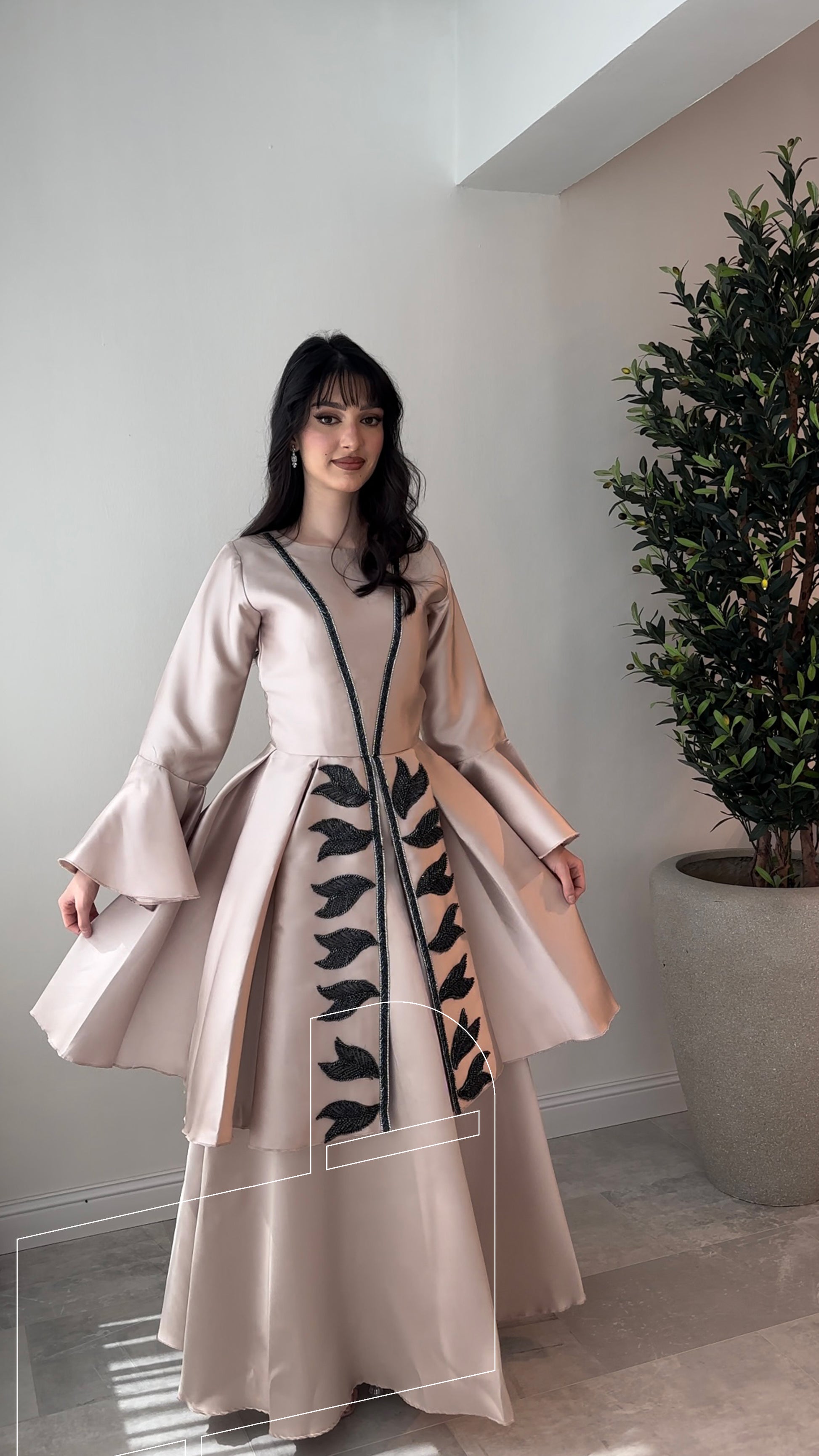 فستان بلونه البيج الناعم يفيض بالأناقة والرقي، مصنوع من قماش انسيابي ينسدل بنعومة على القوام، ليمنح إطلالة أنثوية ساحرة. يتميز بتطريز فاخر بكريستالات كحليّة لامعة، موزّعة بتناغم على منطقة الخصر، تمتد بخطوط أنيقة على الصدر ، لتمنح لمسة فخامة وجاذبية لافتة.