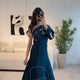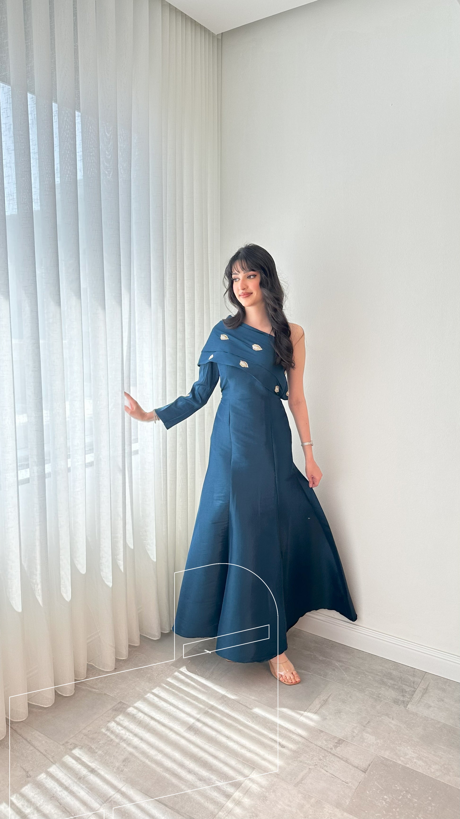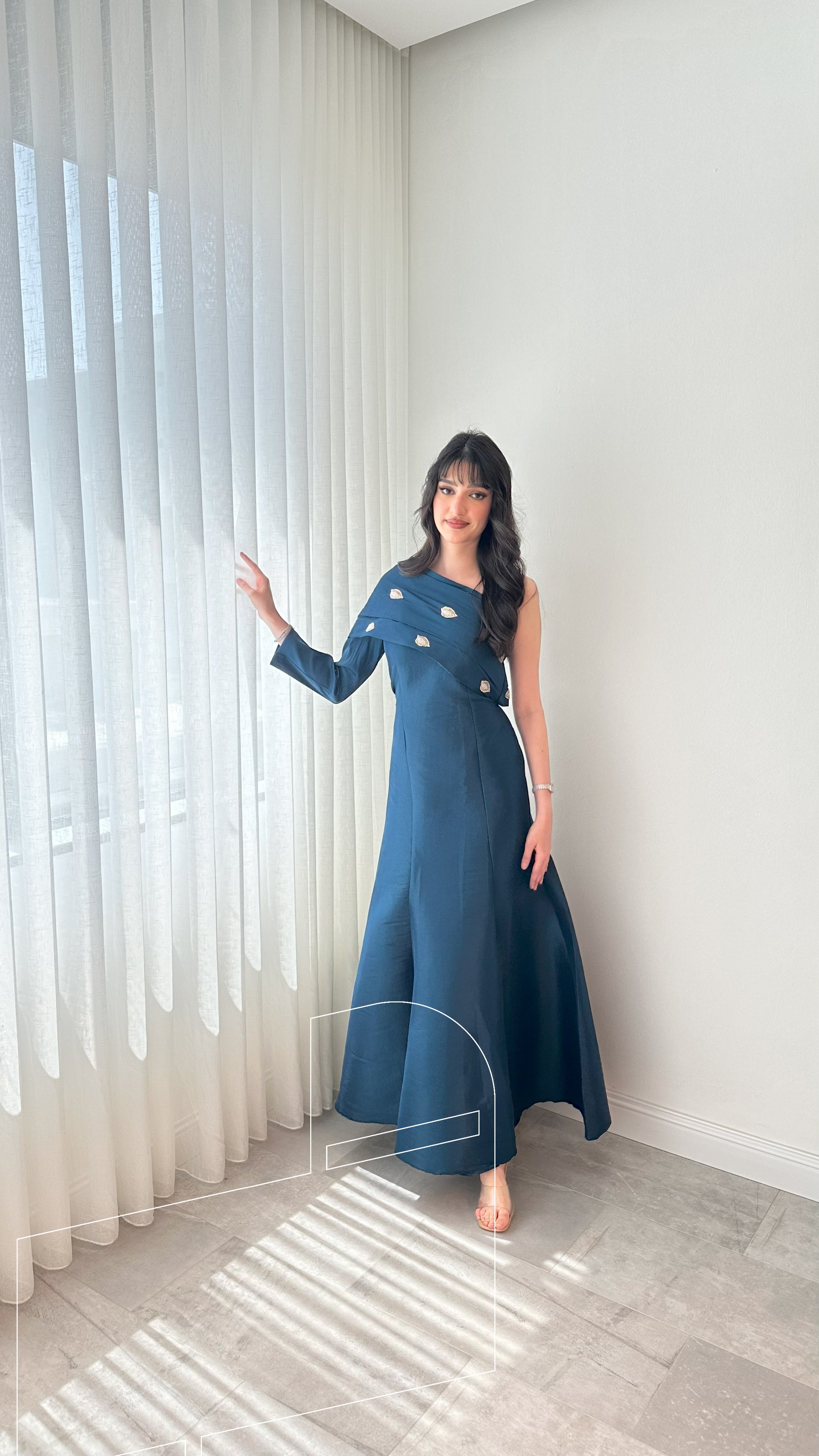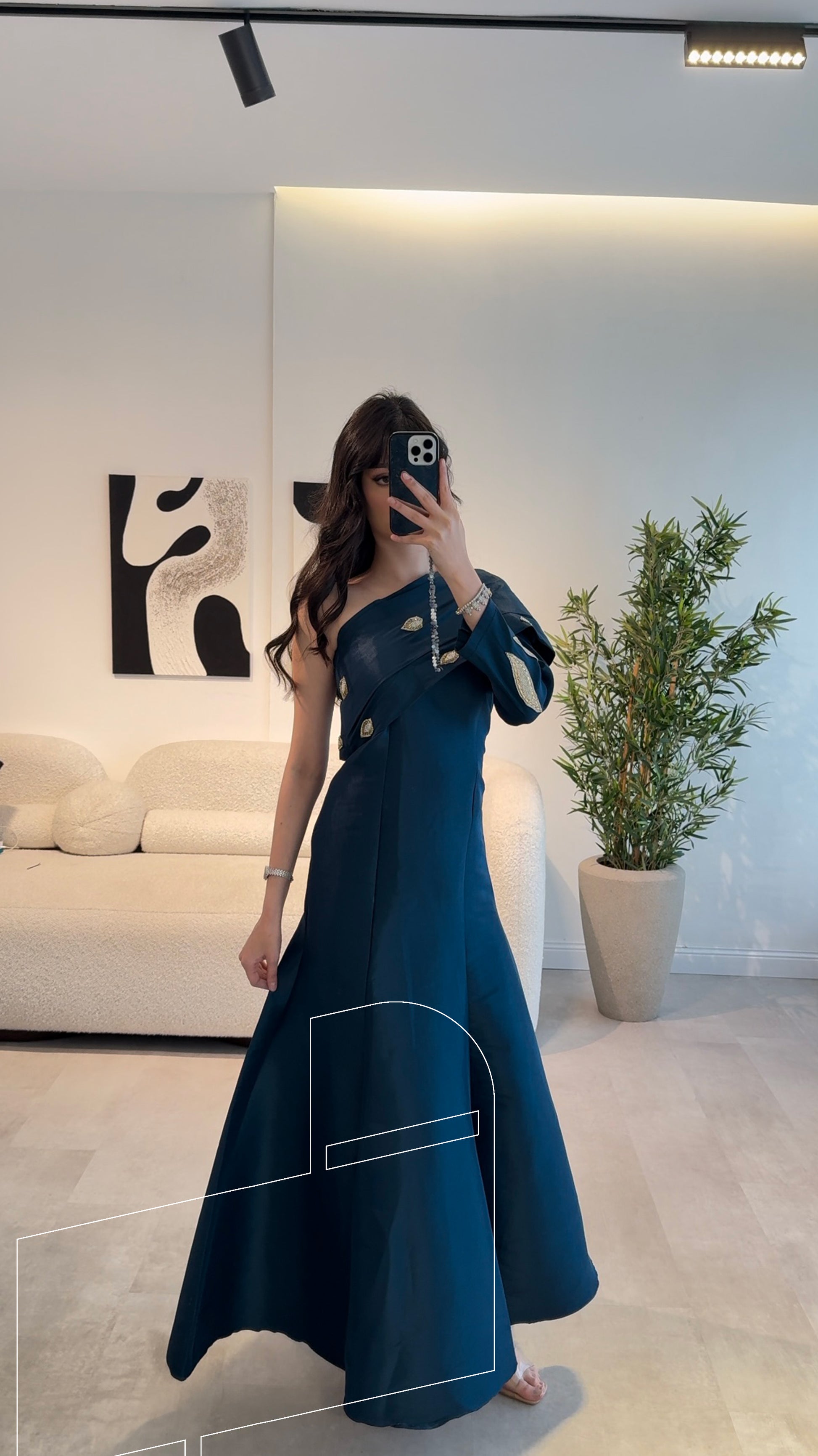 فستان أزرق لامع يفيض فخامة وأناقة، مصمم بقصة انسيابية تُبرز القوام بأنوثة راقية. يأتي قماش الفستان بلون أزرق ملكي ميتاليك، يتلألأ تحت الضوء بإشراقة ساحرة، وكأنّه قطعة من السماء المرصعة بالنجوم.