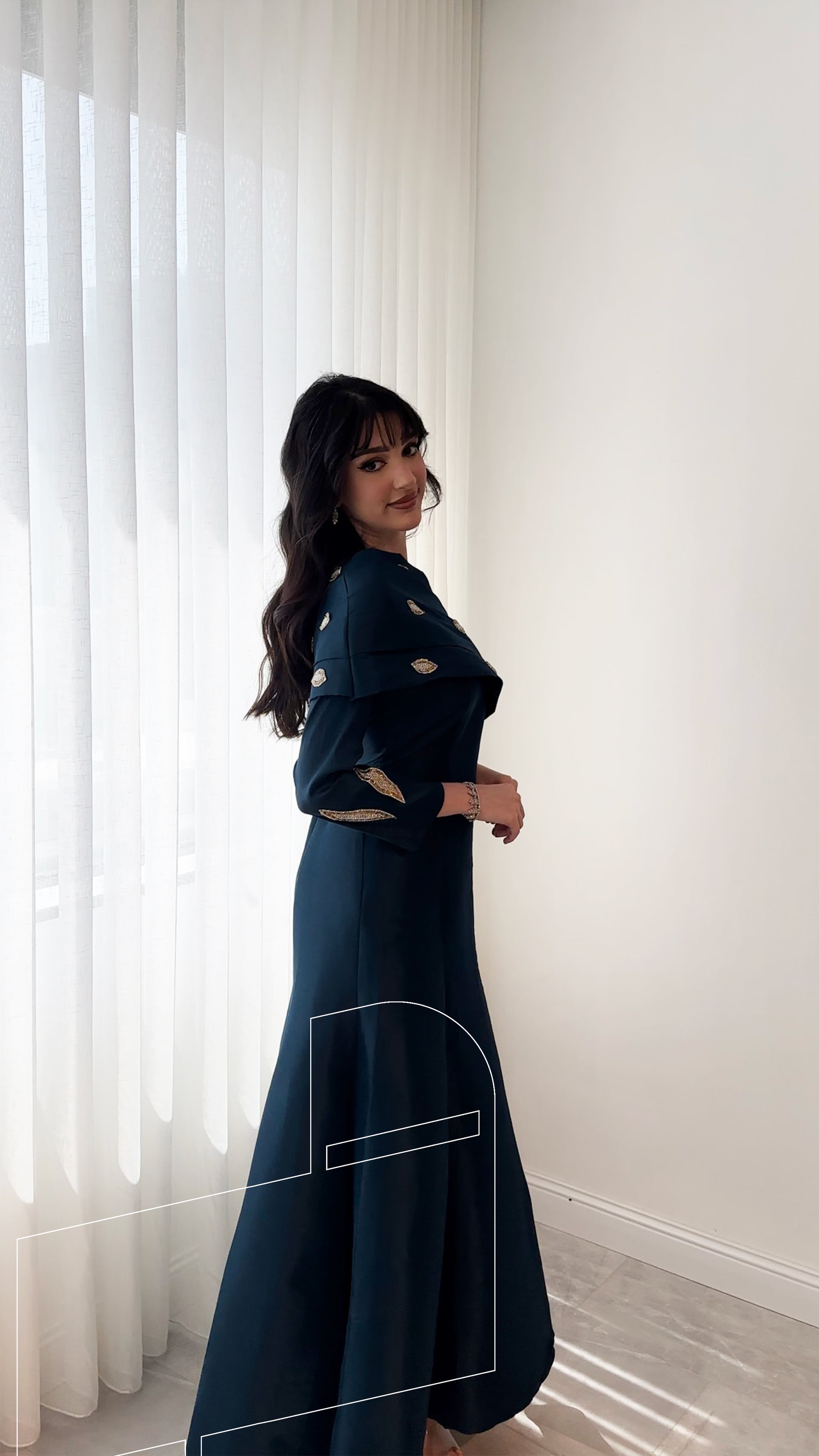 يتميز الصدر والتفاصيل على الأكمام بتطريز فاخر من الكريستال الذهبي، مصمم بدقة فنية تضيف لمسة ملوكية. الكريستال الذهبي مرصوف بأسلوب متناغم يُشبه زخارف شرقية فخمة، مما يمنح الفستان إشراقة دافئة تُكمل لمعان الأزرق ببراعة