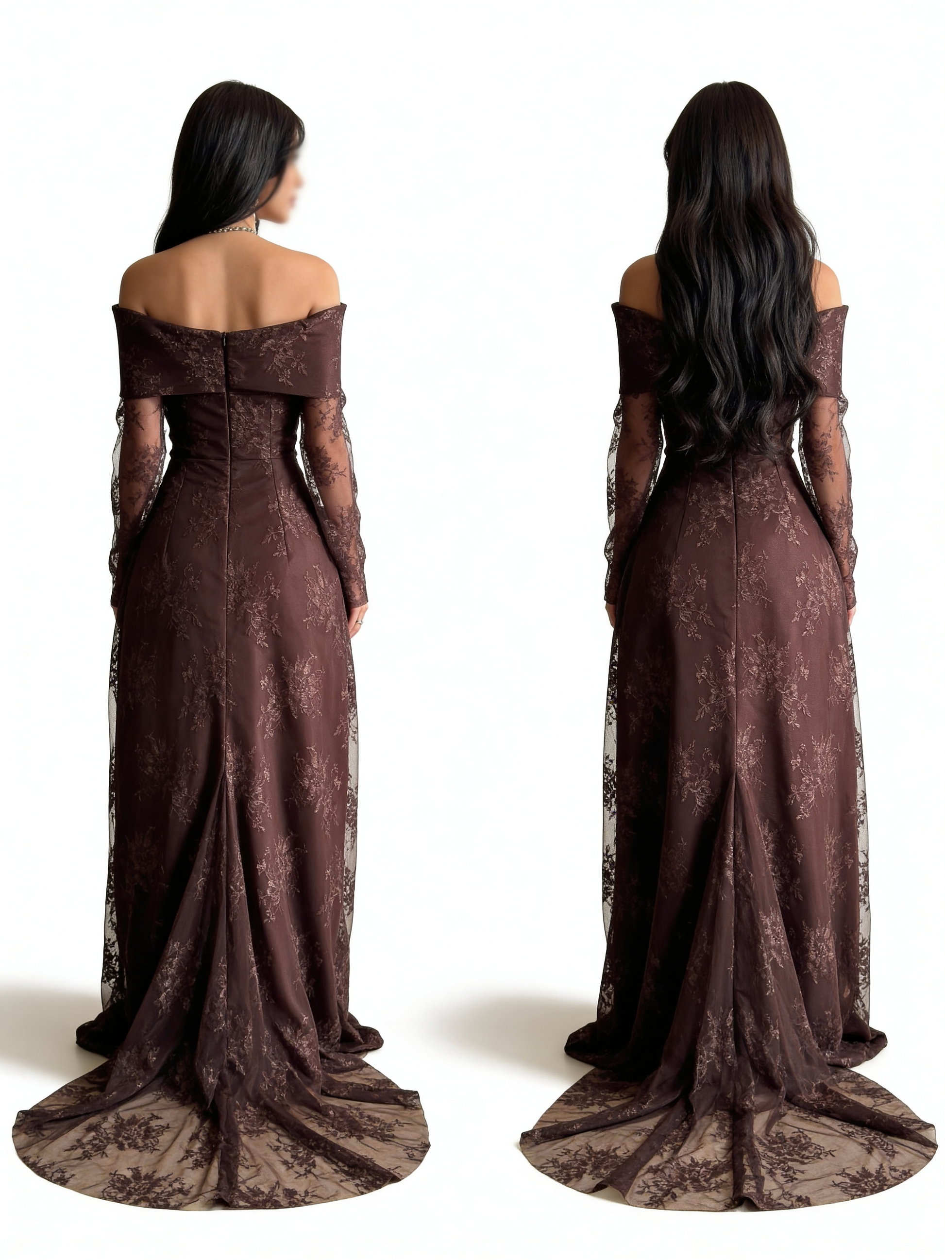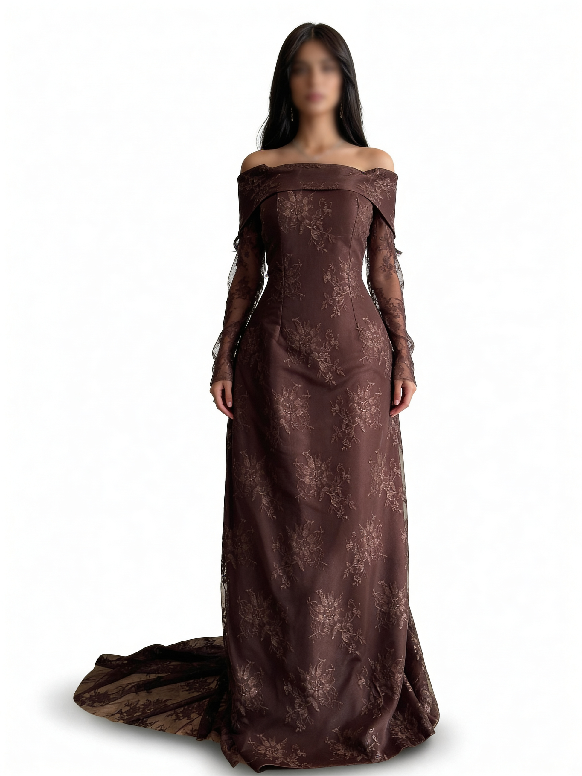 - *تصميم عصري:* يأتي الفستان بتصميم عاري الأكتاف مع أكمام طويلة، مما يمنحك لمسة من الأنوثة والجاذبية.