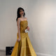 فستان أصفر ذهبي فاخر بتصميم ملكي يخطف الأنظار، مصنوع من قماش التفتة الفخم الذي يعكس الضوء برقي ويمنح الفستان مظهراً ساحراً. يتميز بلونه المشرق الذي يضفي إشراقة ذهبية راقية تناسب المناسبات الفخمة.