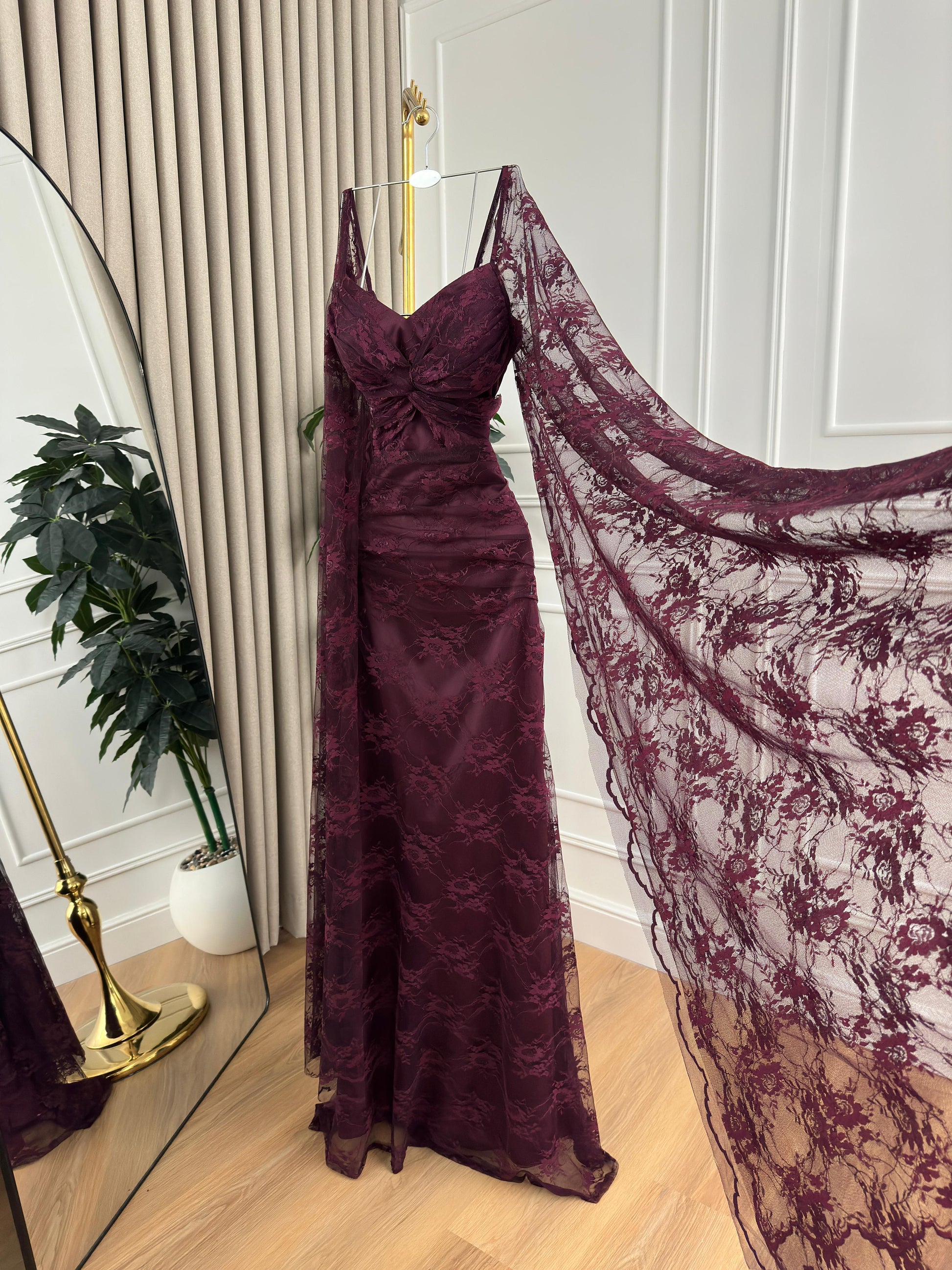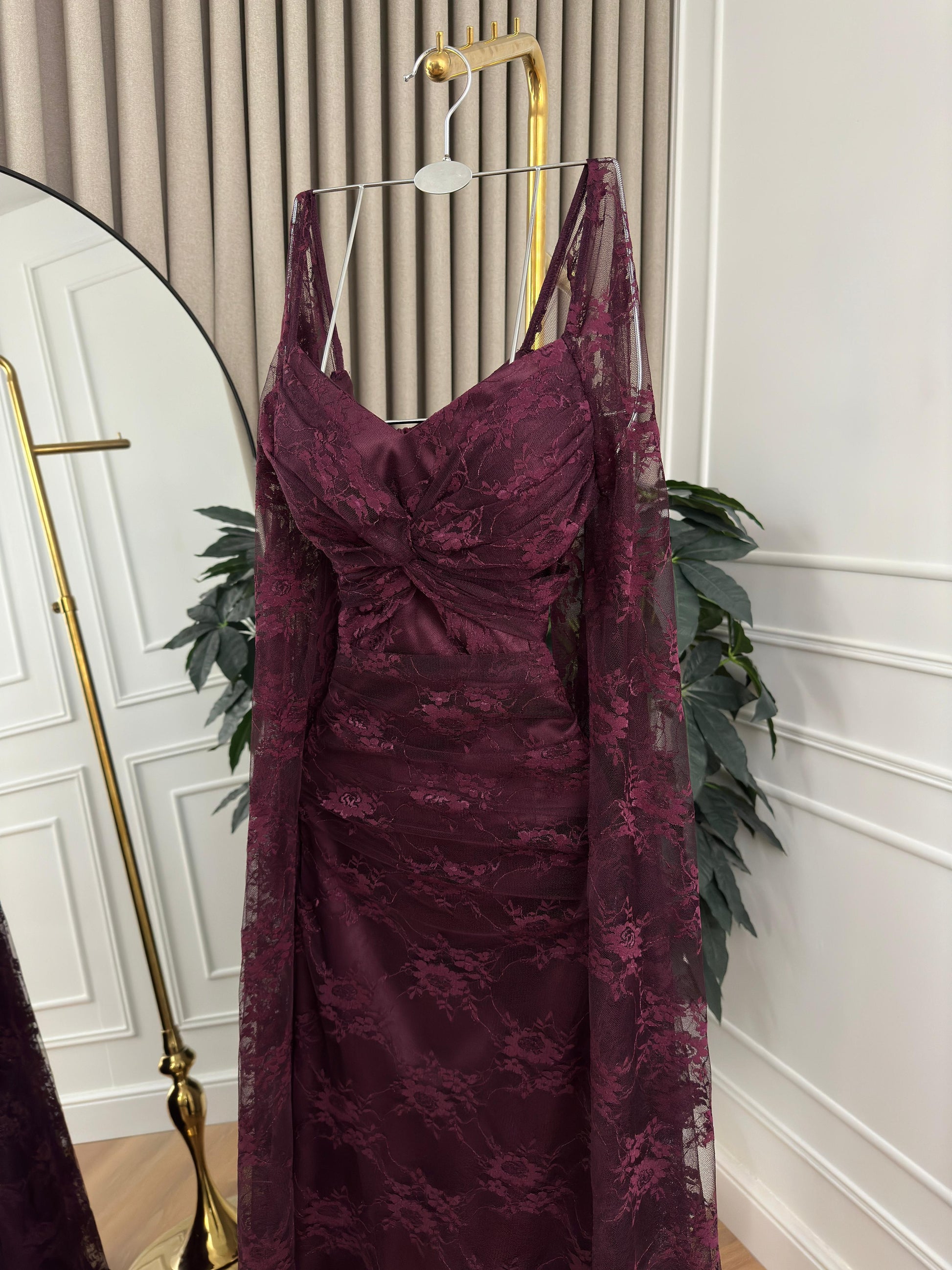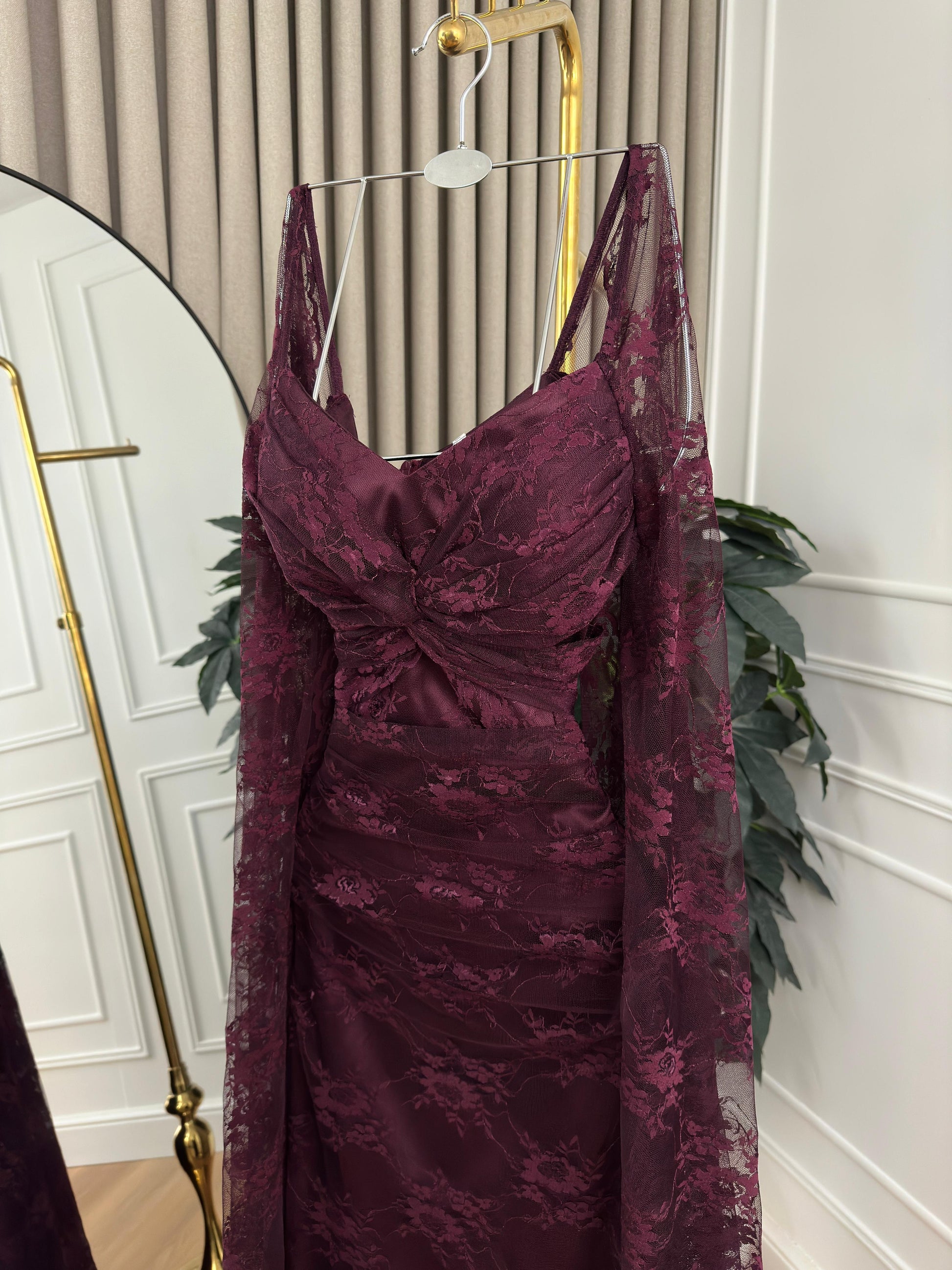 **فستان سهرة فخم بلون بورجوندي مع تفاصيل دانتيل**