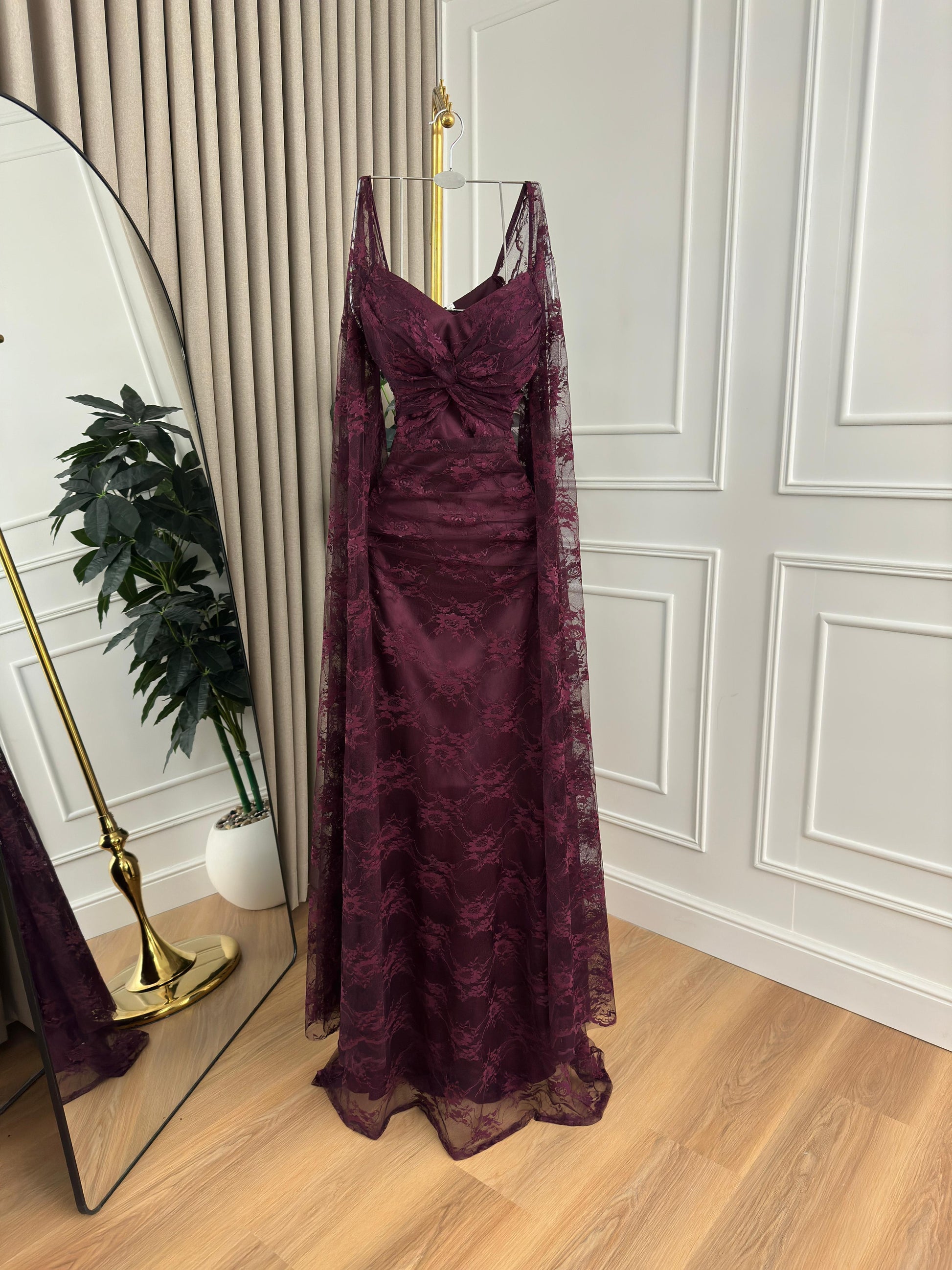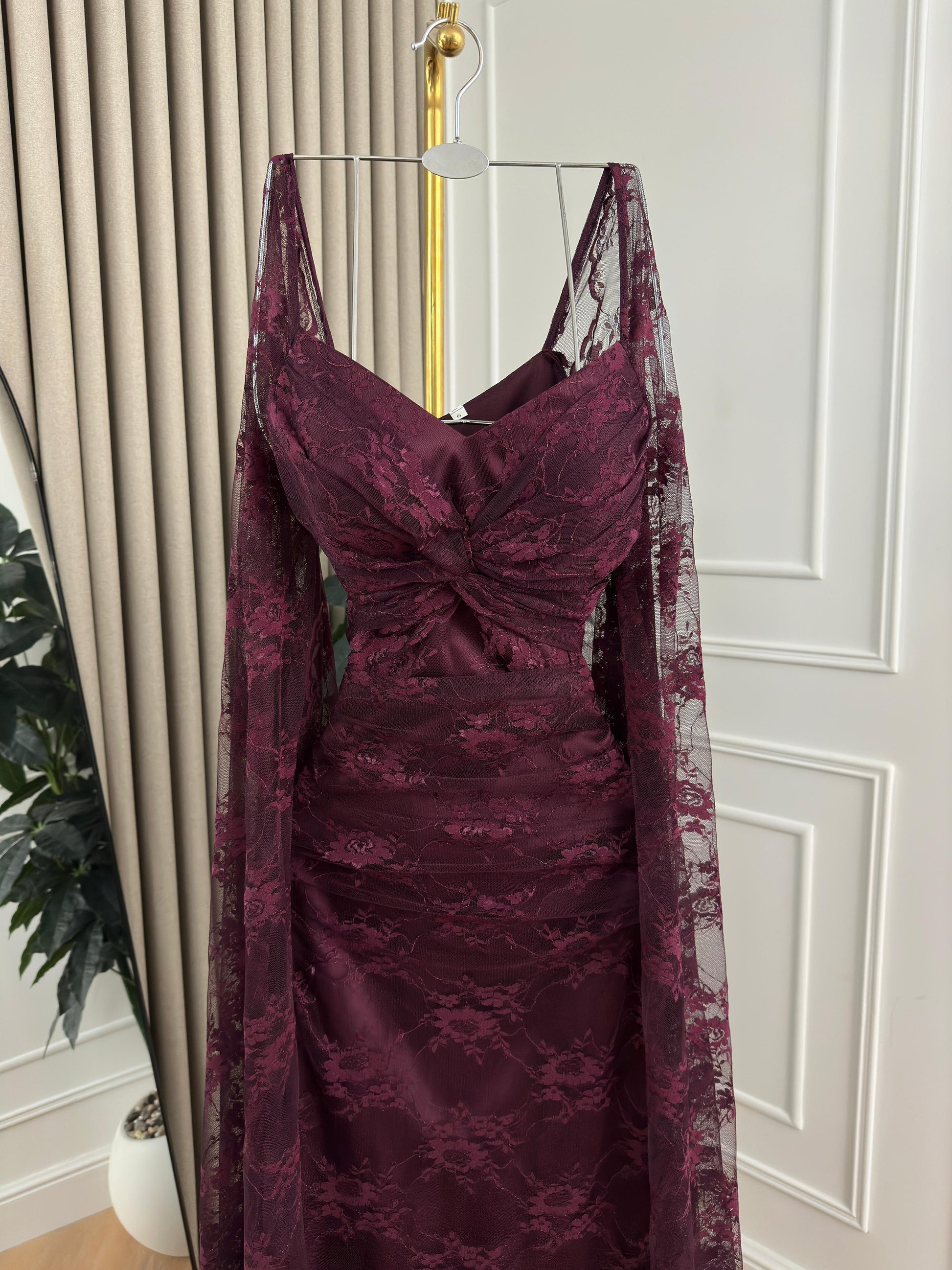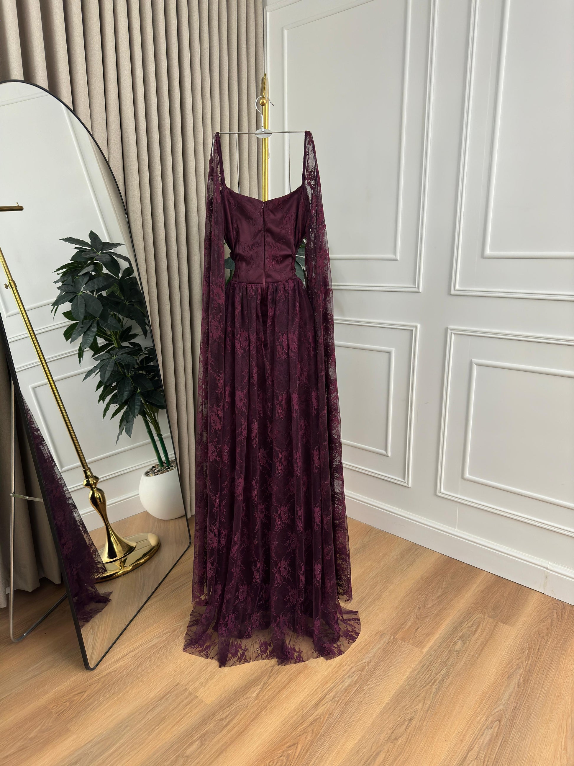 **فستان سهرة فخم بلون بورجوندي مع تفاصيل دانتيل**