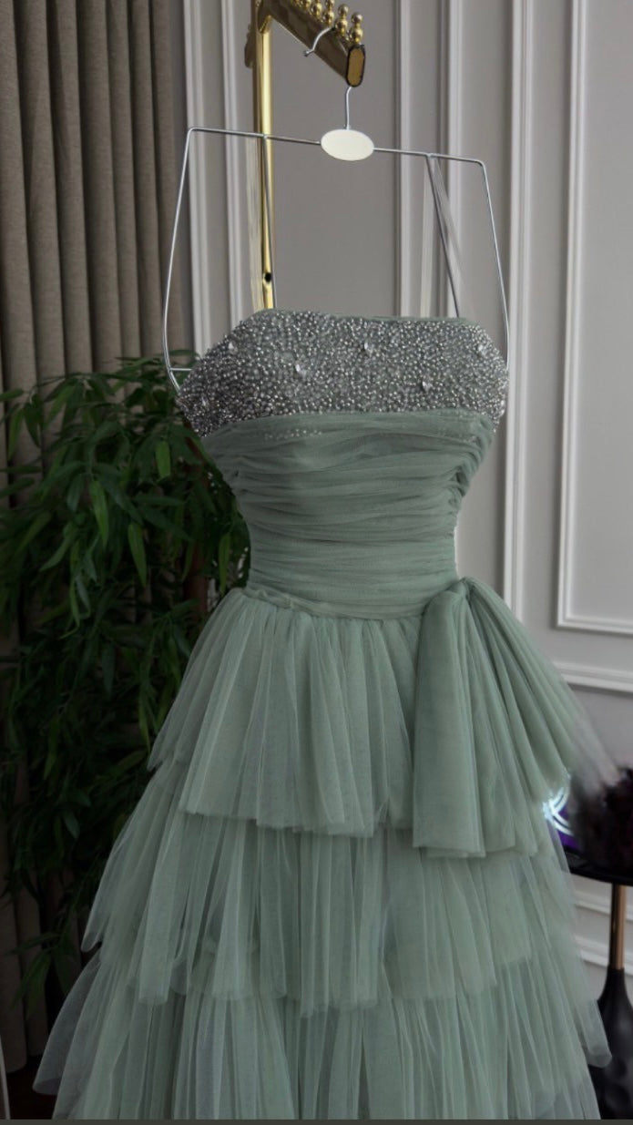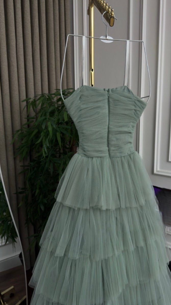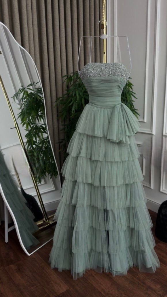 - *لون مميز:* يأتي الفستان بلون أخضر فاتح يضفي إشراقة خاصة ويجعله خيارًا مثاليًا لمناسباتك الخاصة، سواء كانت حفلات زفاف، أو سهرات، أو مناسبات رسمية.
