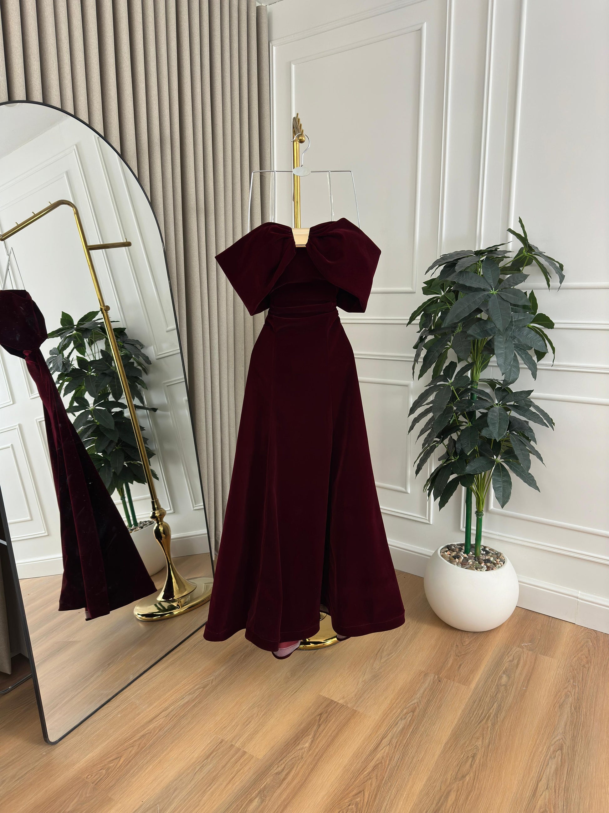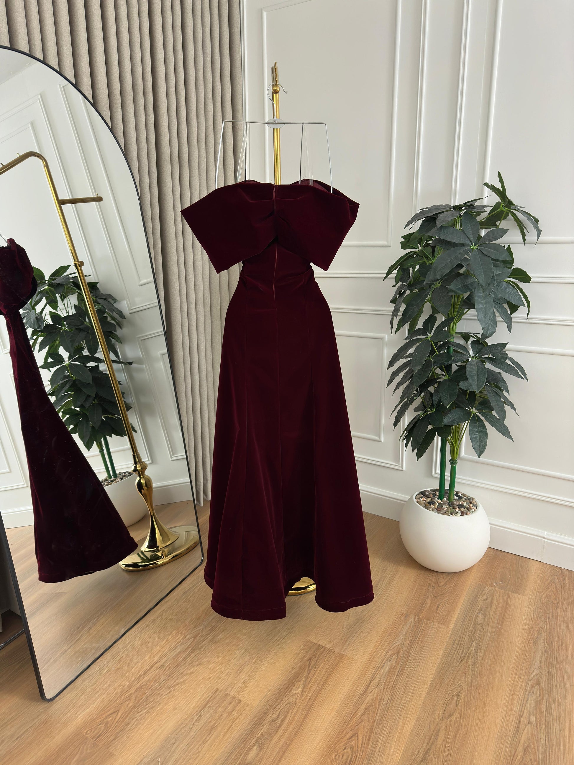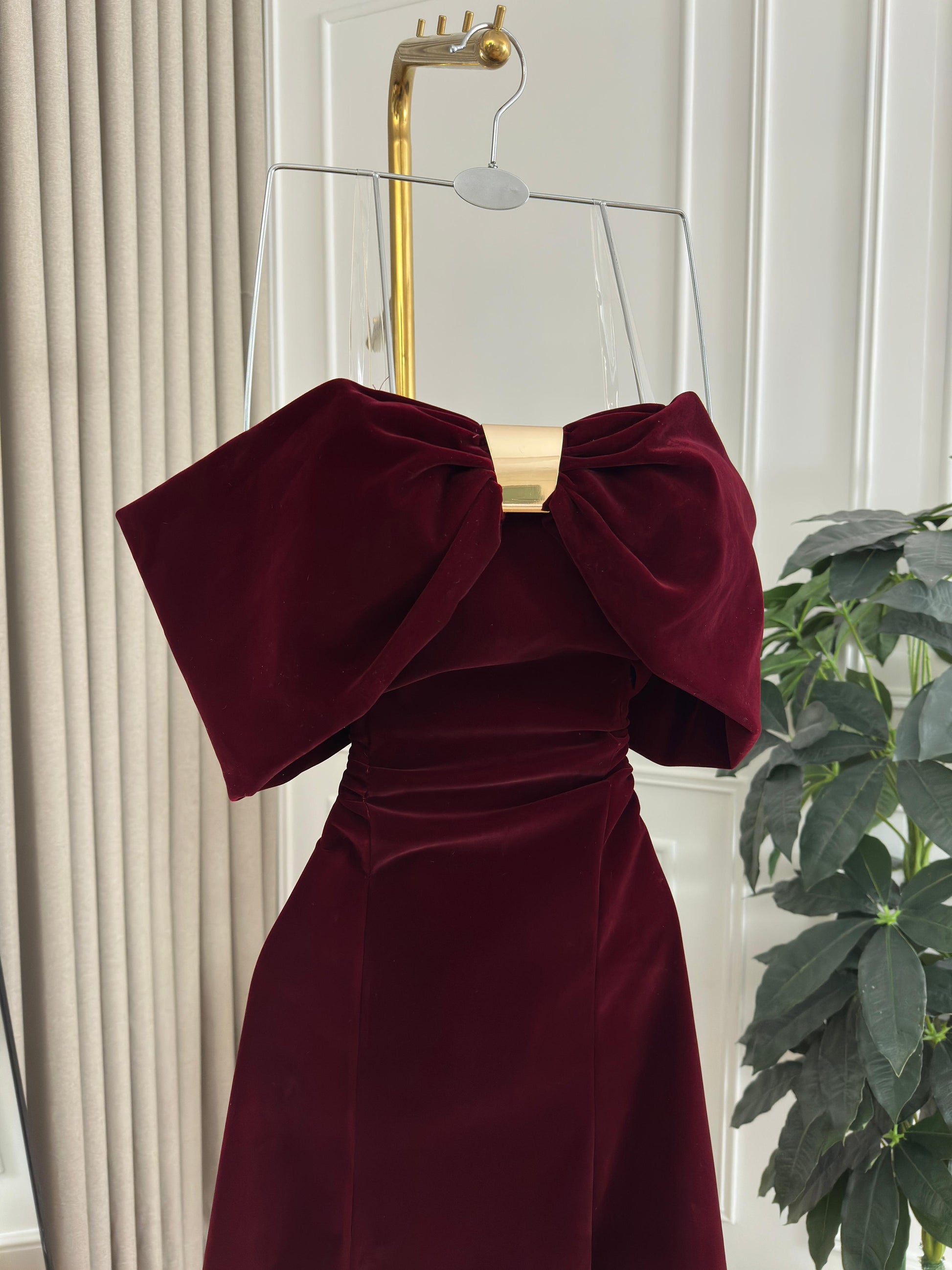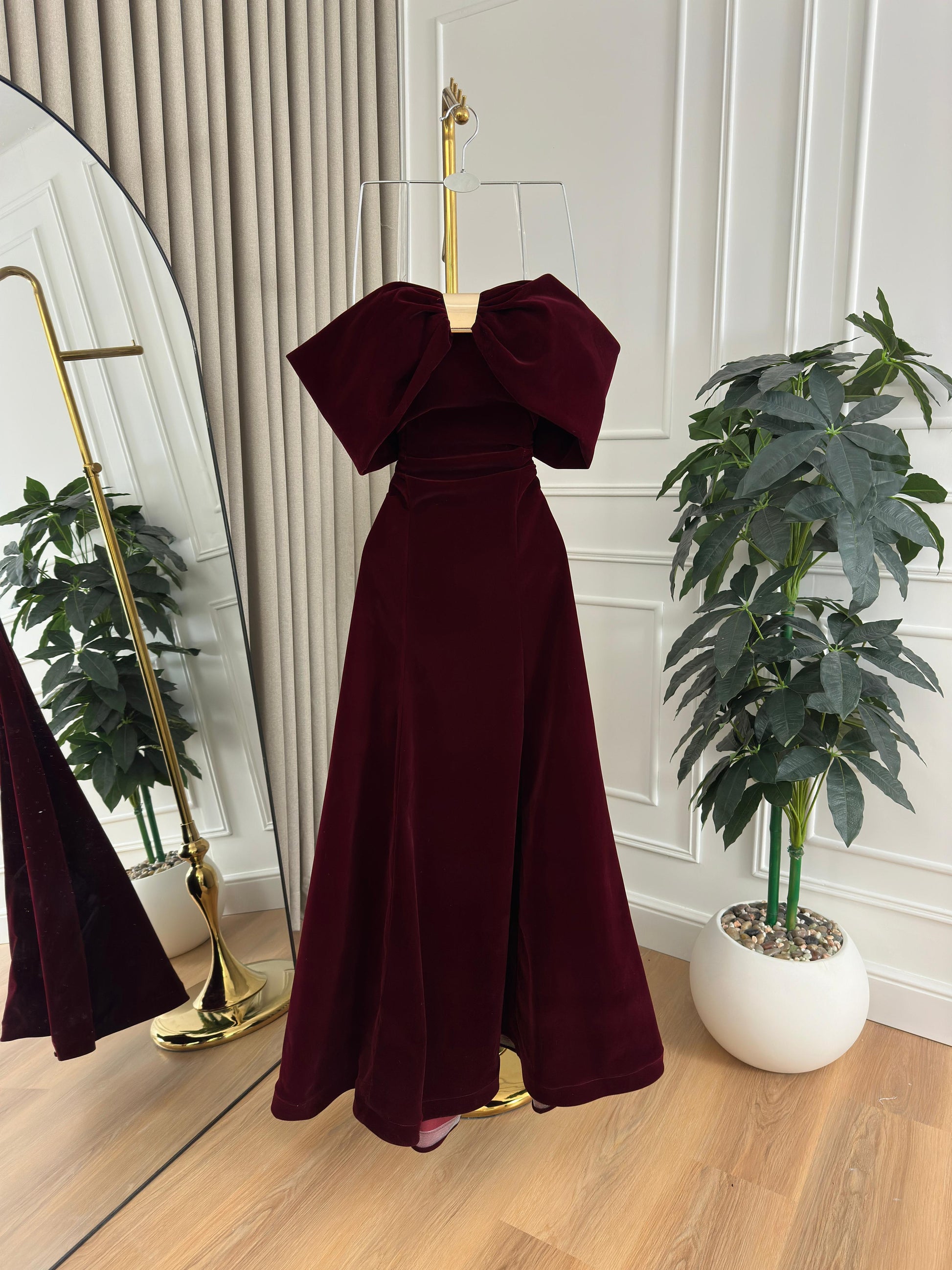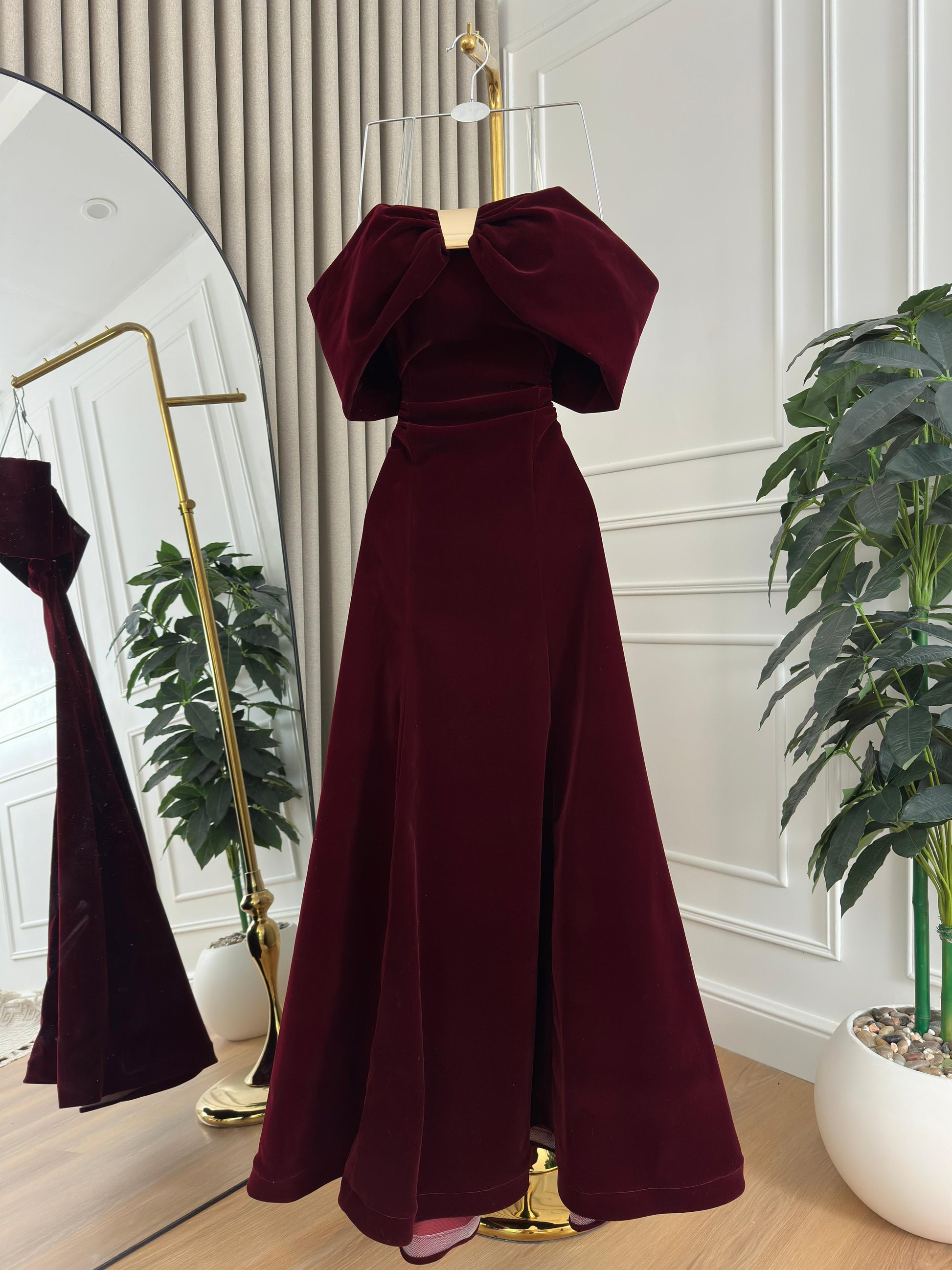 **فستان سهرة أنيق بلون بورجوندي مع تفاصيل عصرية**