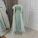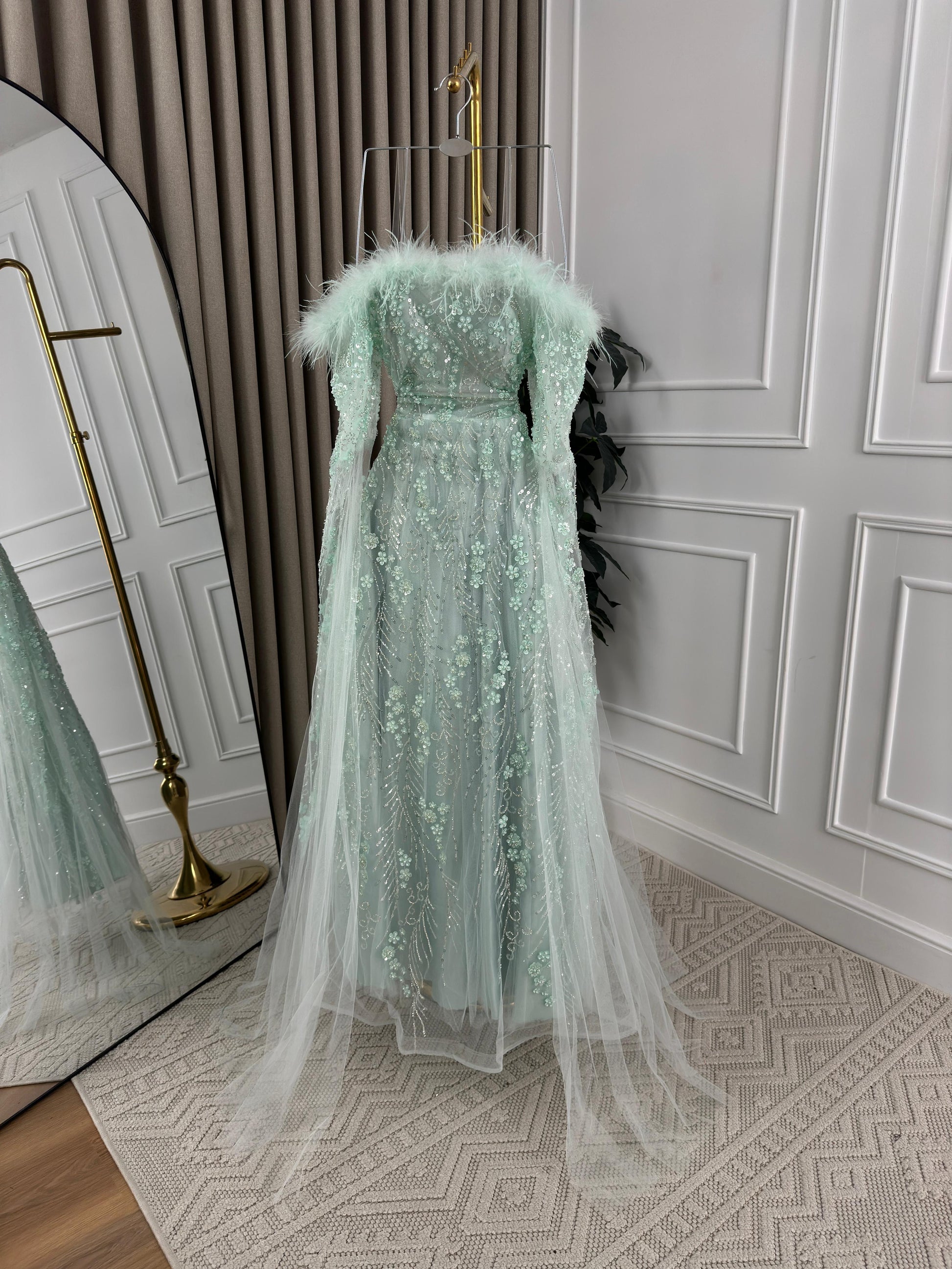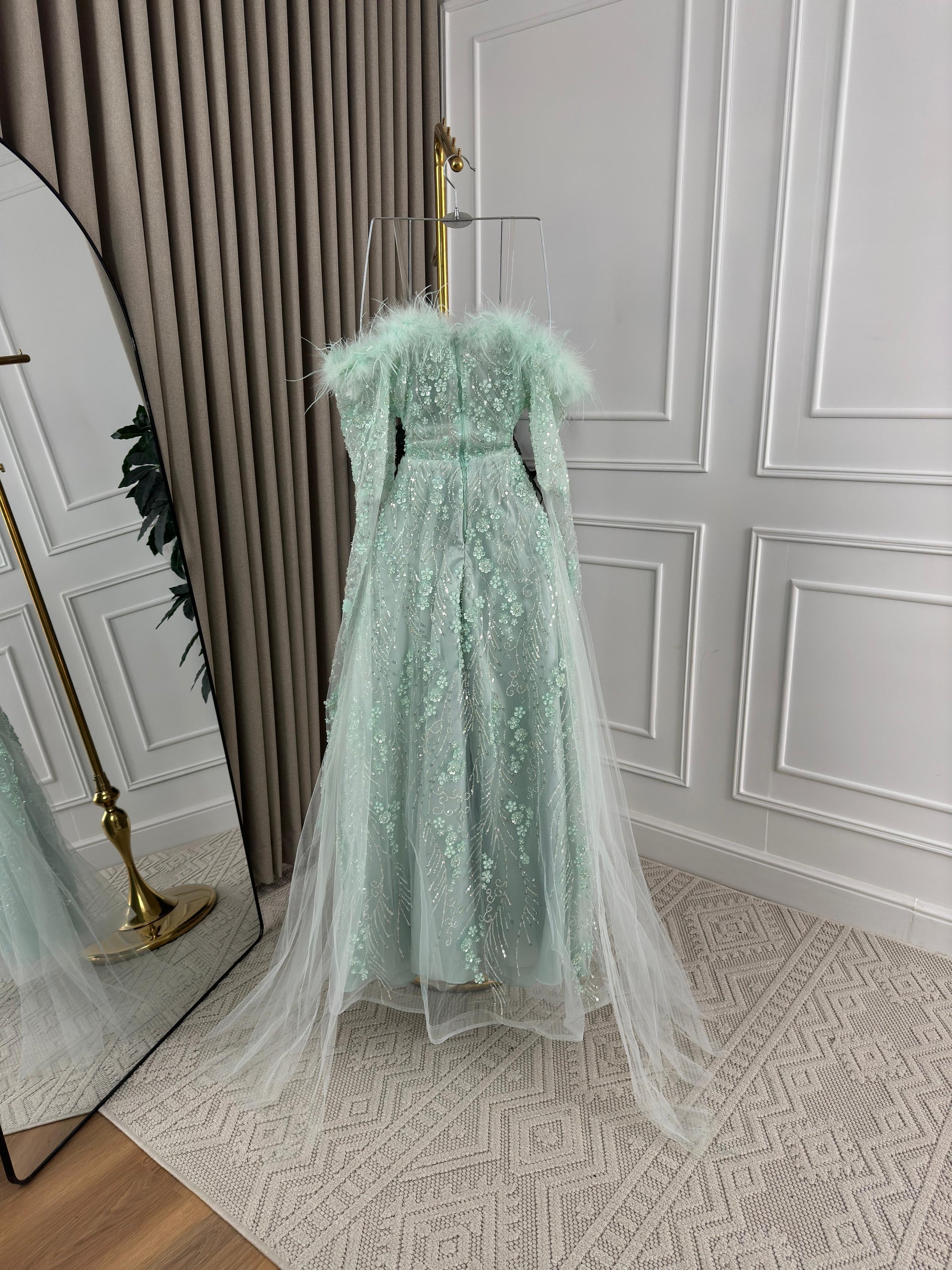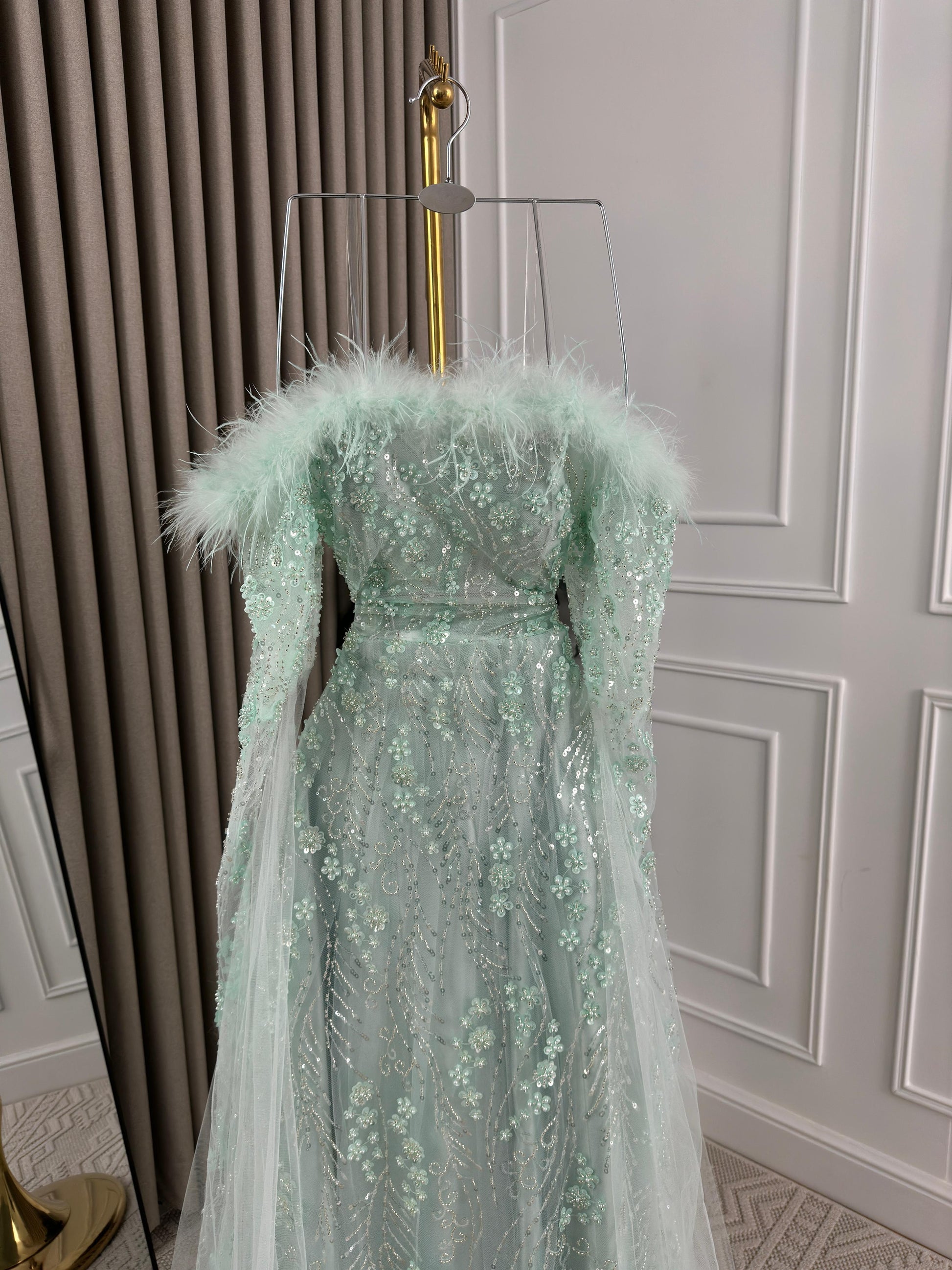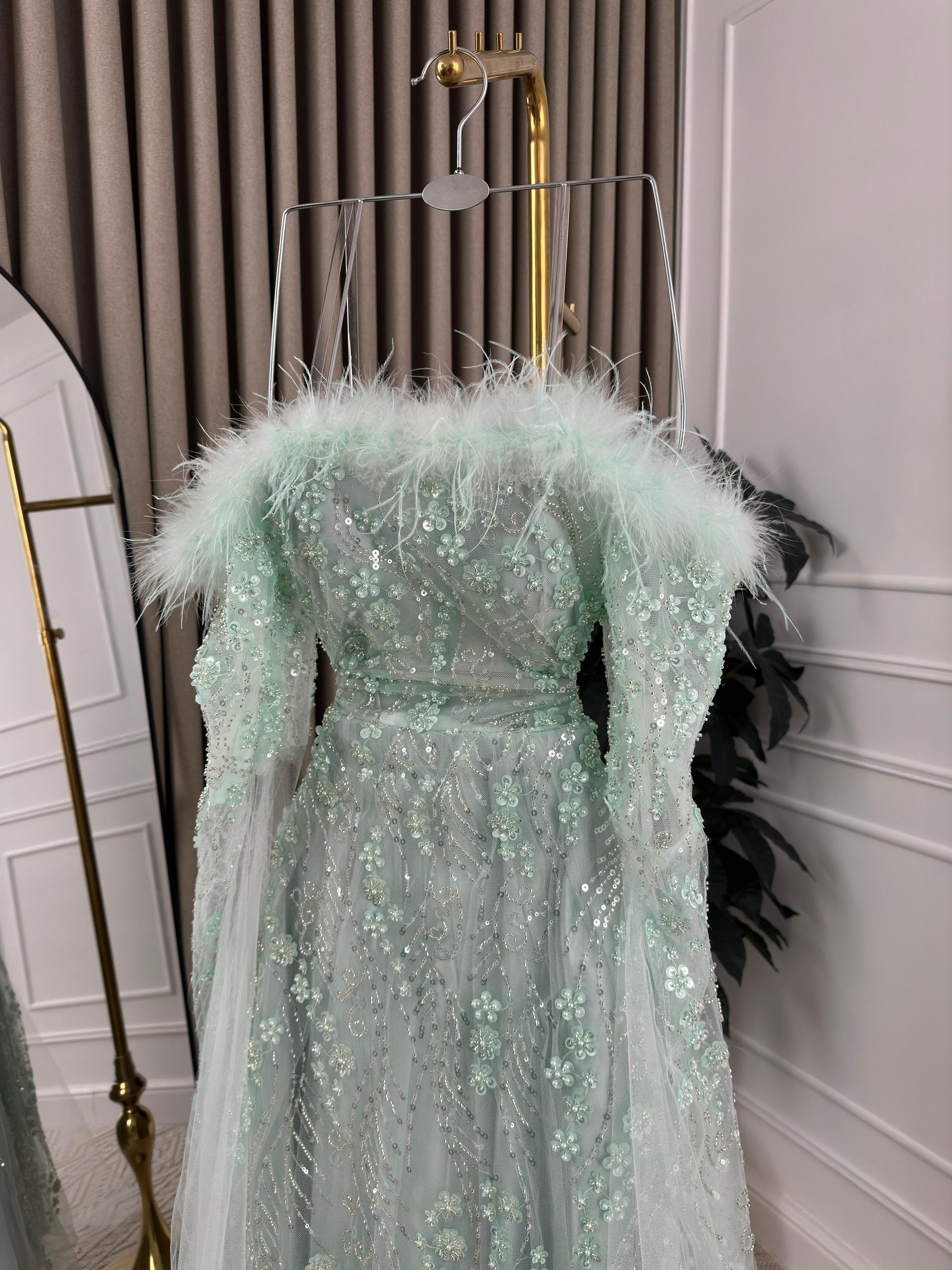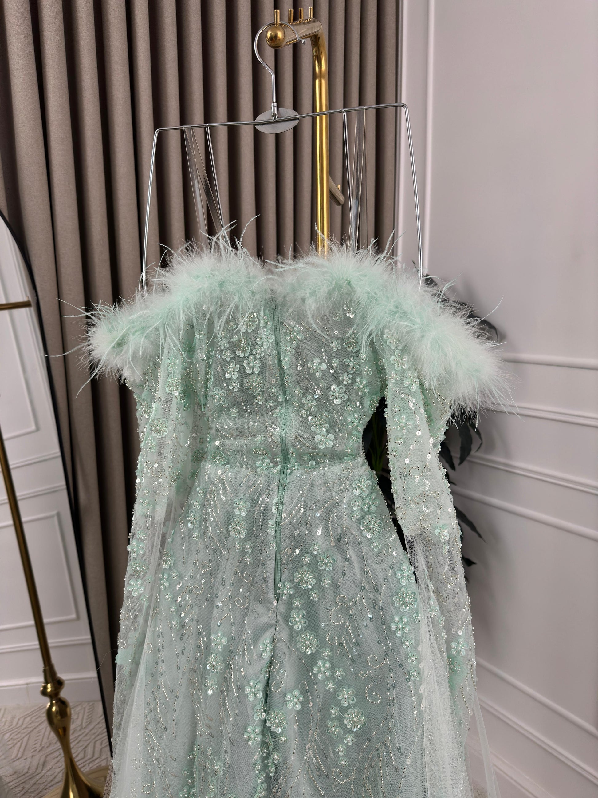 فستان سهرة مذهل بلون أخضر فاتح مزين بالفرو*