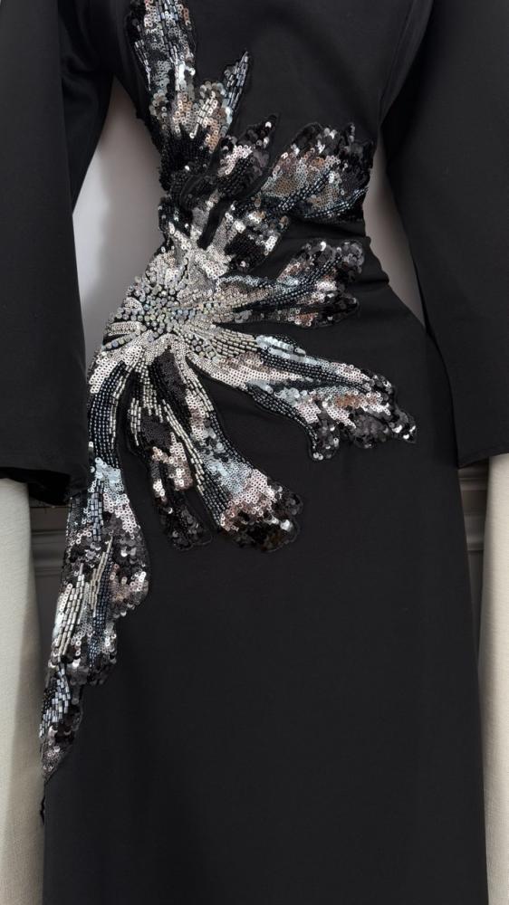 يتميّز بتطريز فاخر من الترتر اللامع على أحد جانبي الخصر يمتد بانسيابية رائعة ليُضفي لمسة من الفخامة والبريق العصري. أما القماش فهو ناعم الملمس، ينسدل بانسيابية تمنحك الراحة والأناقة في الوقت ذاته.