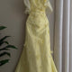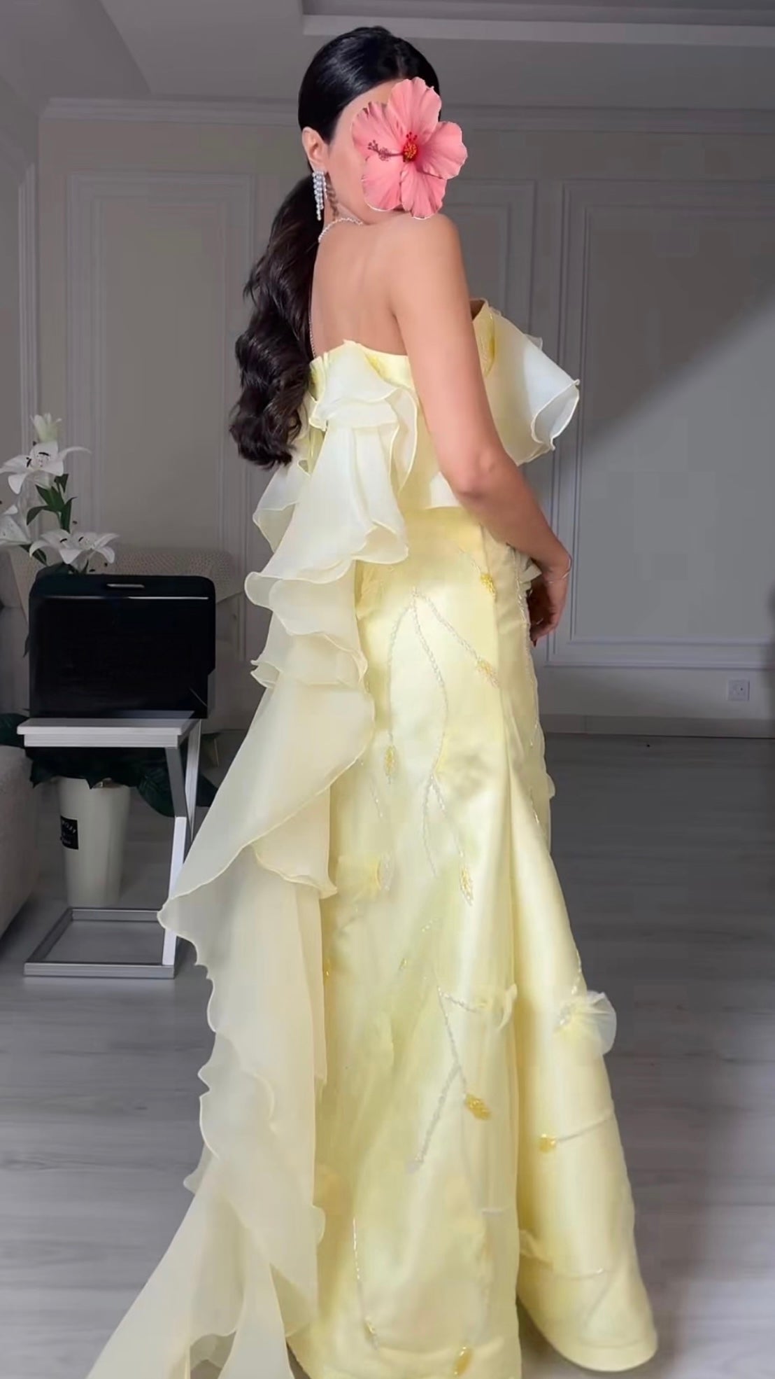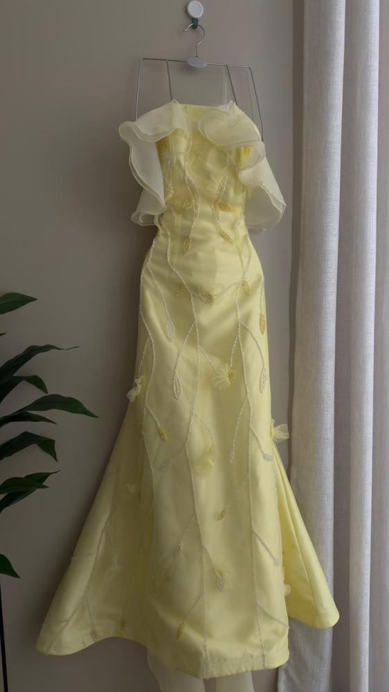 تألقي بجمال هذا الفستان الأصفر المذهل الذي يجمع بين الأناقة والرقي. يتميز بتصميمه الفريد الذي يناسب المناسبات الخاصة، مثل حفلات الزفاف أو السهرات الراقية.