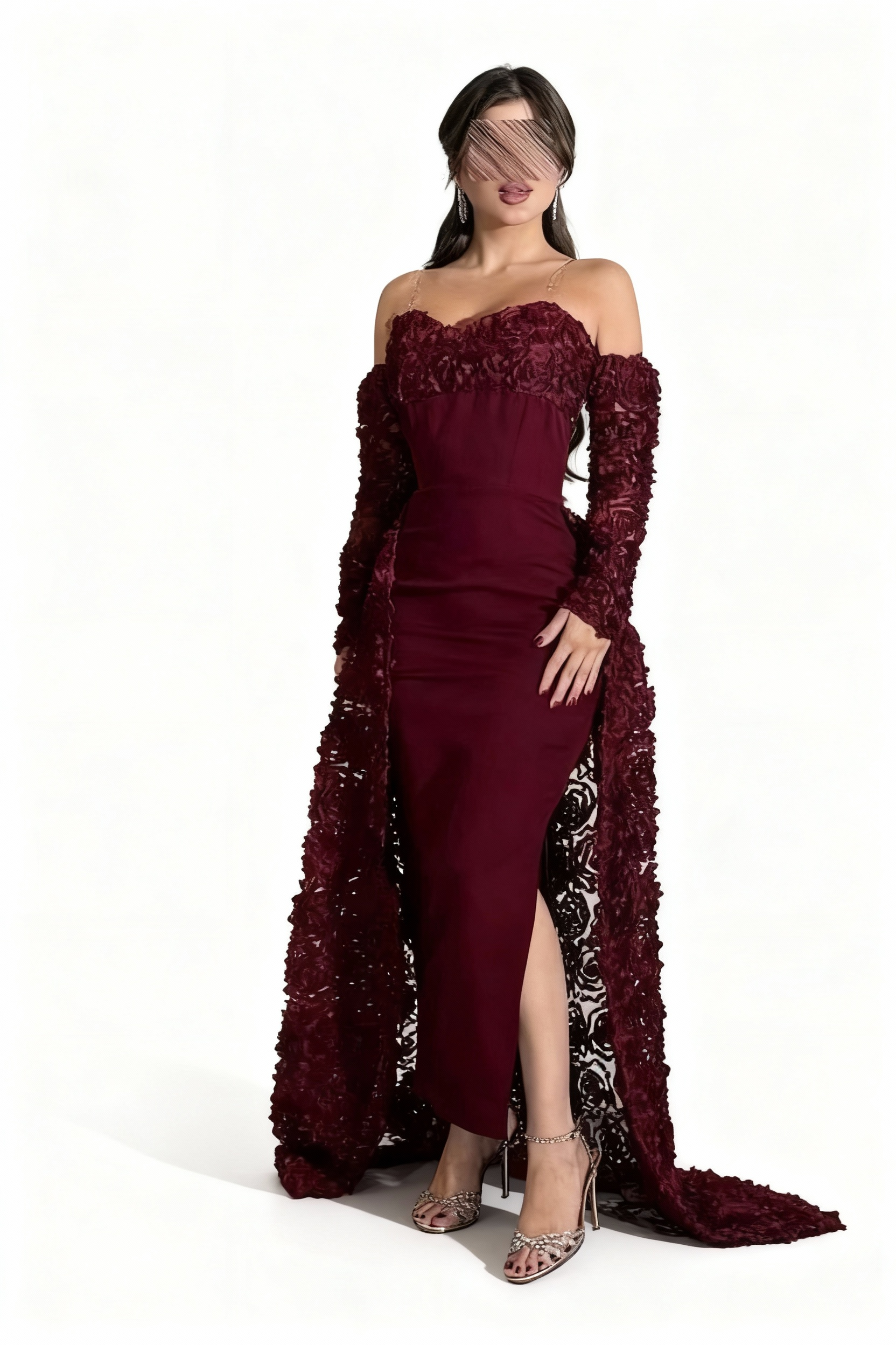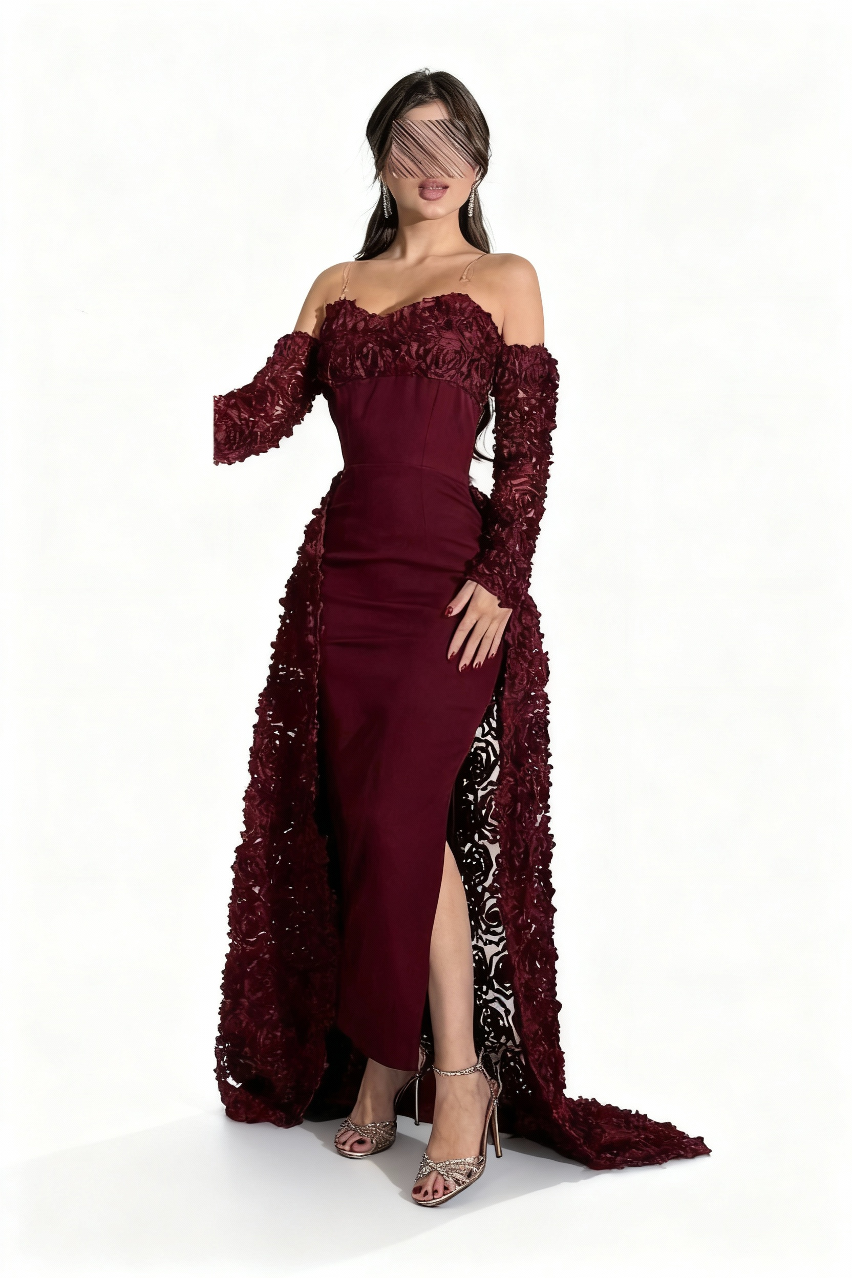 استمتعي بإطلالة ملكية تخطف الأنظار مع هذا الفستان الفخم باللون العنّابي الداكن، المصمم ليبرز أنوثتك بأناقة راقية ولمسة درامية جذابة. يتميز بتصميمه الفريد الذي يجمع بين القصّة الكلاسيكية الضيقة التي تبرز جمال القوام، والكاب الخلفي الطويل المطرّز بالورود ثلاثية الأبعاد، مما يمنحك حضورًا فخمًا يناسب أرقى المناسبات والسهرات