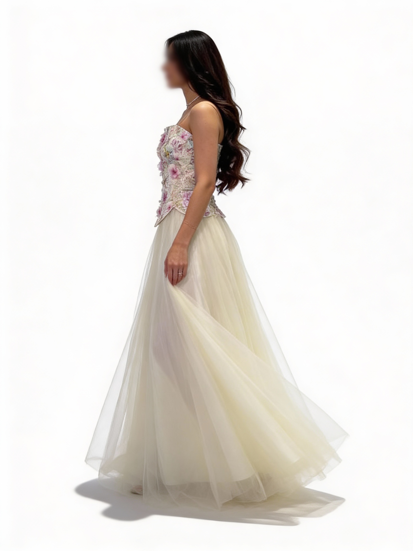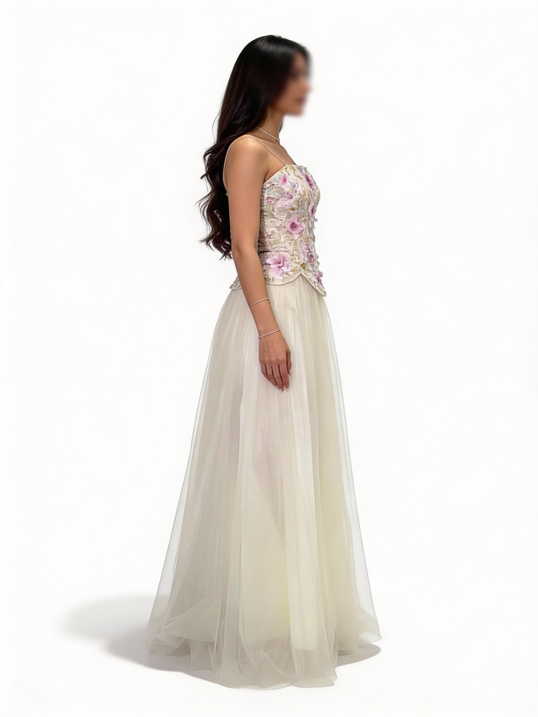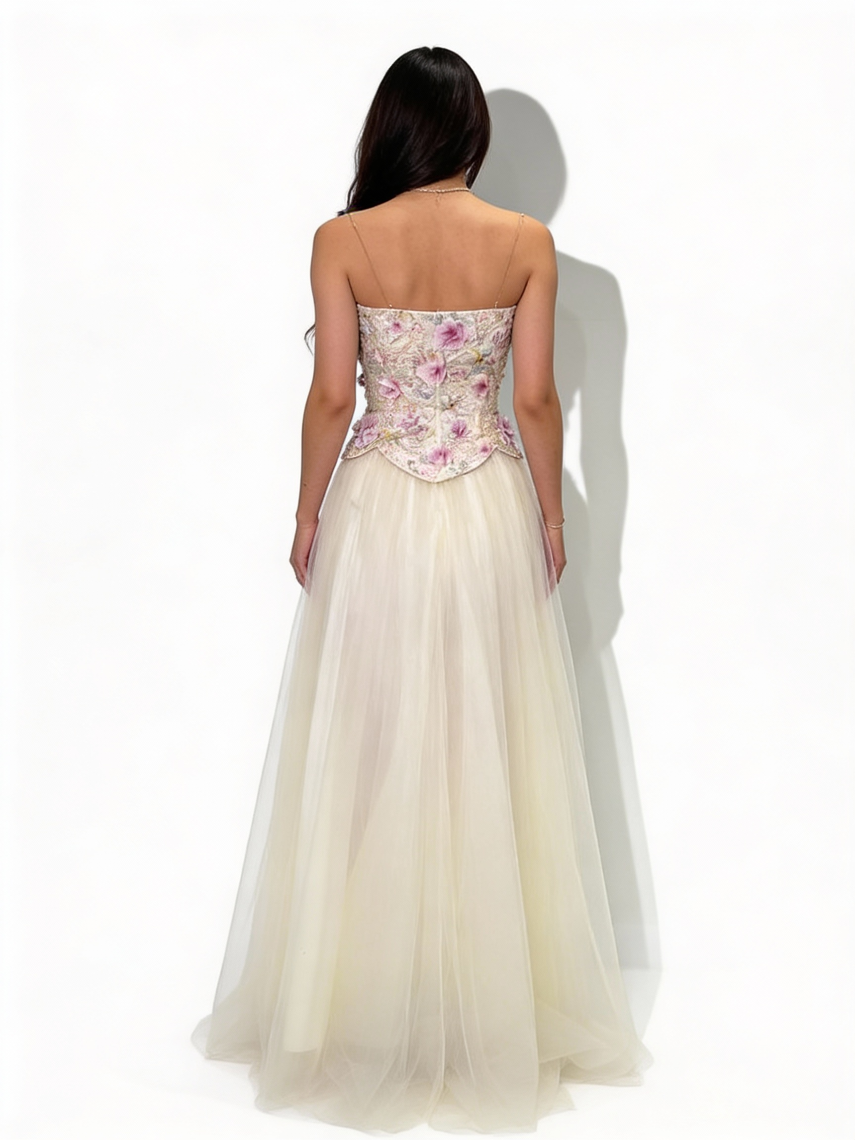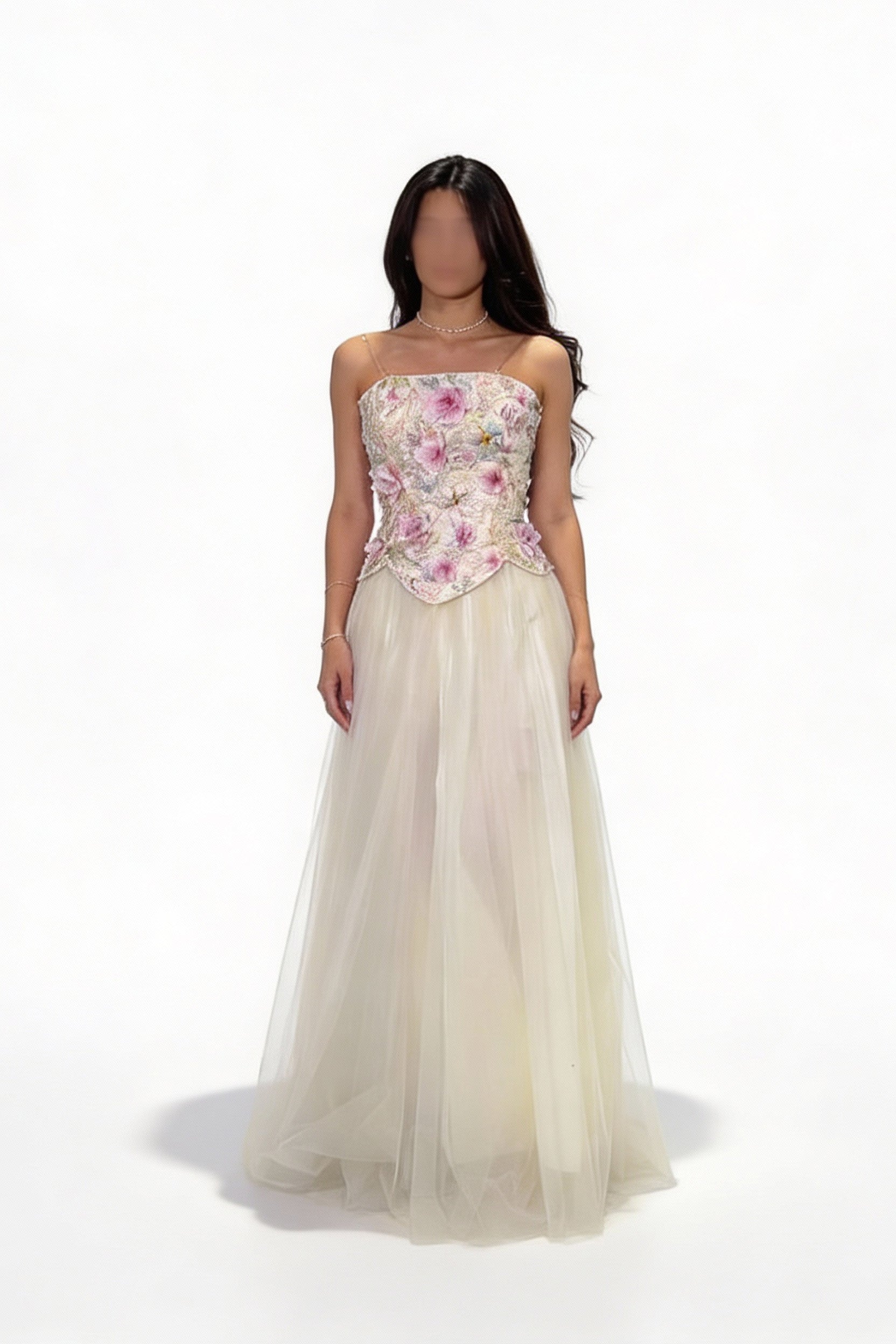 - **تفاصيل فريدة:** تحتوي على زهور صغيرة وخرز متلألئ، مما يجعل كل تفاصيل الفستان مميزة.