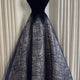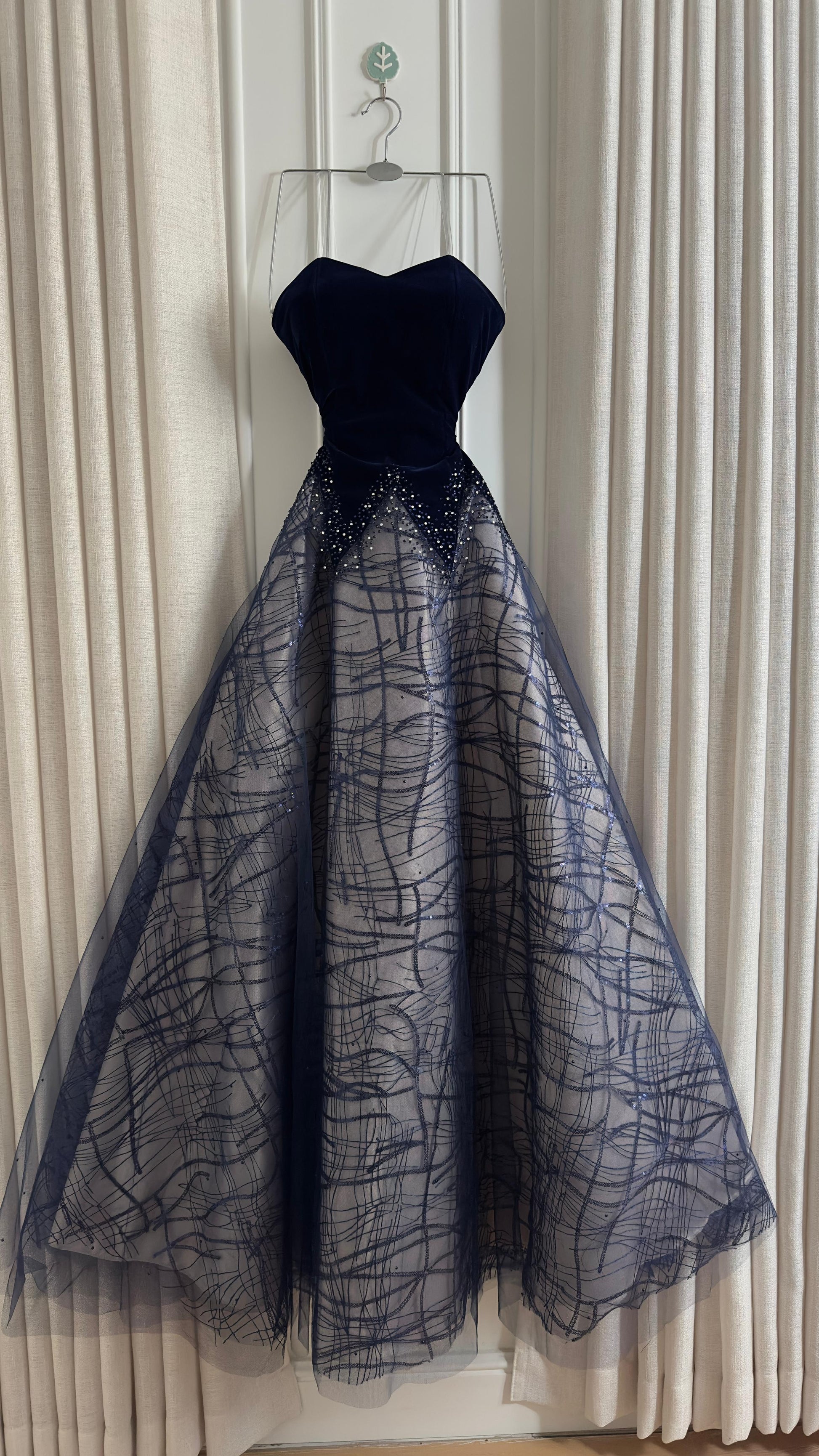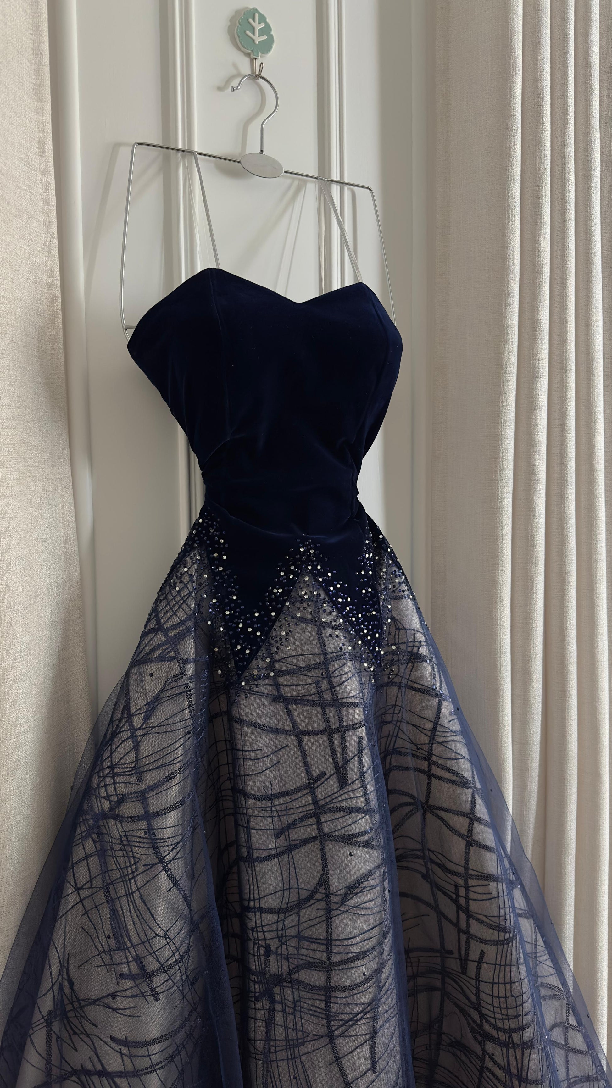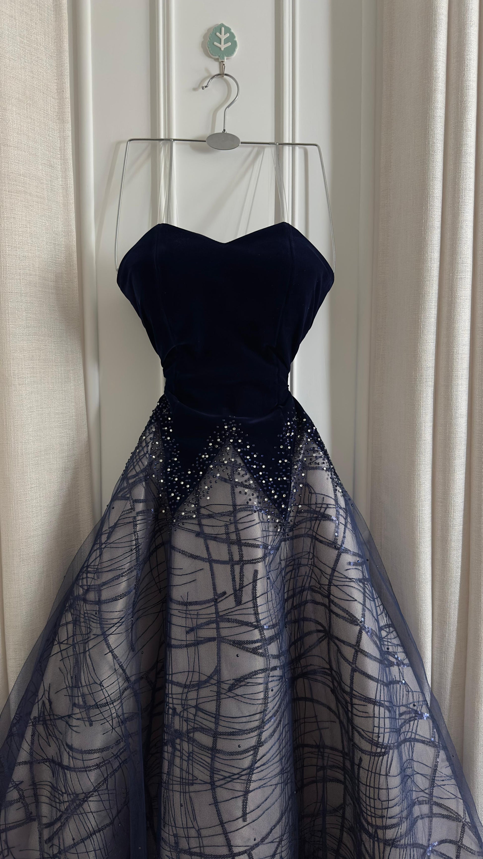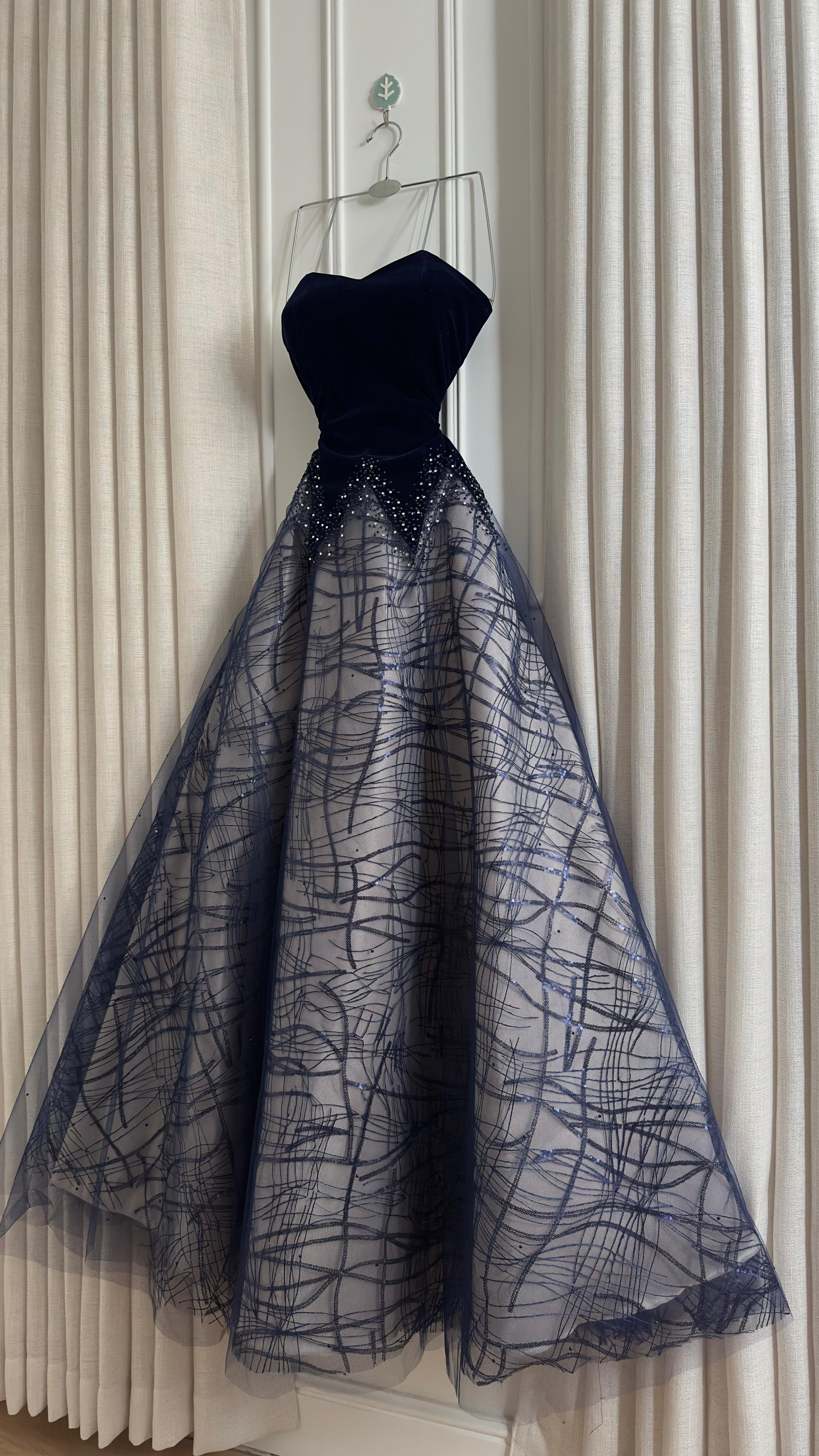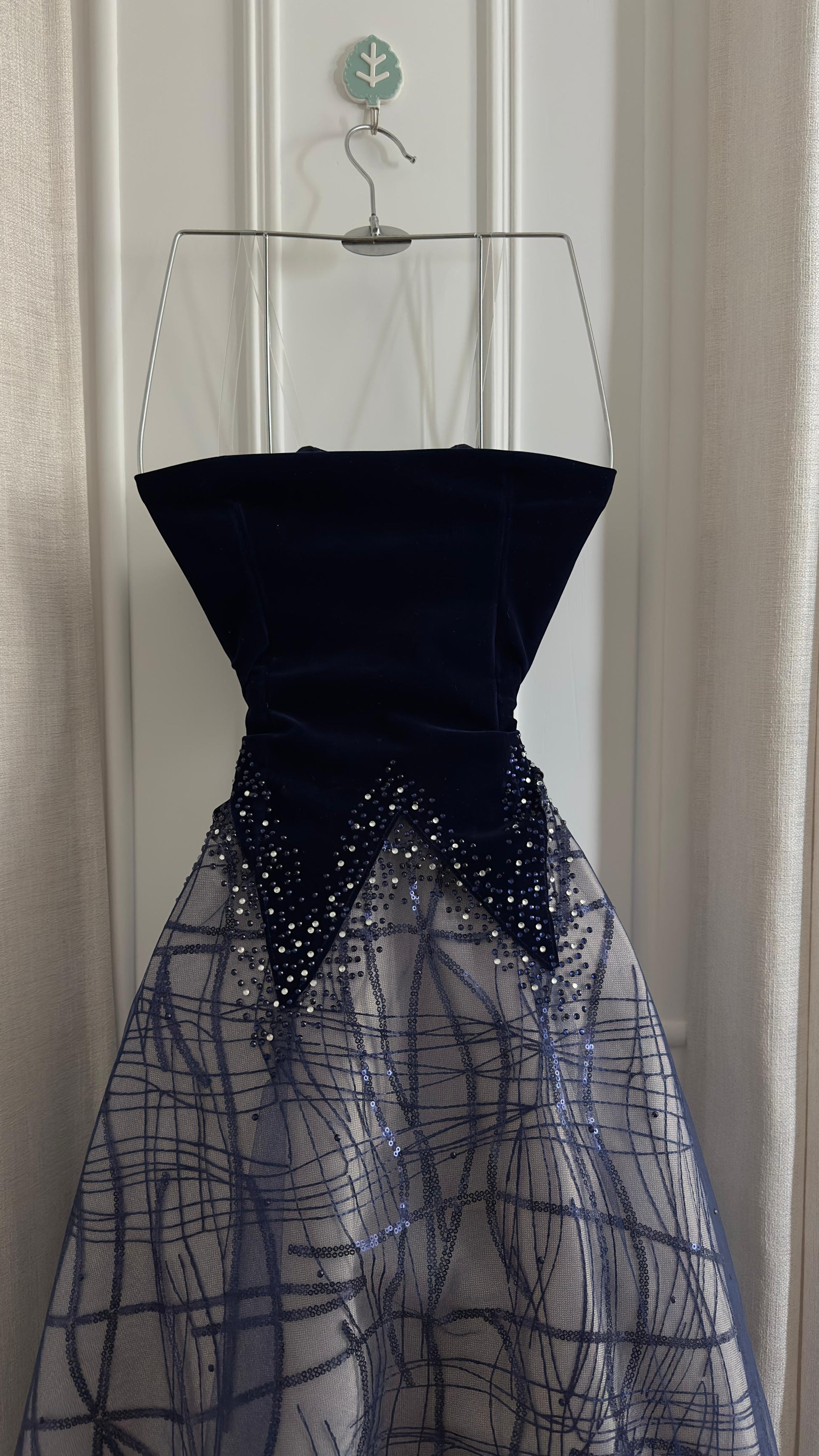 **فستان سهرة أنيق بلون كحلي مع تفاصيل فريدة**