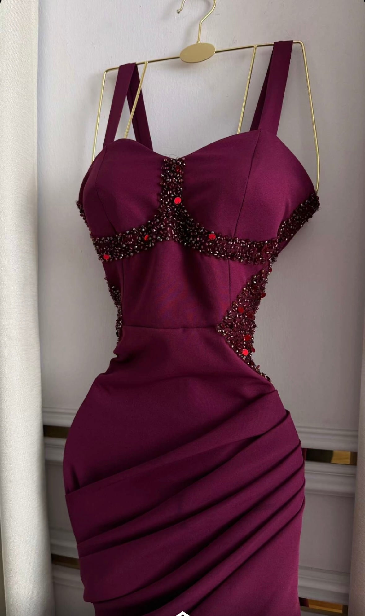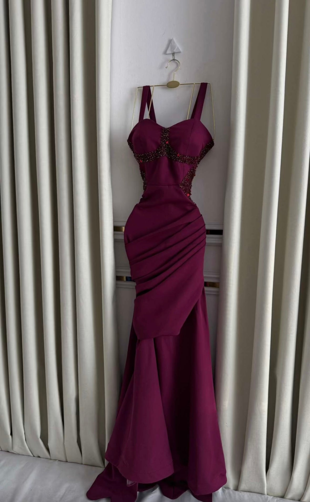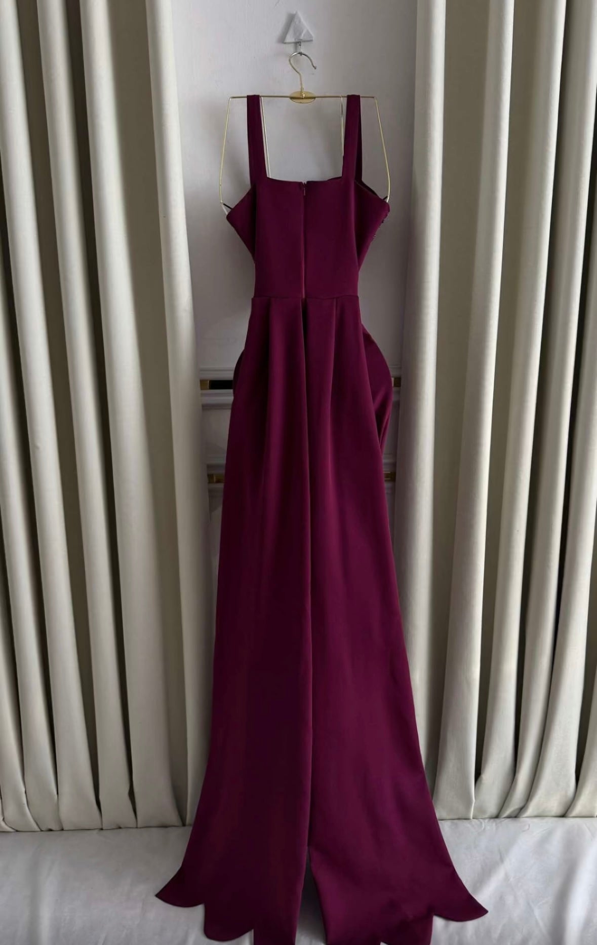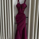 تألقي في المناسبات الخاصة بهذا الفستان الساحر بلون التوتي الغني، الذي يجمع بين الجاذبية العصرية والتفاصيل الفاخرة.