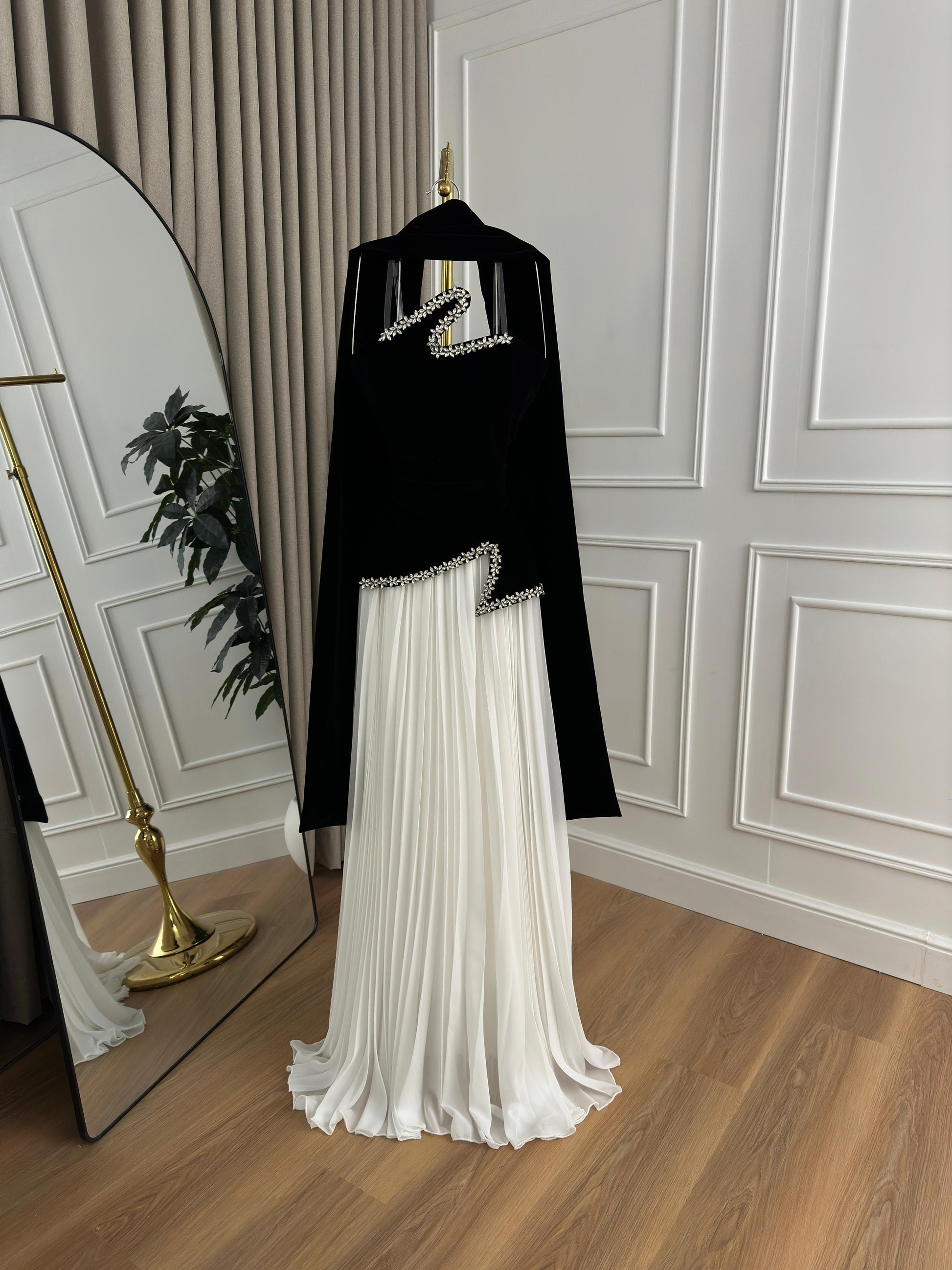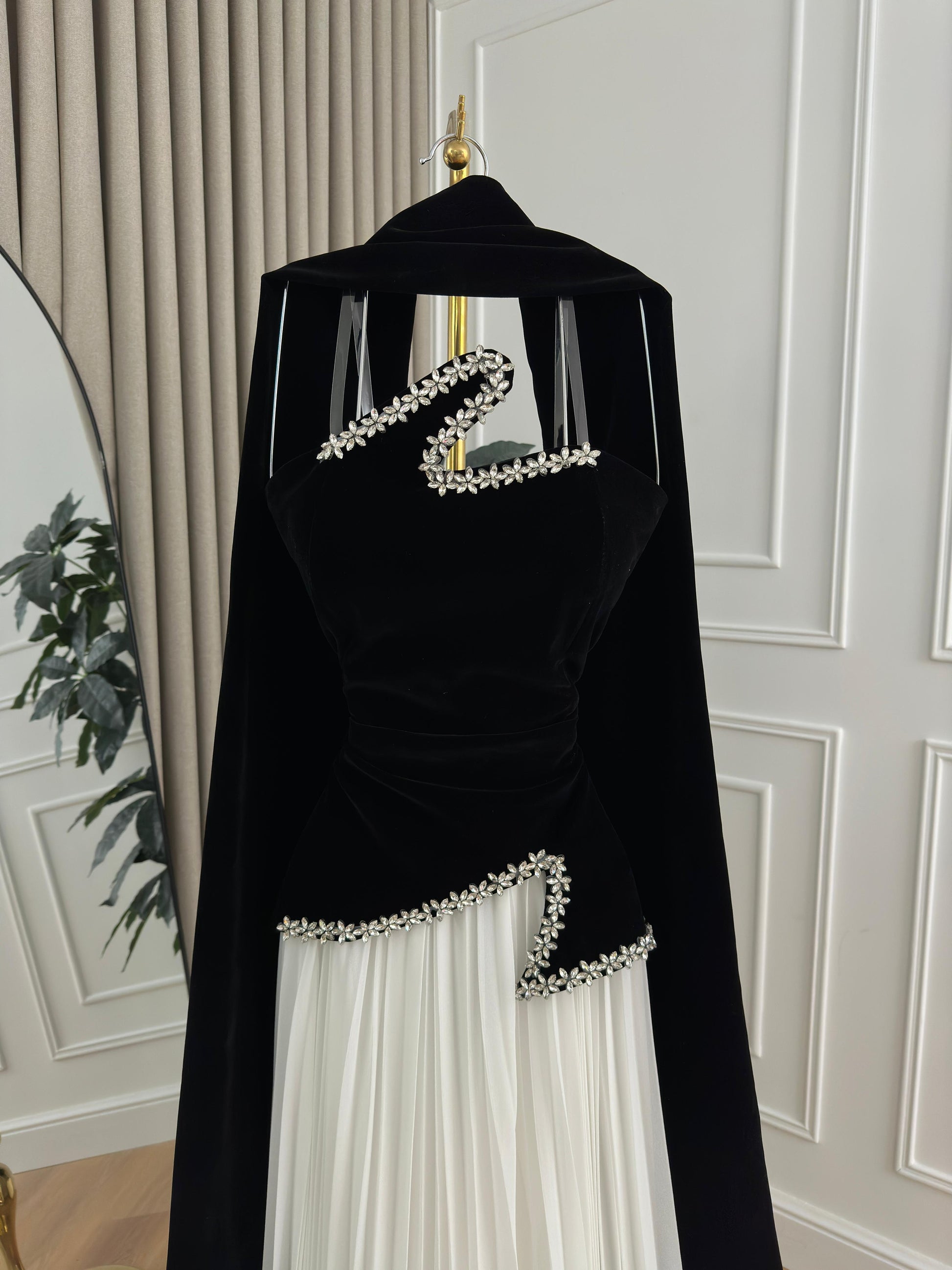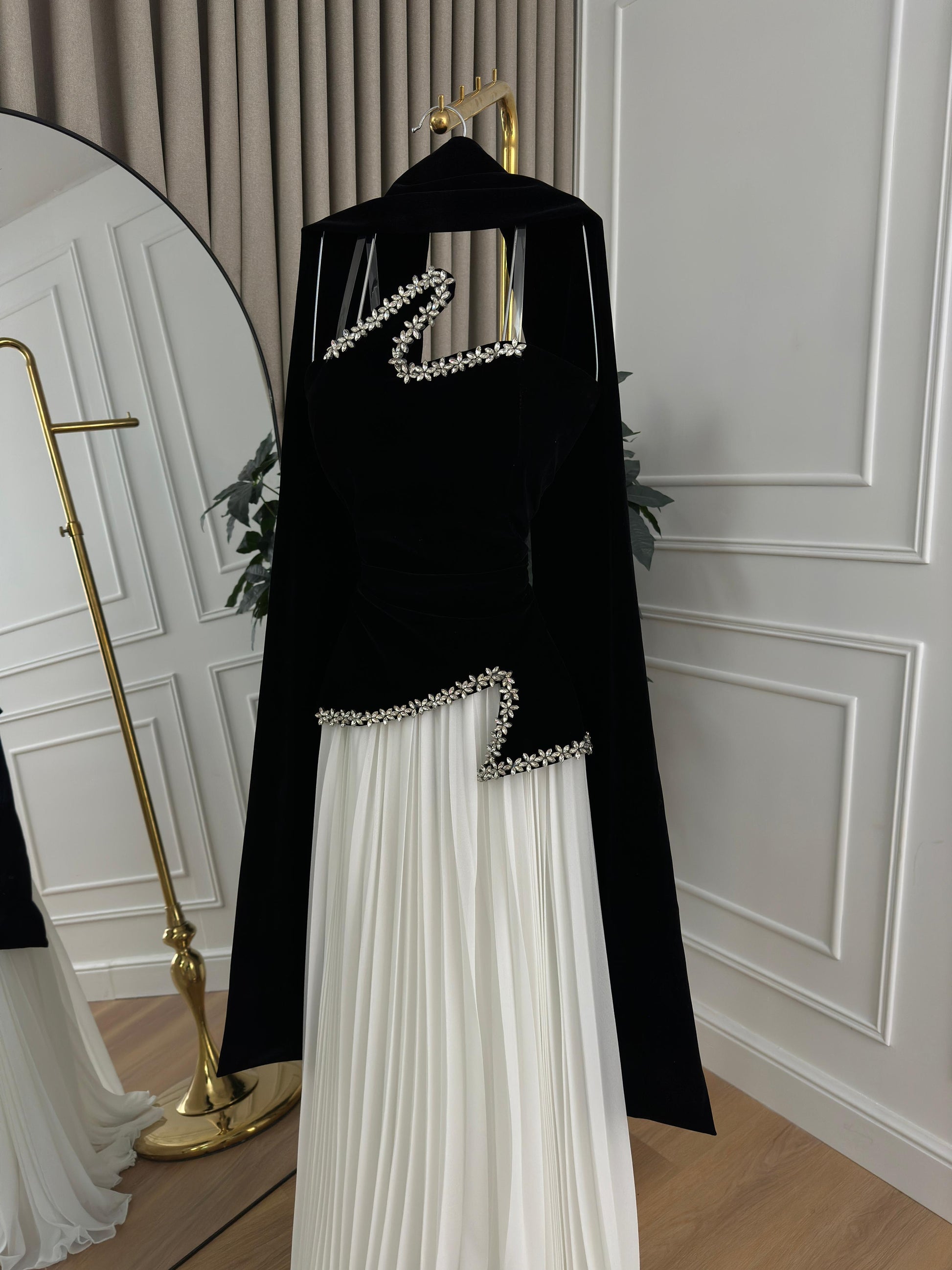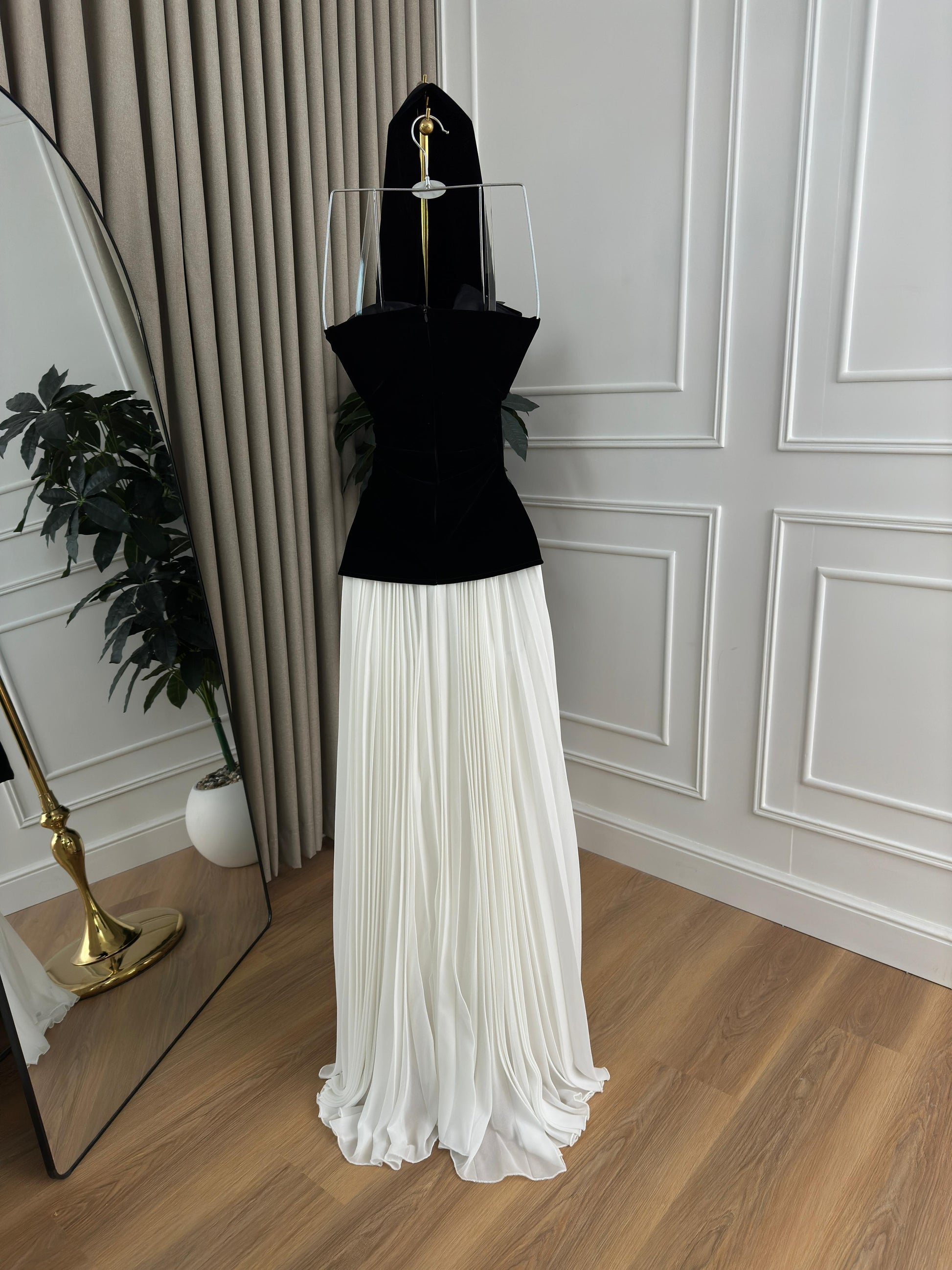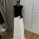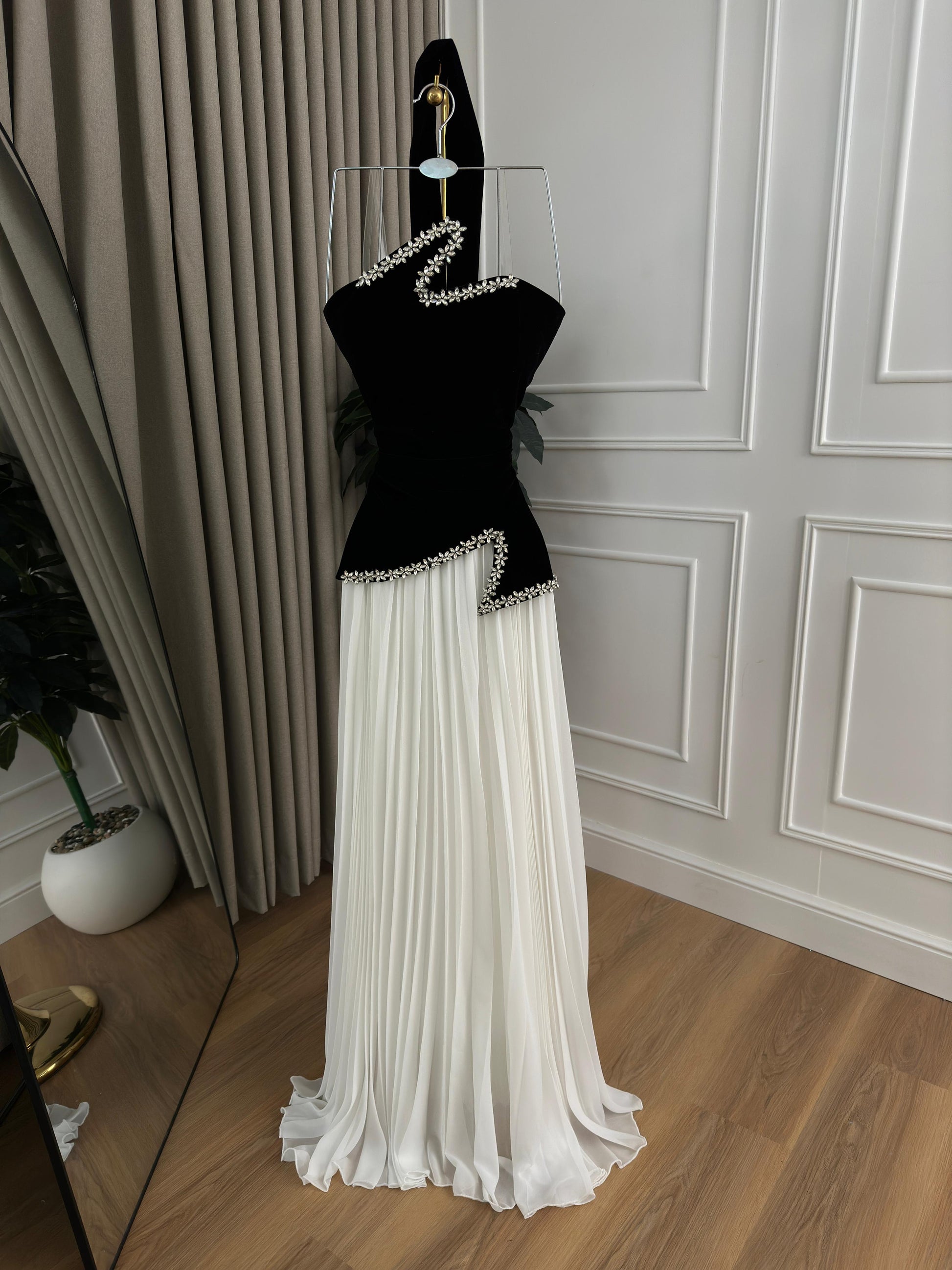 **فستان سهرة أنيق بلون أسود وأبيض مع تفاصيل جذابة**