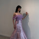 التصميم يزداد فخامة بتداخلات من التول الناعم، مضيفاً لمسة درامية ساحرة وحركة انسيابية راقية يأتي التول بتدرجات من اللون البنفسجي الناعم لمنحك اطلالة انثوية جذابة
