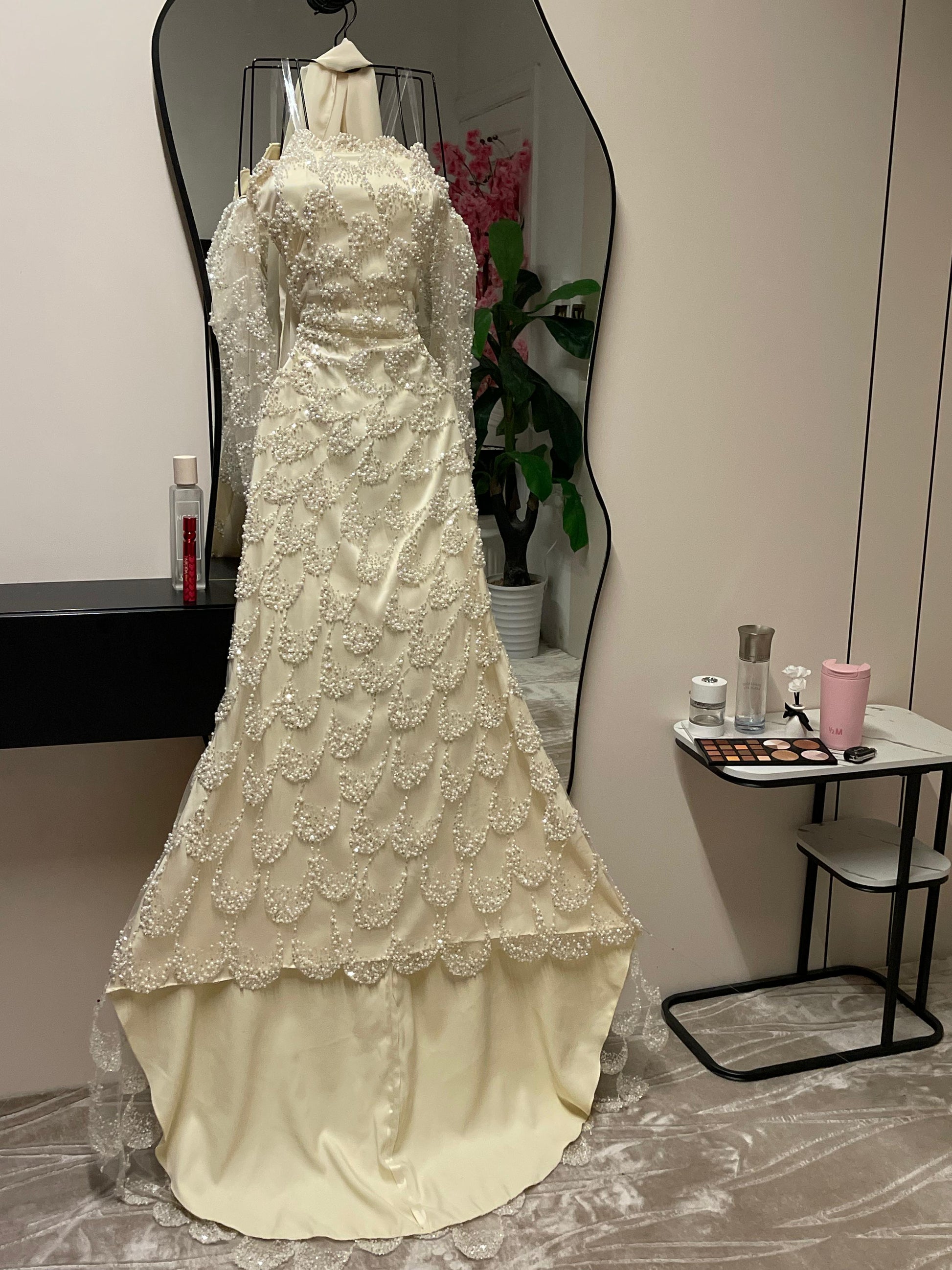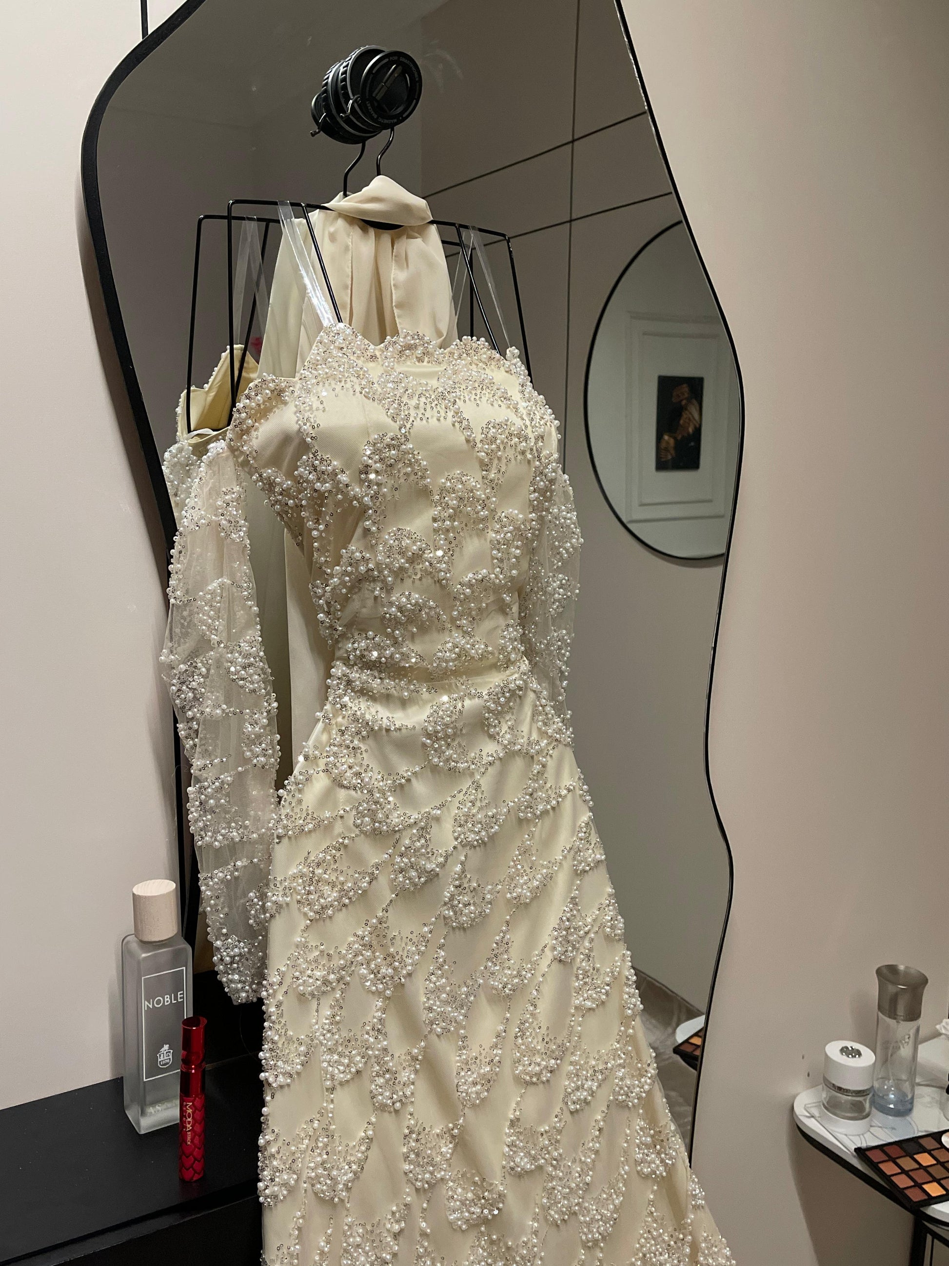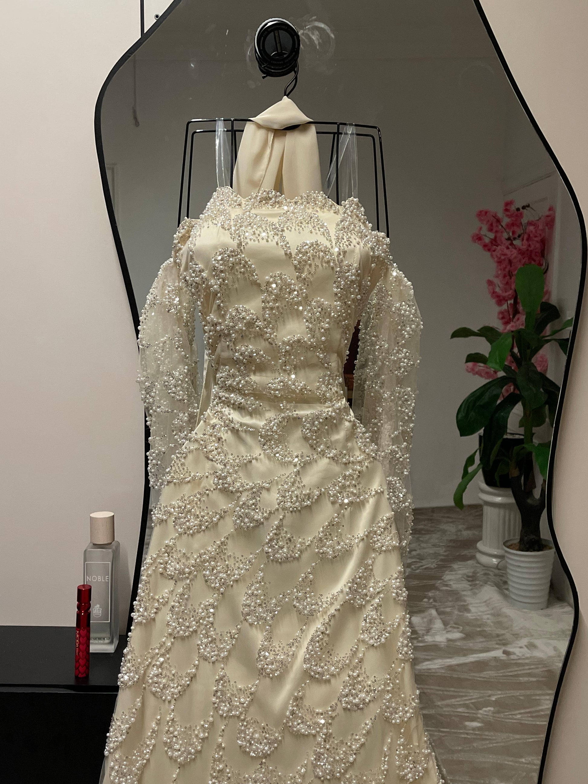 تألقي بأناقة لا تضاهى مع هذا الفستان الكريمي الرائع، مثالي لكل المناسبات الخاصة حيث تودين أن تتركي انطباعاً مميزاً.