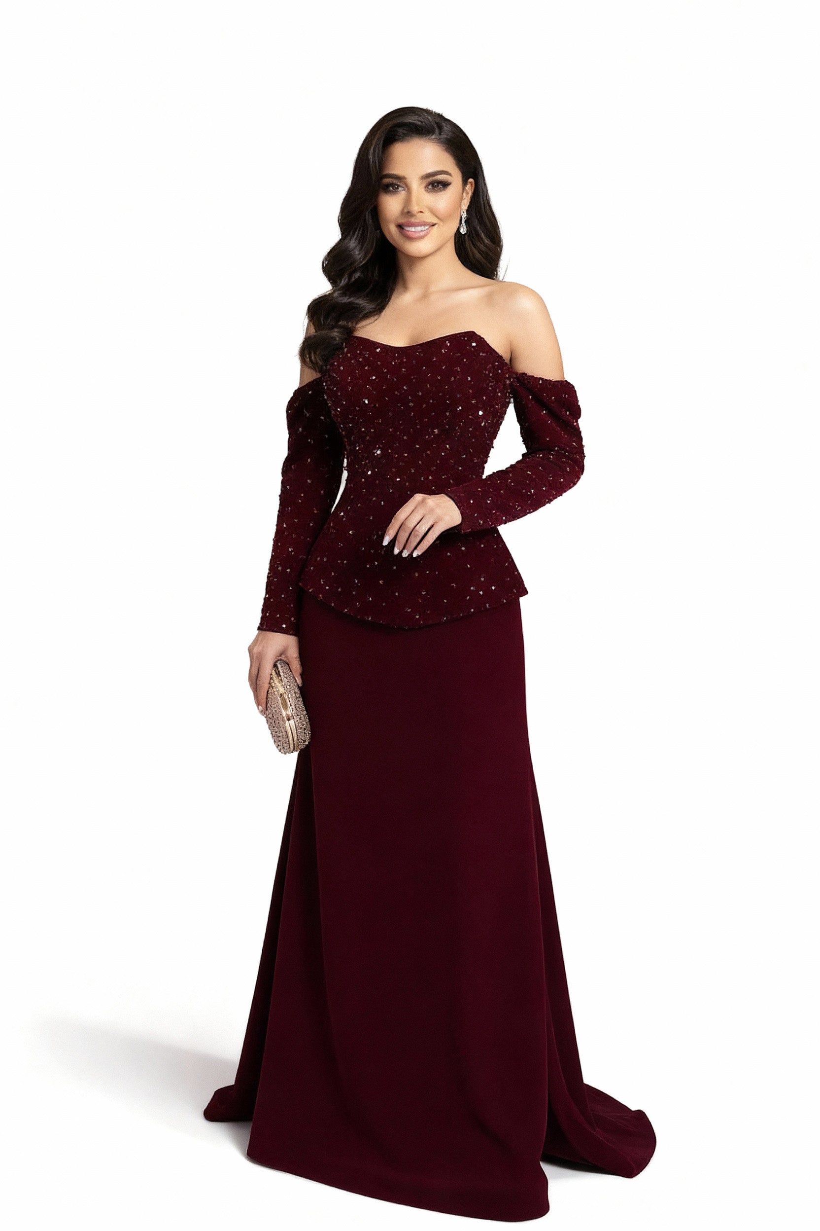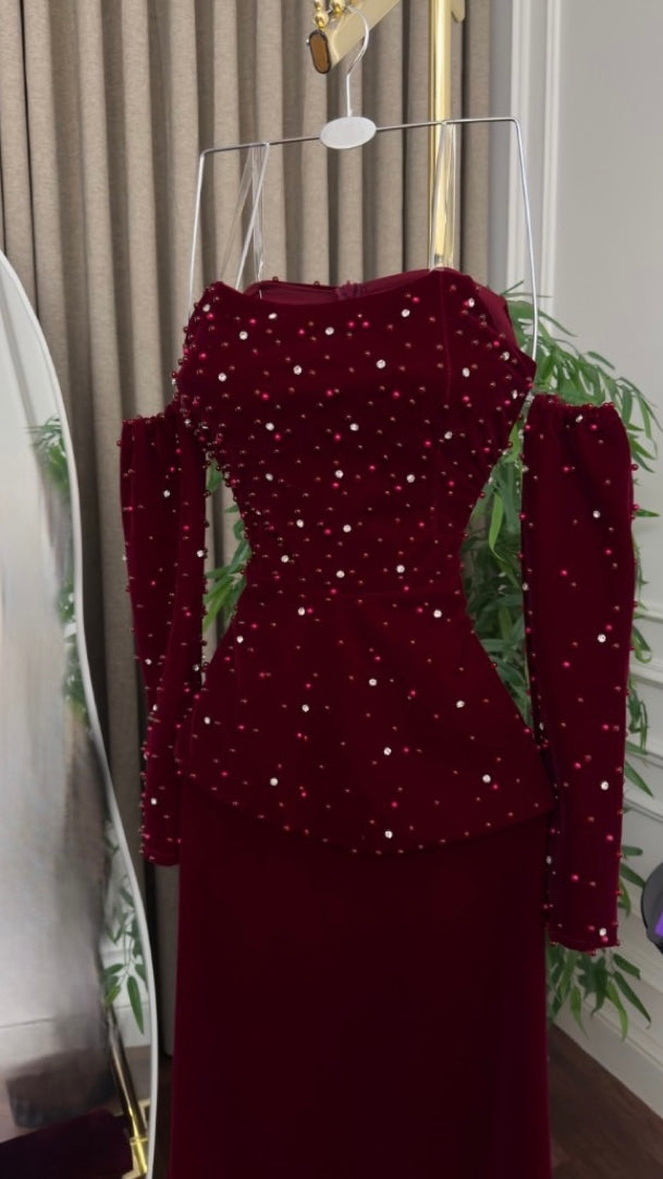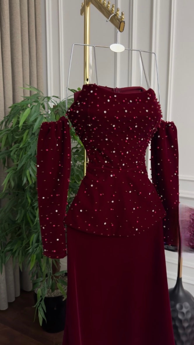 فستان سهرة فاخر – أناقة لا تضاهى بلون خمري ساحر ✨
