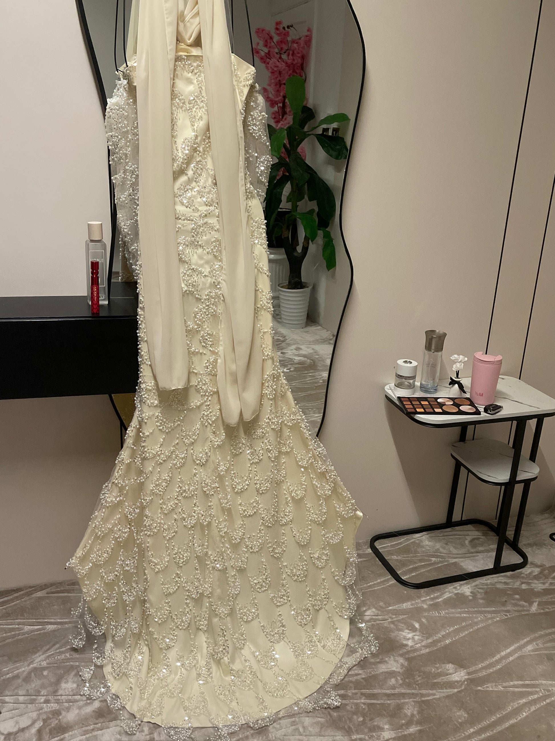 - **التصميم:** فستان بقصة ضيقة عند الخصر وتنسدل بشكل جذاب على الأرض، مما يبرز الأنوثة بكل سلاسة.