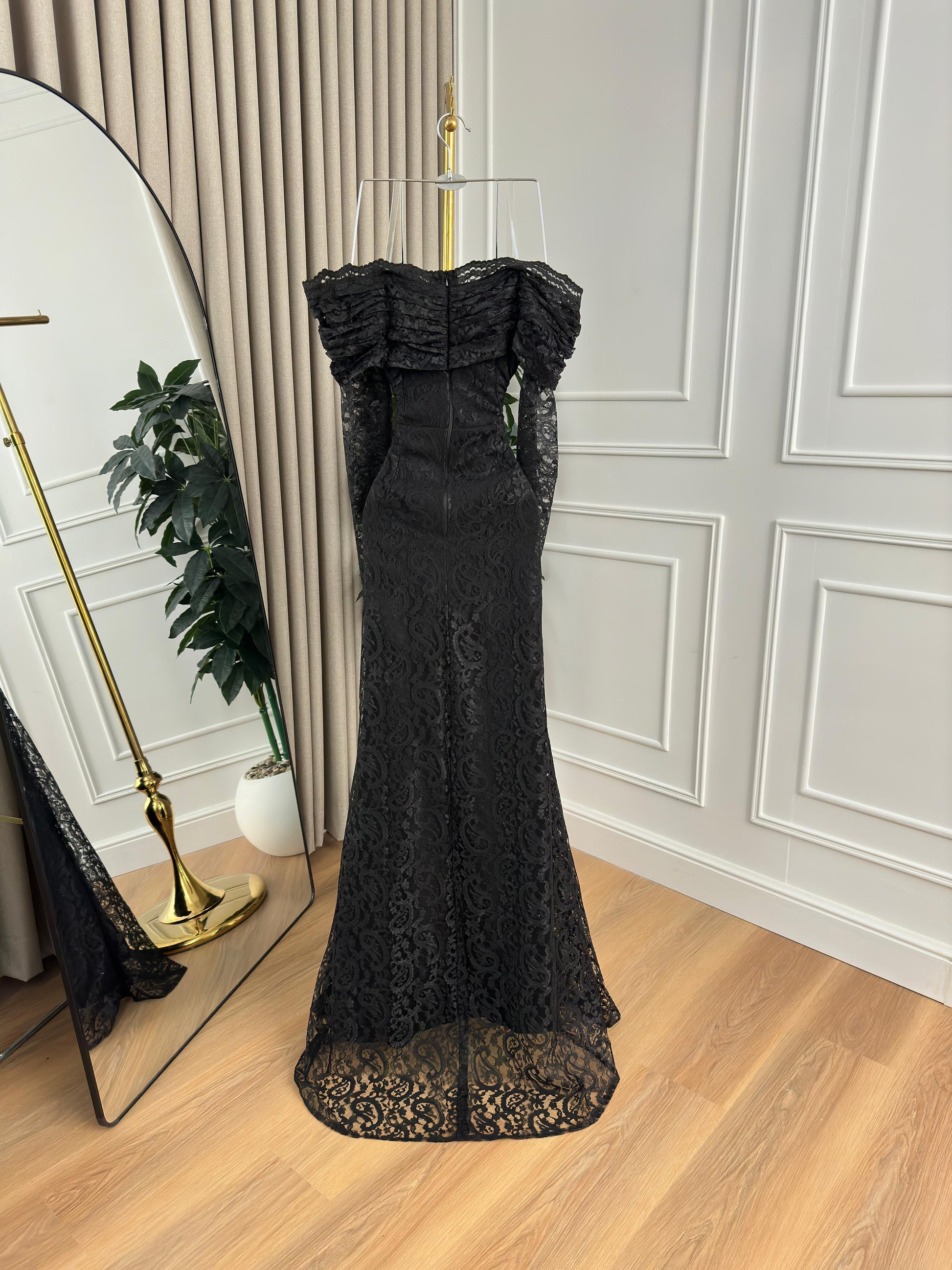 - *التفاصيل المنسدلة:* يتميز بتفاصيل مميزة من الدانتيل عند الجانبين، تضفي لمسة فاخرة وتحرك الفستان بشكل رائع.