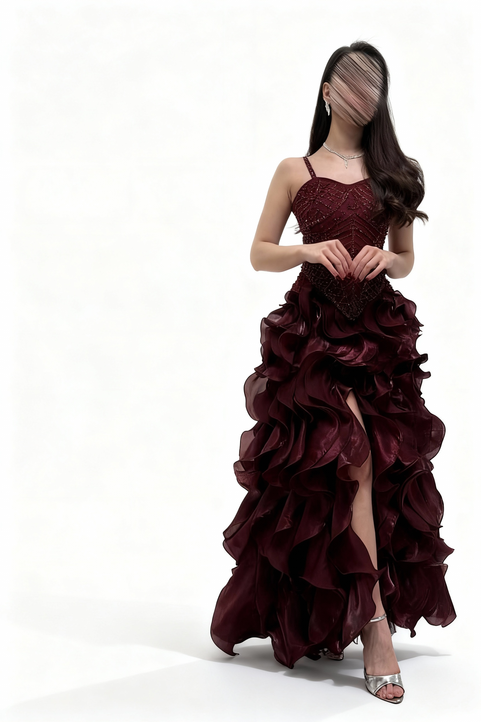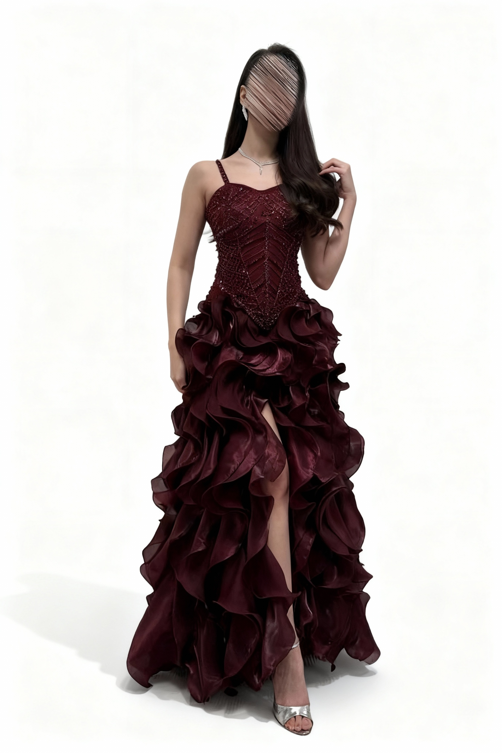 - **الفتحة الأمامية:** تضيف لمسة من الجرأة والزينة، مما يجعل هذا الفستان مثاليًّا لحفلات السهرات.