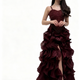 - **التصميم الجريء:** الجزء العلوي مزين بأحجار لامعة وقصّة ضيقة، في حين ينساب السهم الجزء السفلي مكون من طبقات رقيقة تضيف حركة وأناقة.