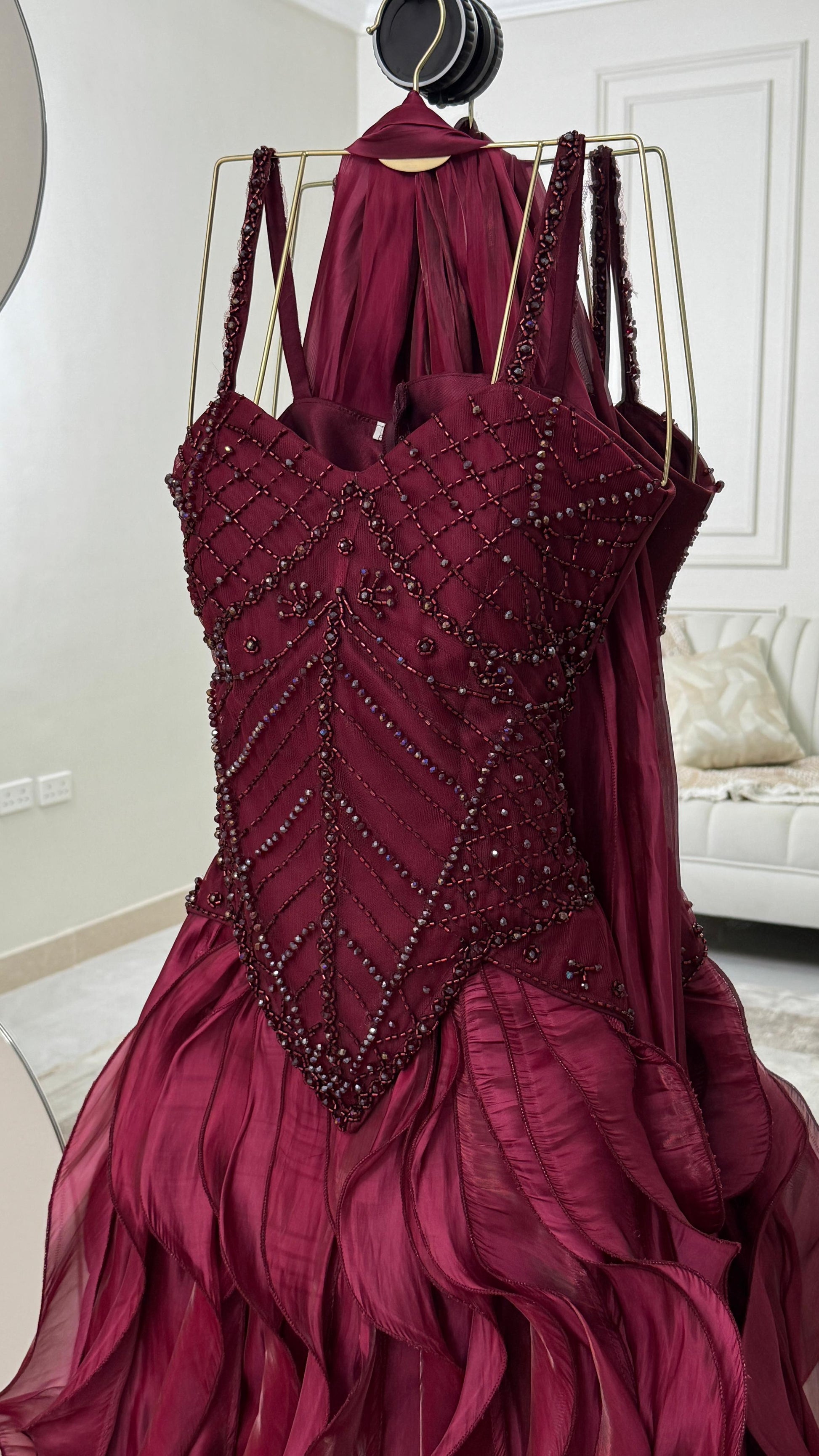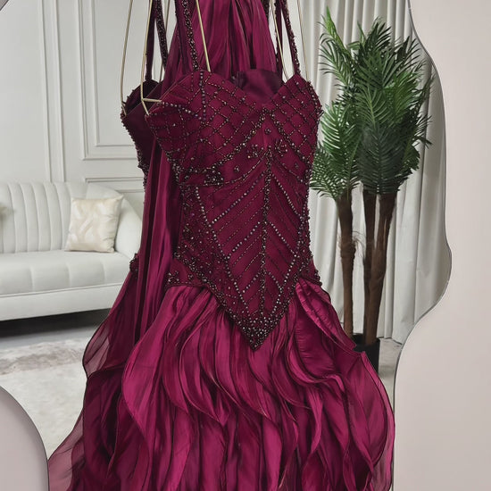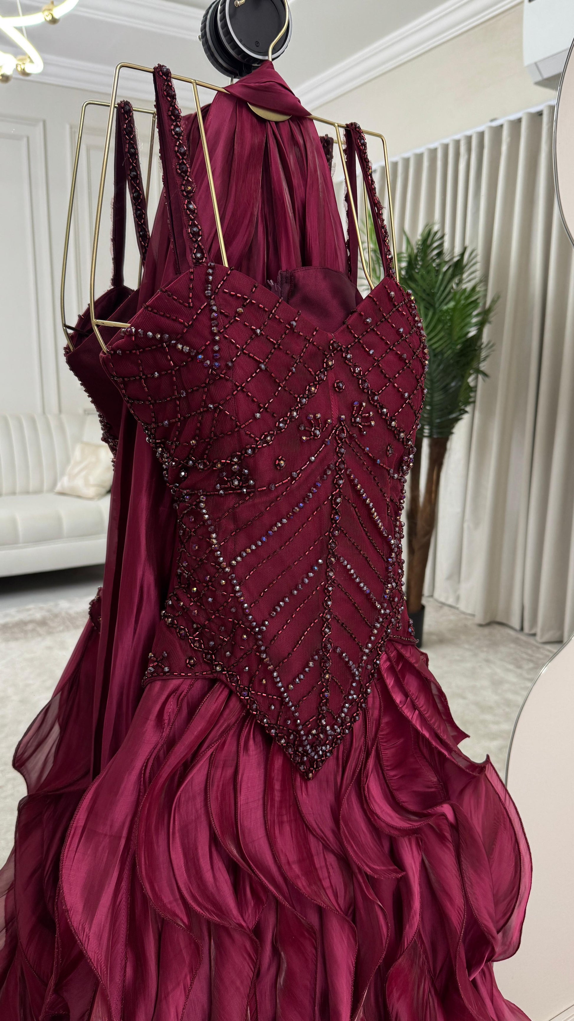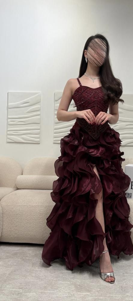 اجعلي هذا الفستان العنابي خيارك المفضل في خزانتك، وكوني نجمة كل مناسبة. تواصلي معنا لمزيد من التفاصيل حول كيفية اقتناءه!