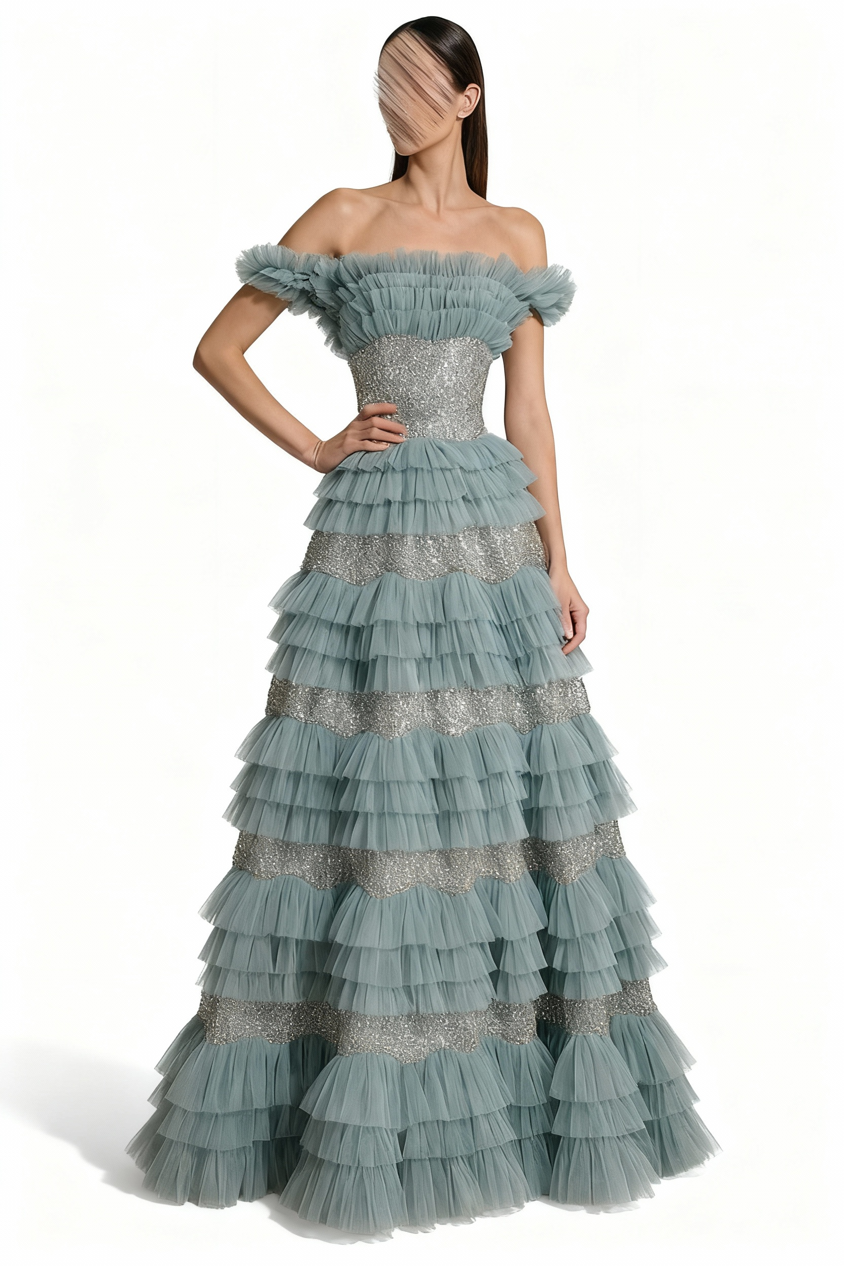 - **النمط:** تصميم متدفق يتميز بتفاصيل مطرزة بالخرز اللامع على الخصر، مما يعزز من جمال التصميم.