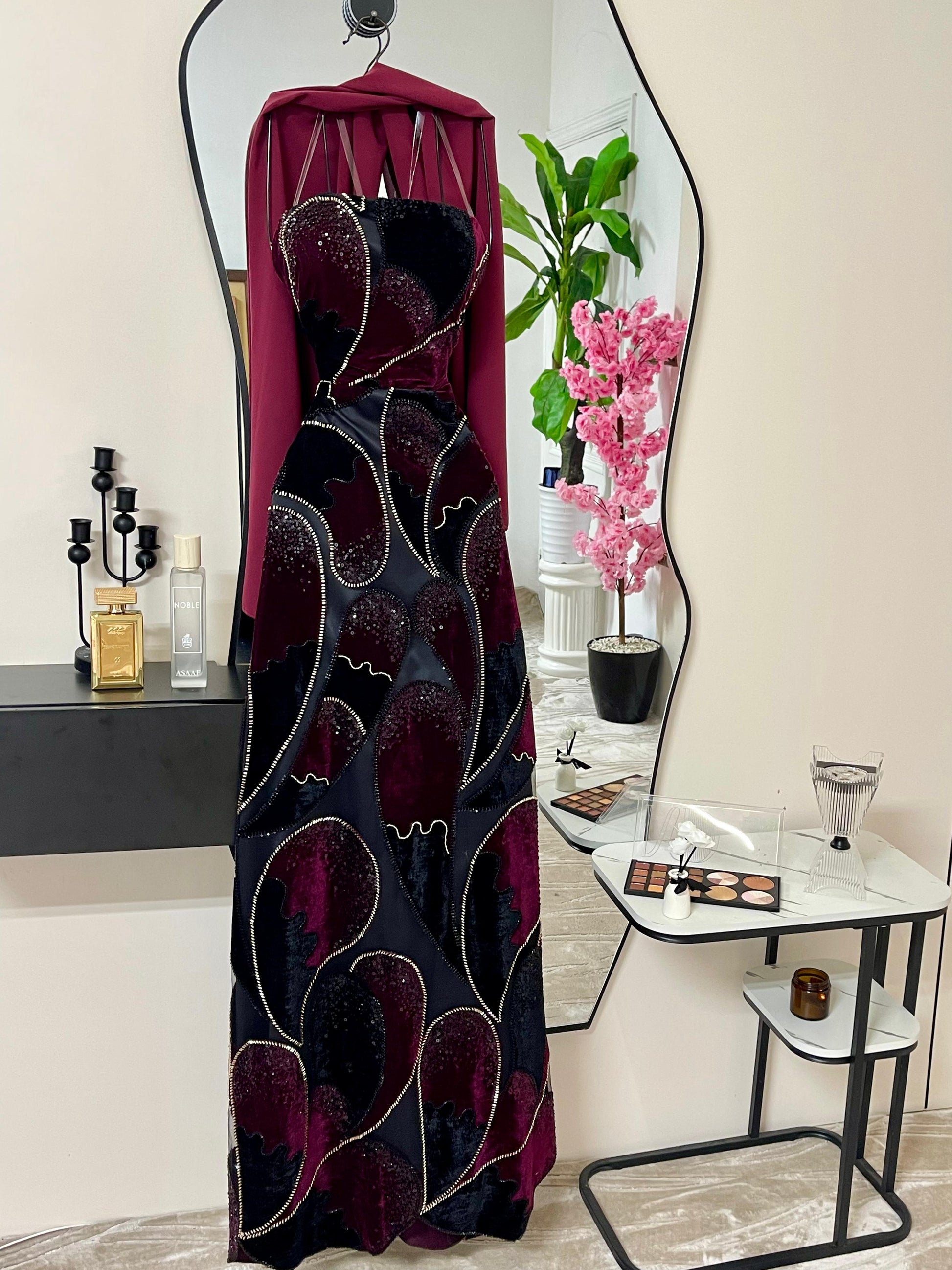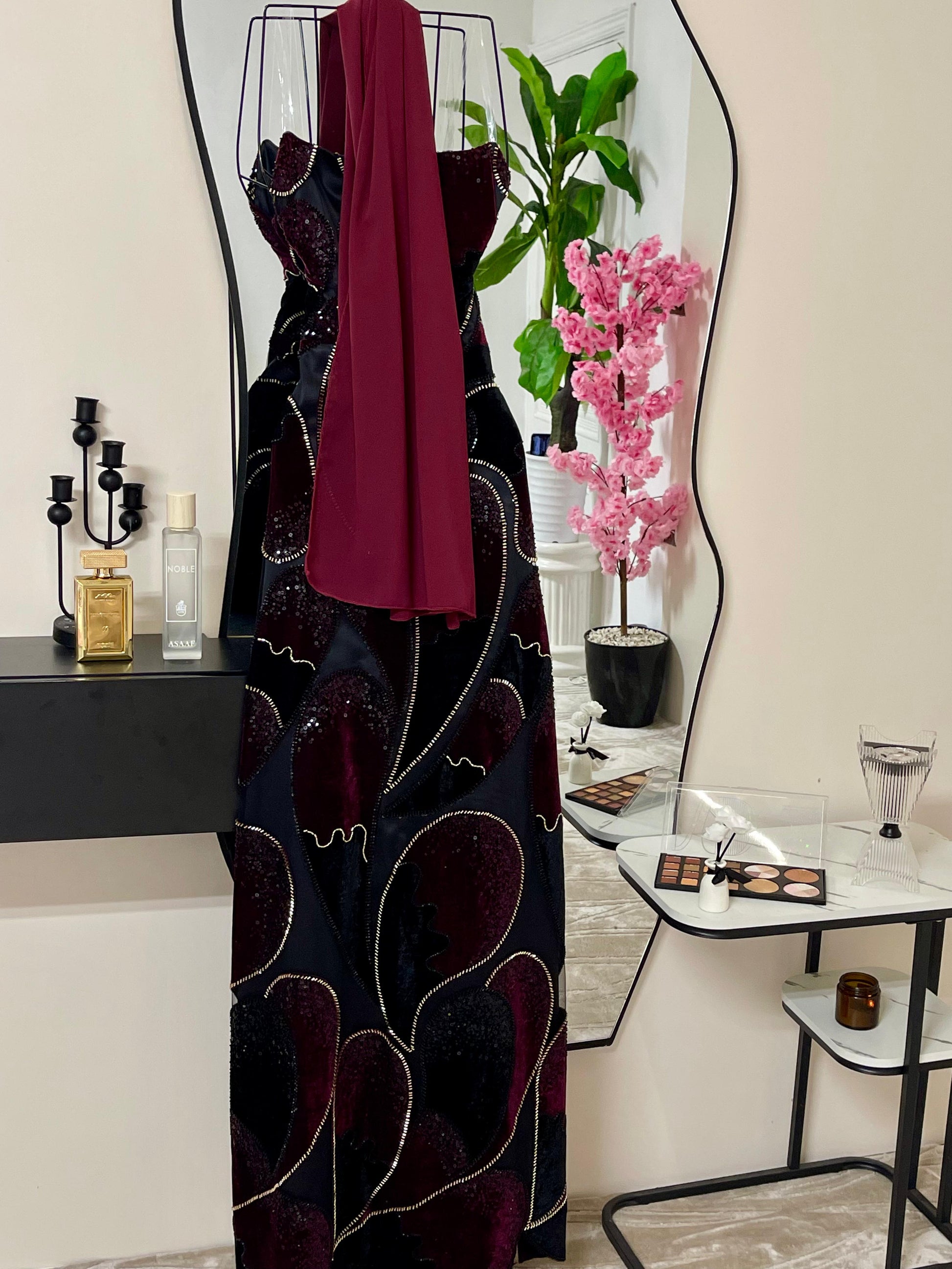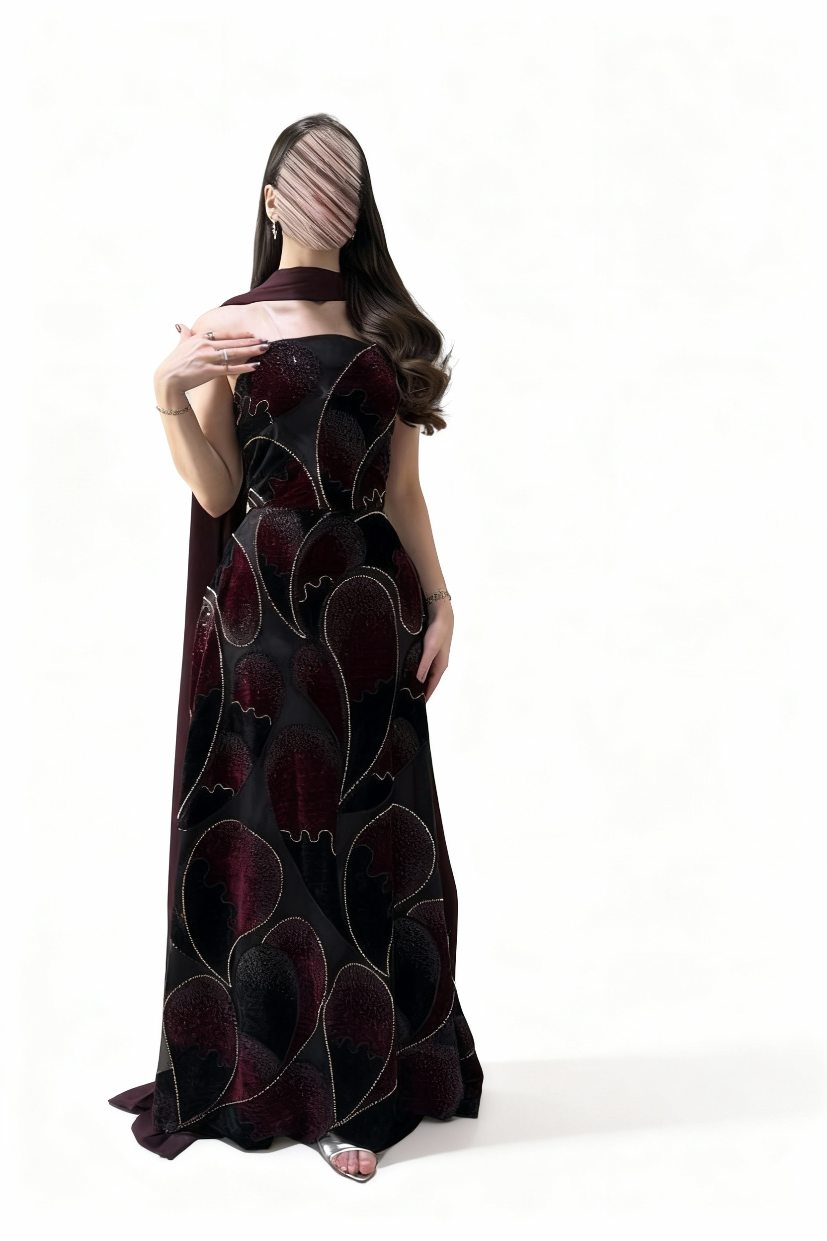 - **الألوان:** مزج بين اللونين الأحمر الداكن والأسود مع تطريزات تبرز اللمسة الفنية وتضفي على الفستان جاذبية خاصة.