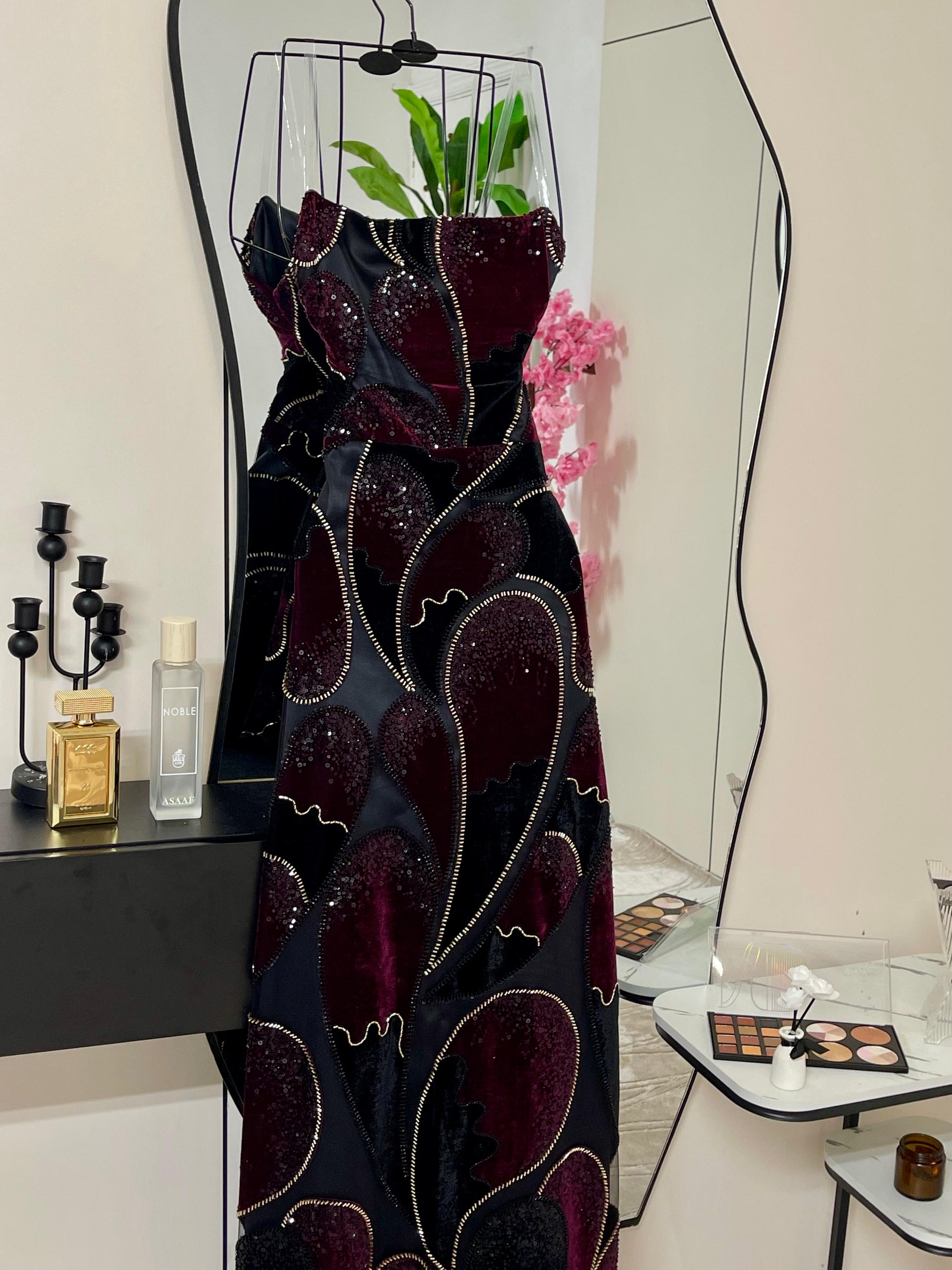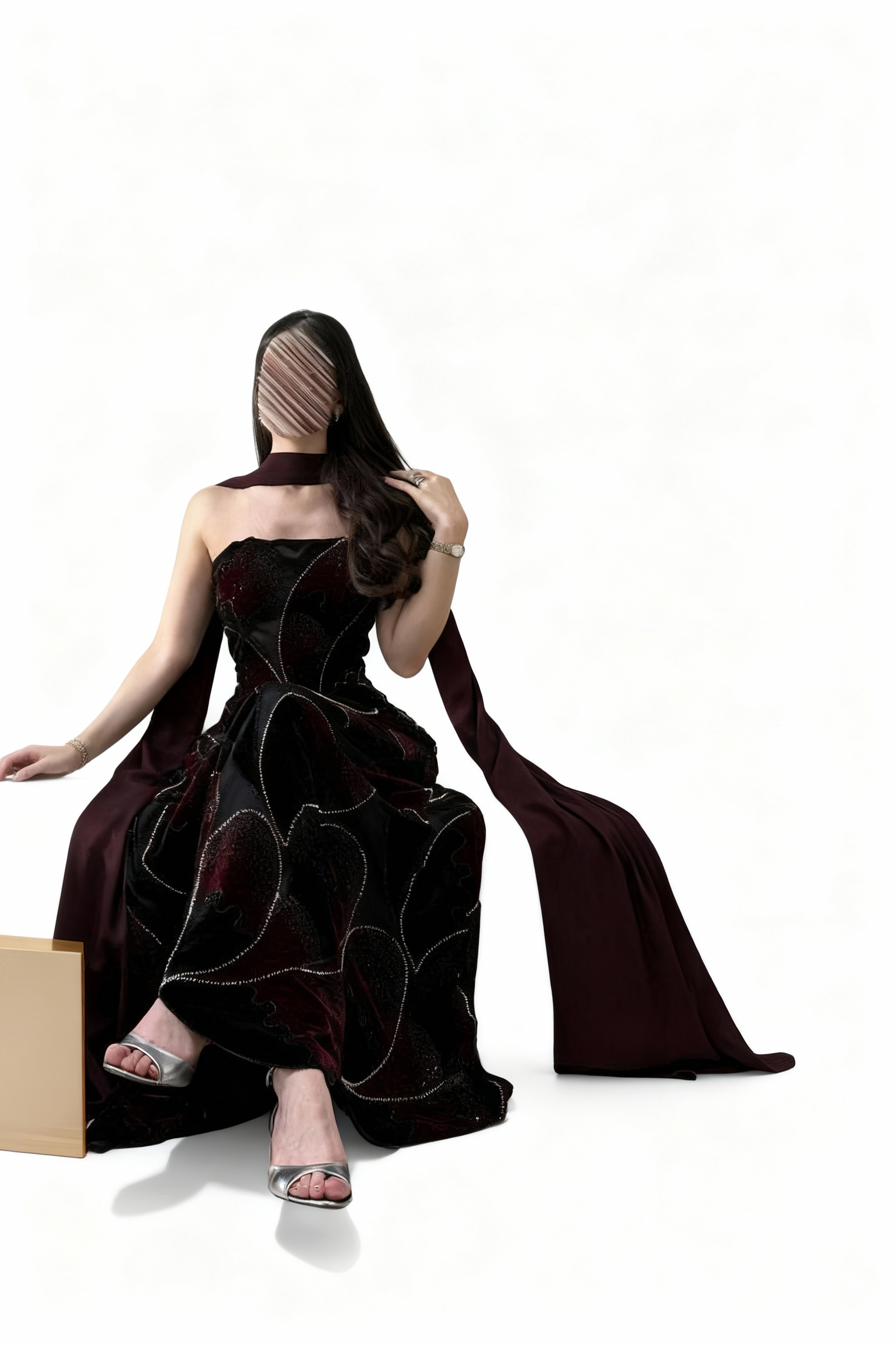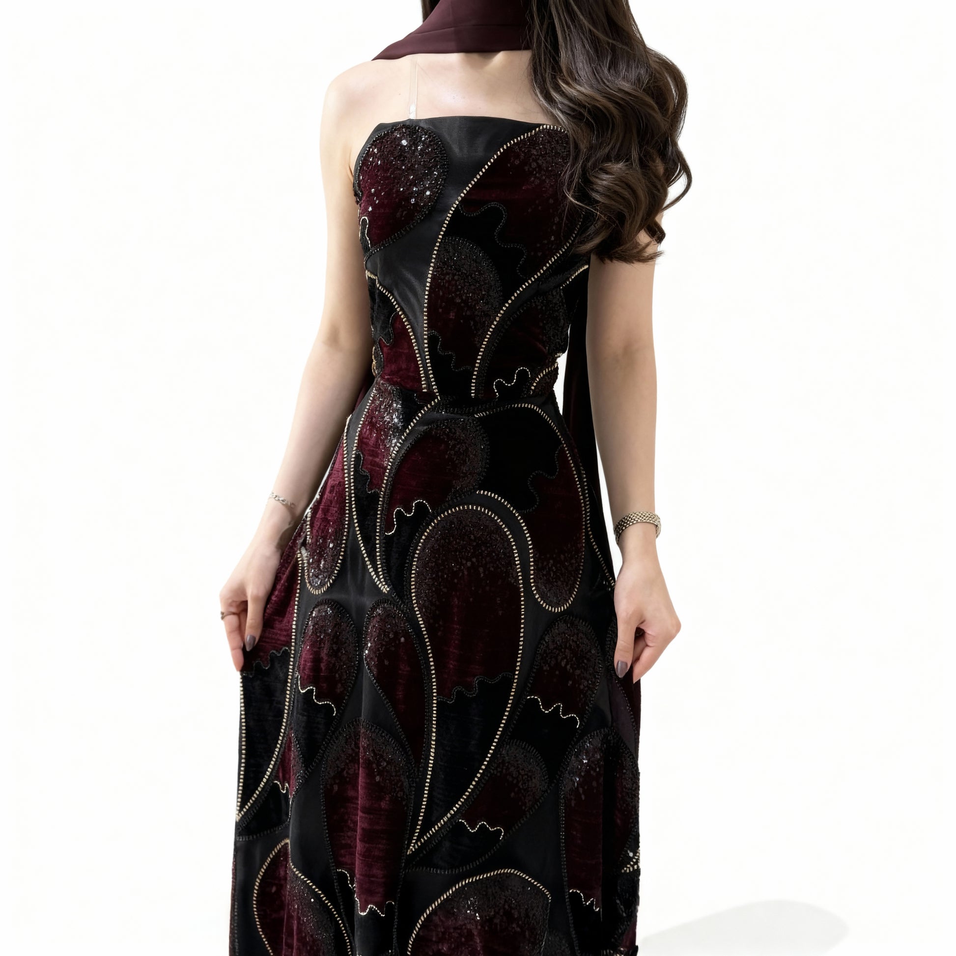 - **الألوان:** مزج بين اللونين الأحمر الداكن والأسود مع تطريزات تبرز اللمسة الفنية وتضفي على الفستان جاذبية خاصة.