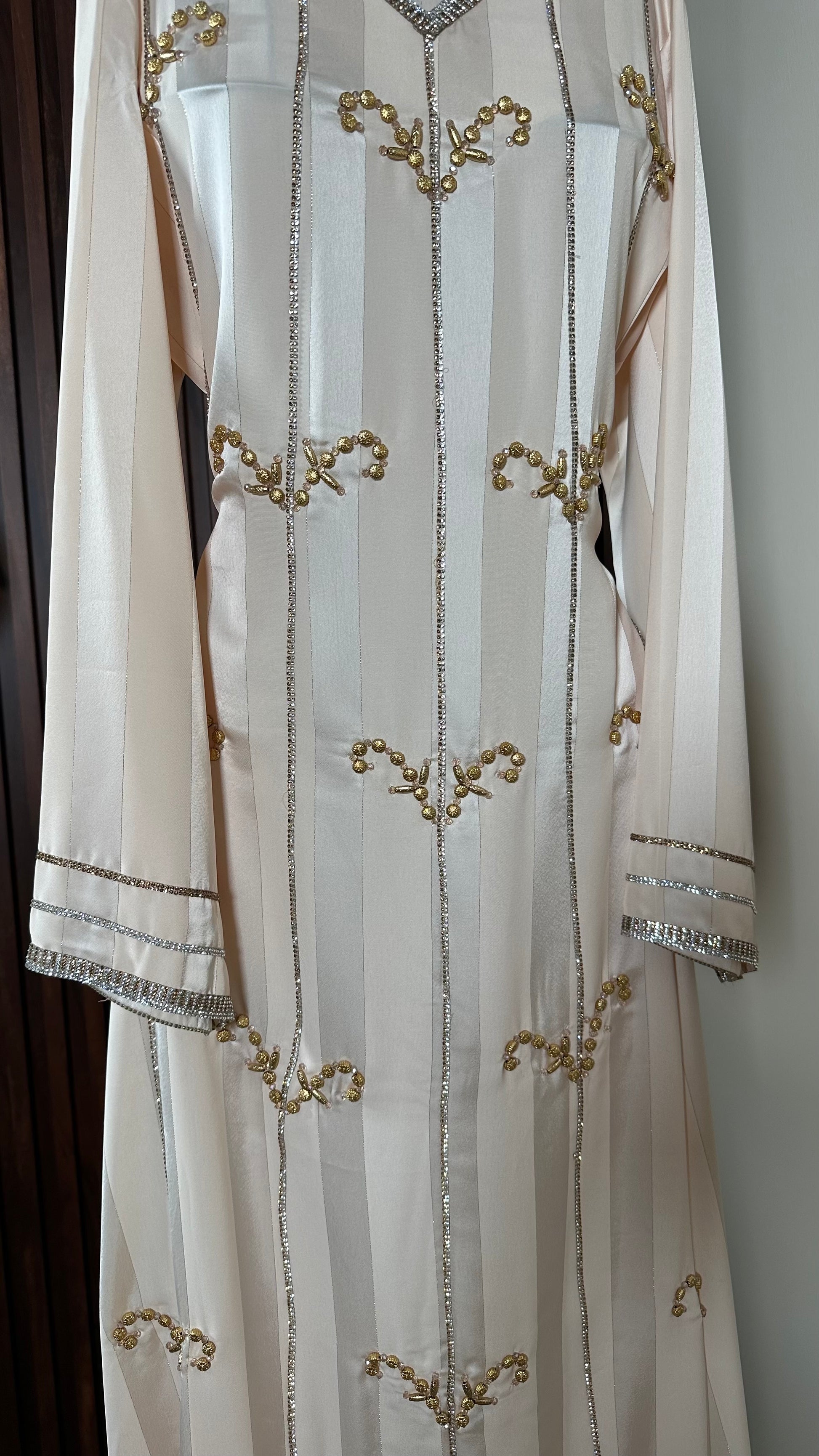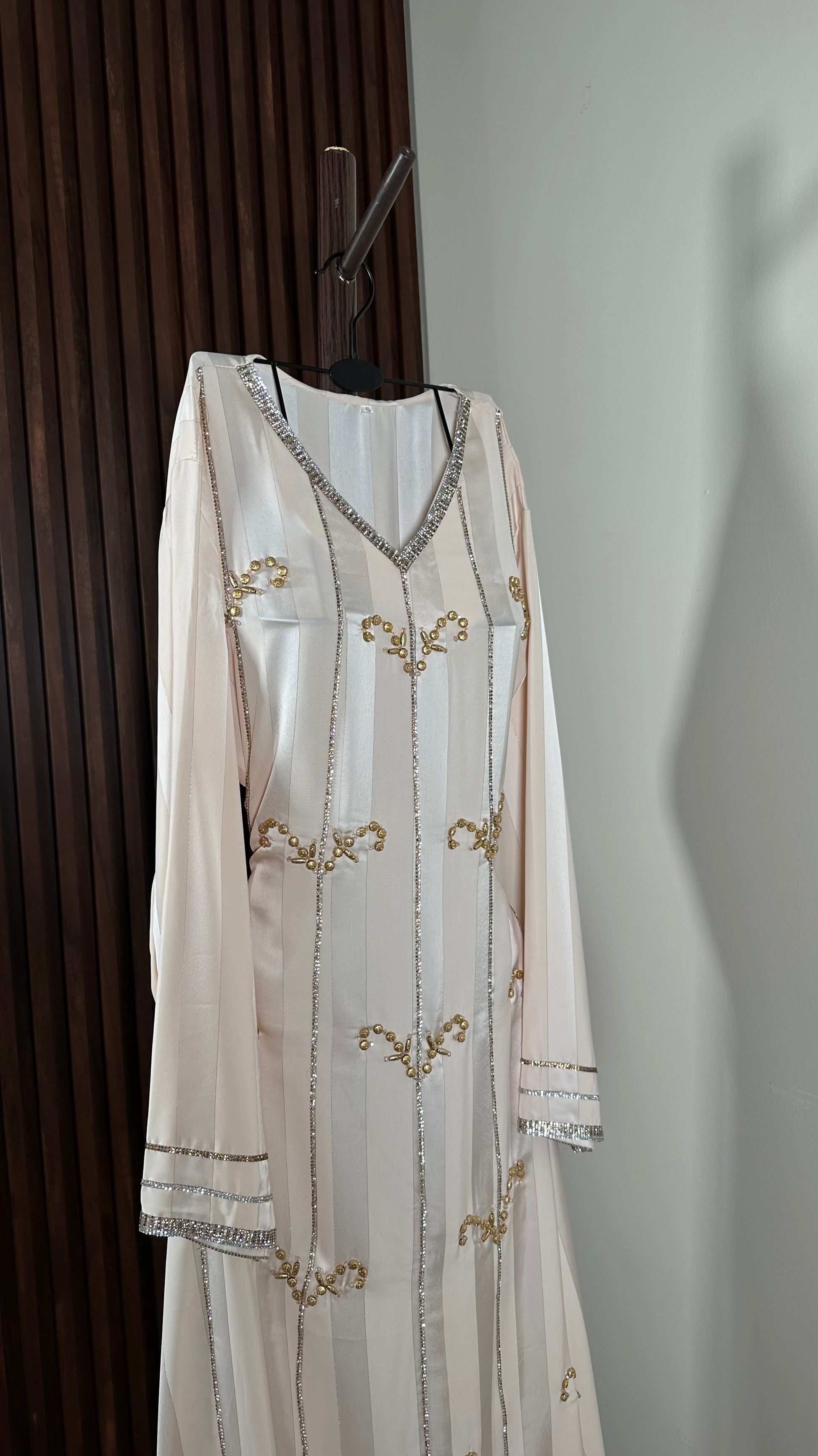 استمتع بإطلالة أنيقة مع هذي الجلابية التي تجمع بين الأصالة والحداثة. بلونه الكريمي الفاتح وتطريزه الرقيق، يُعتبر الخيار الأمثل لمناسباتك الخاصة.