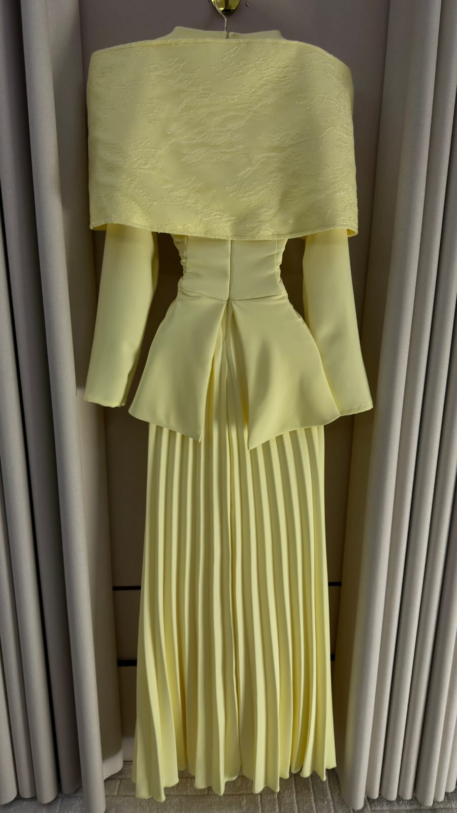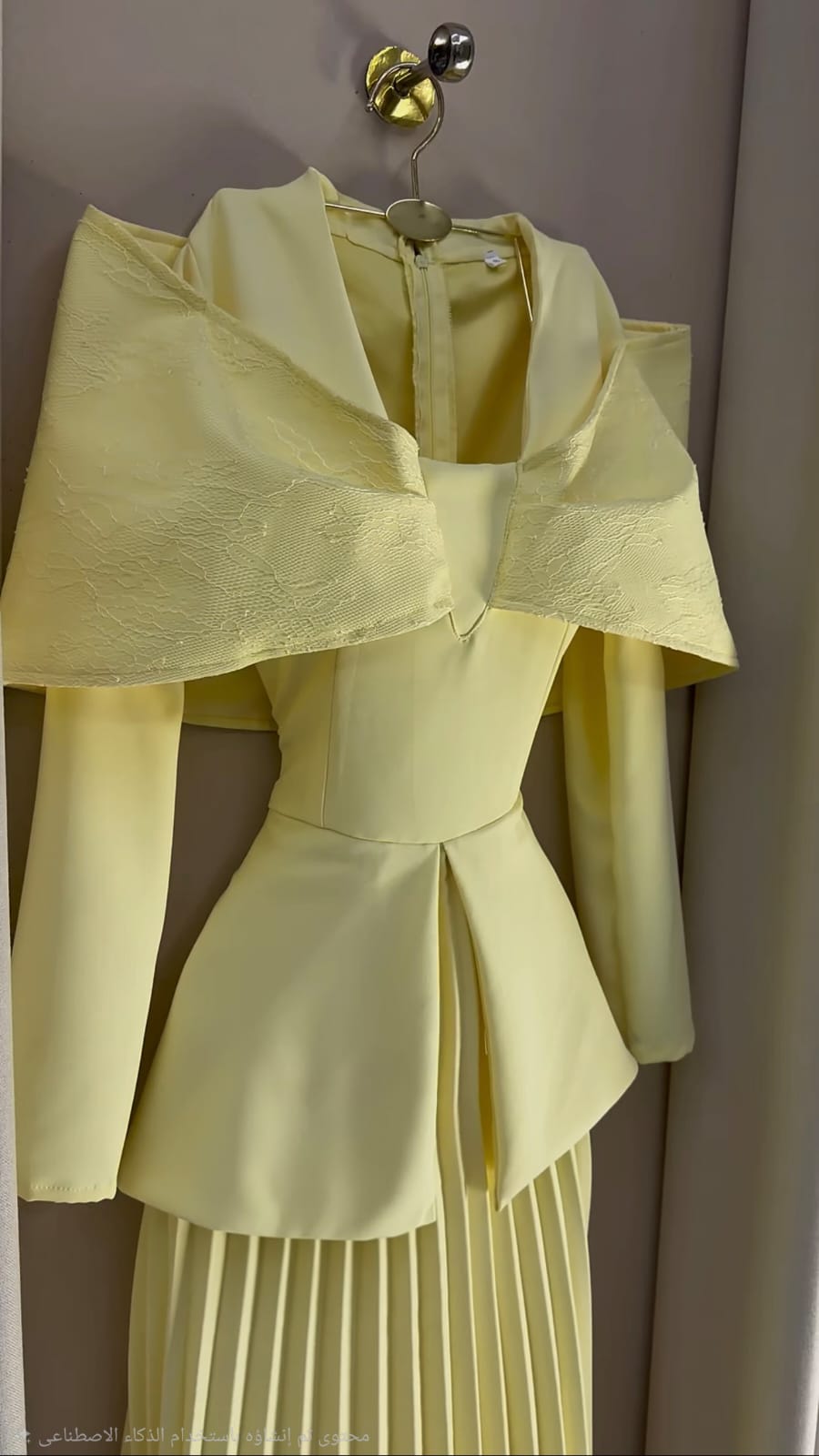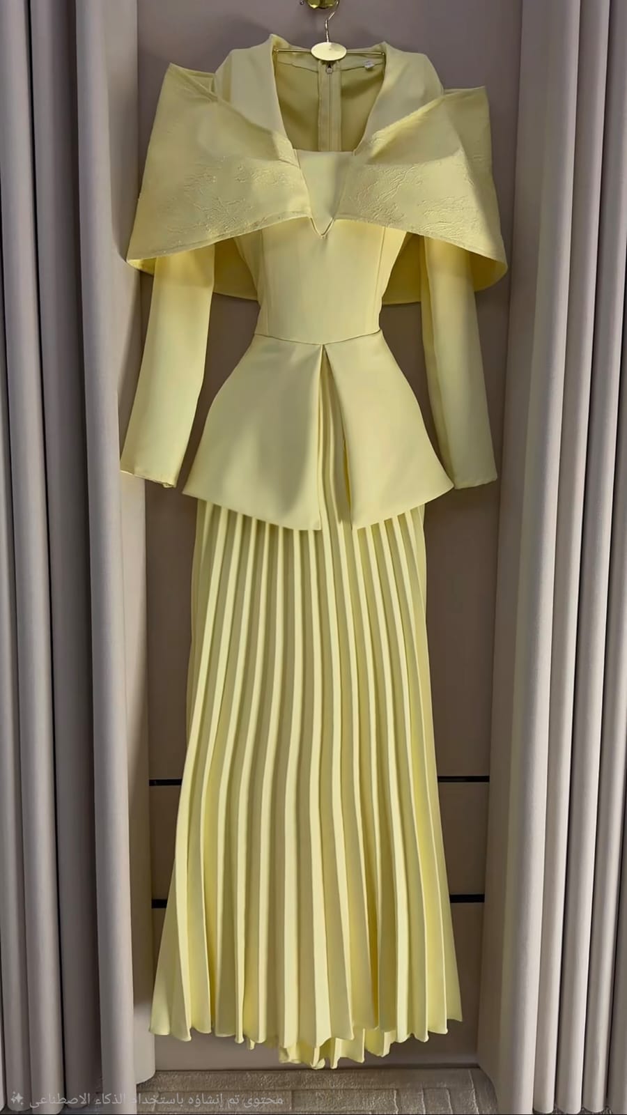 - **قصة بتفاصيل هندسية مذهلة**: مع أكمام واسعة تعزز من شكل الفستان الجمالي.