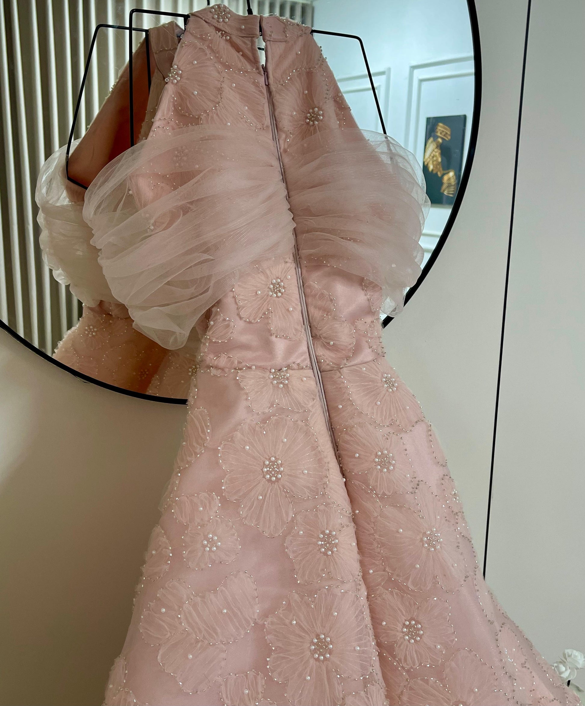 يفضل غسل الفستان يدويًا بالماء البارد وتركه ليجف بشكل طبيعي للحفاظ على جمال القماش وتفاصيله.