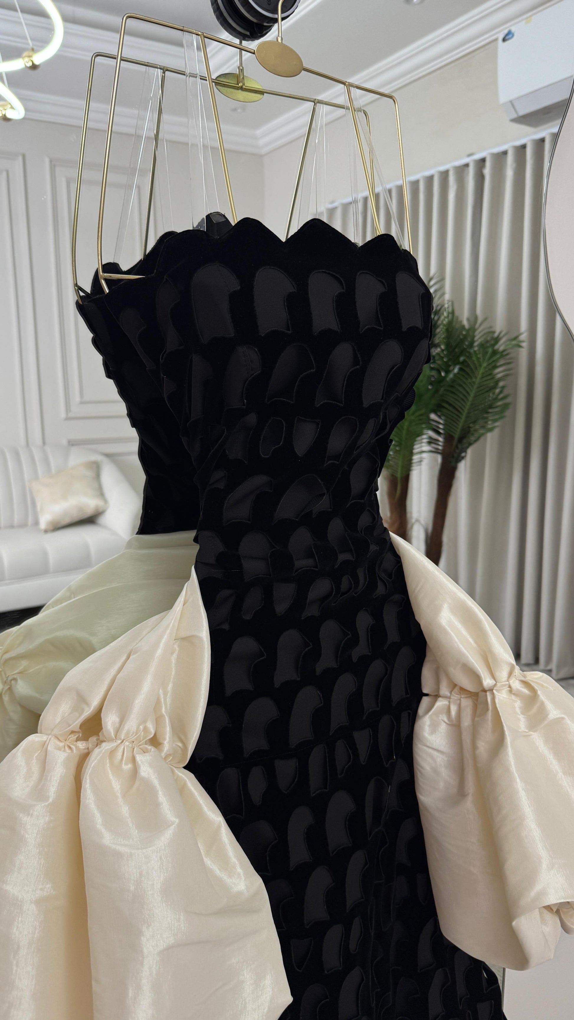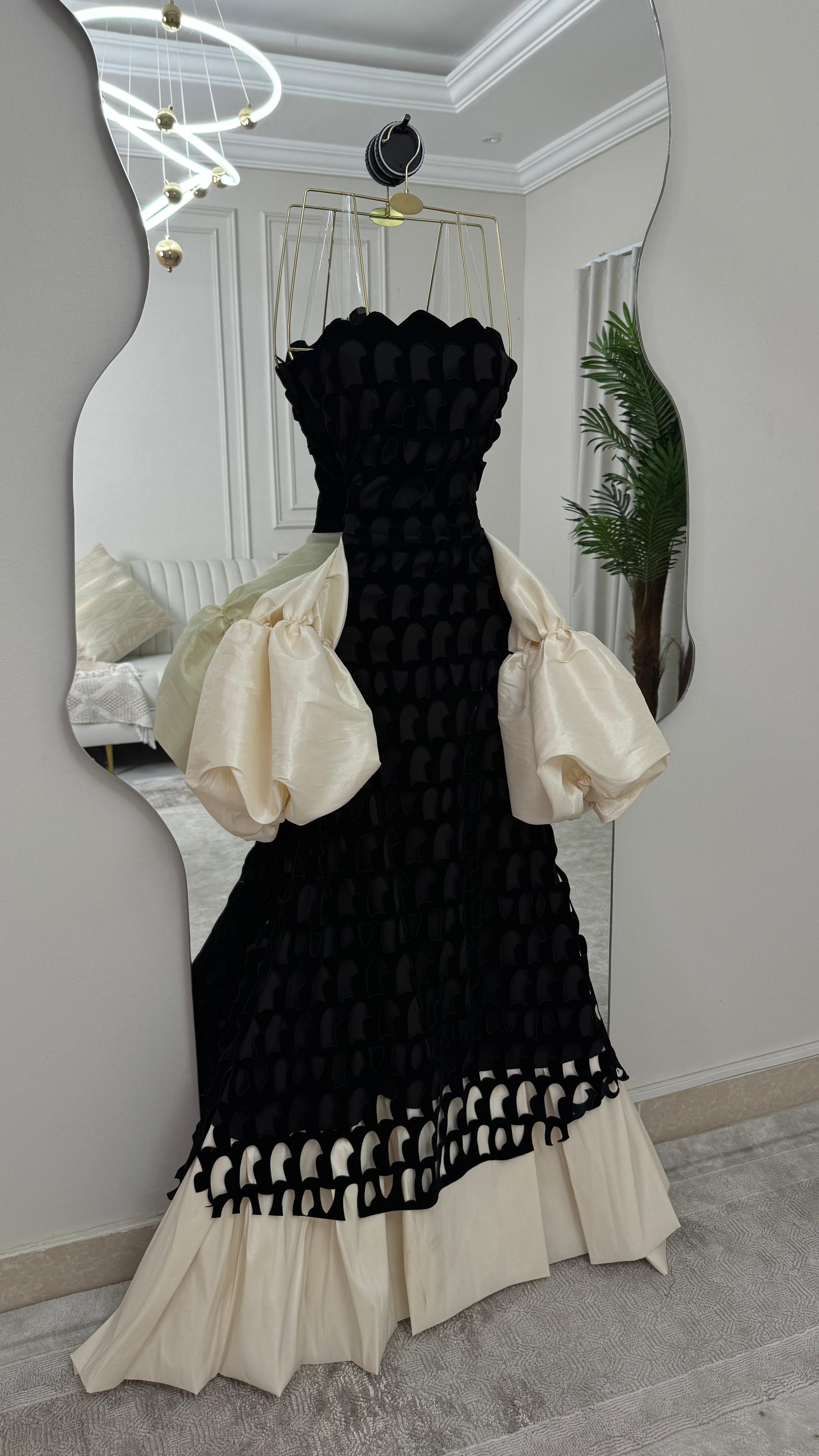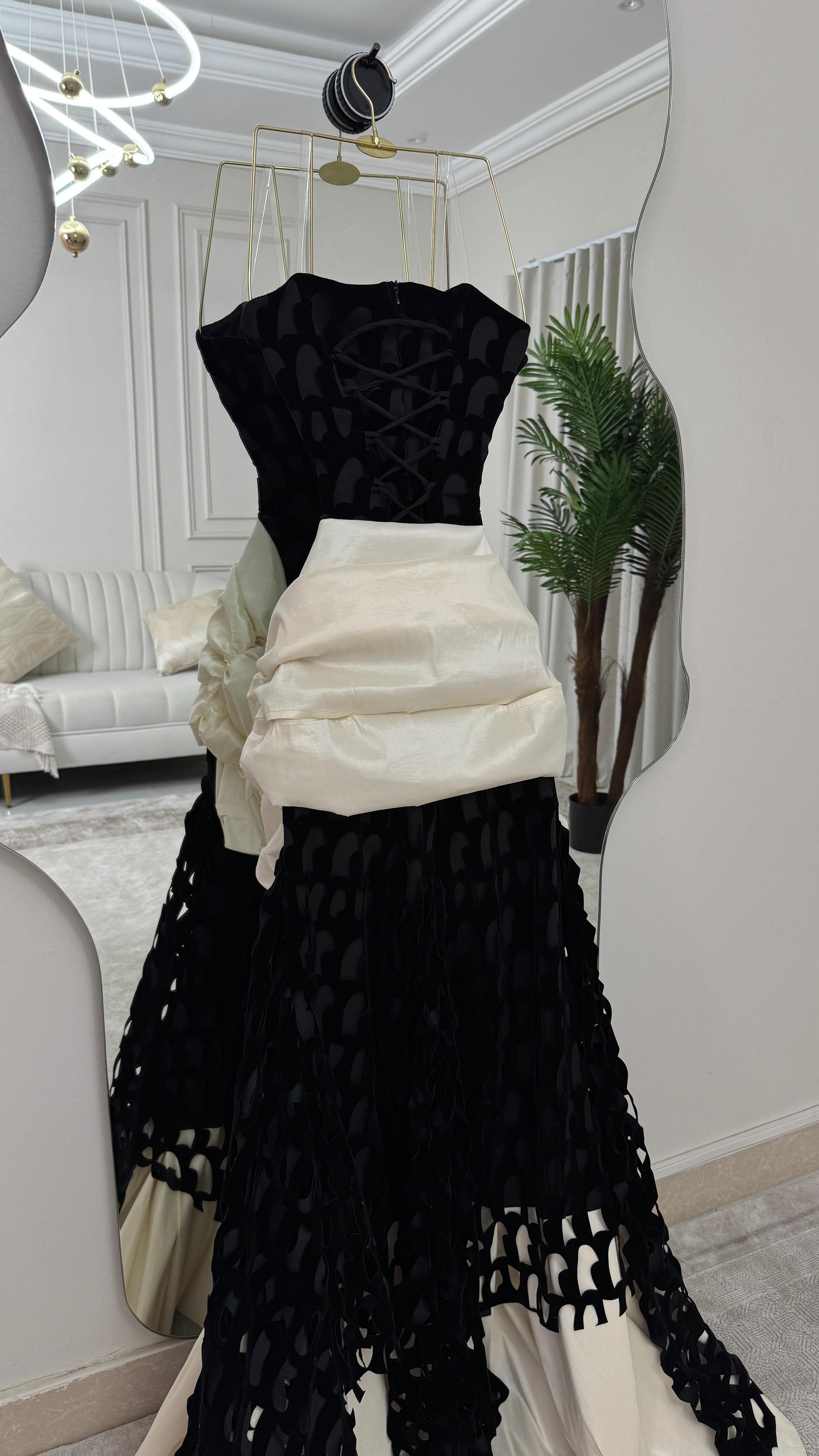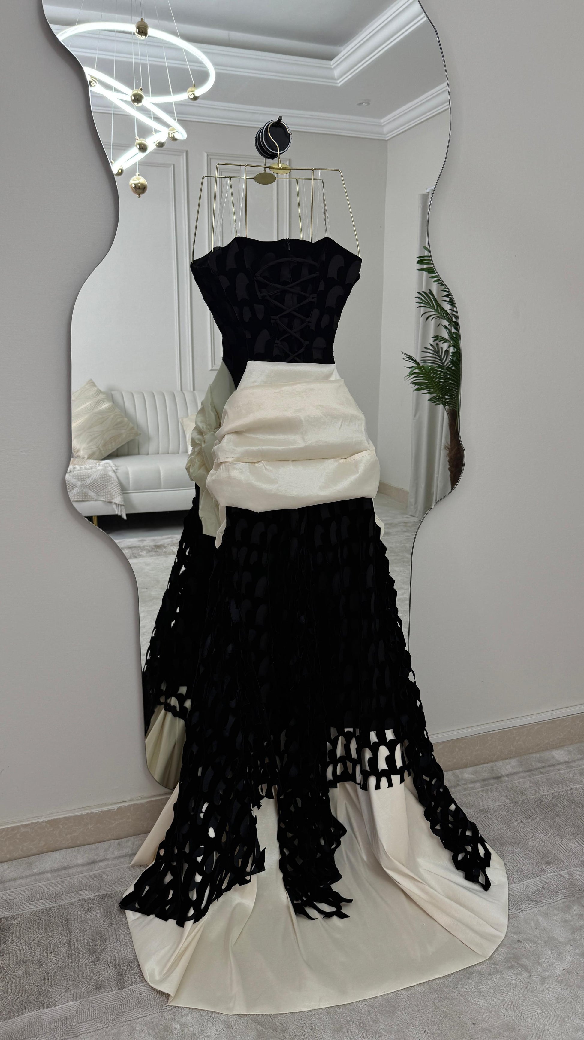 اجعلي إطلالتك مميزة وأنيقة مع هذا الفستان الأسود والأبيض الفاخر. يجمع بين الأسلوب الجريء واللمسات الرومانسية، مما يجعله الخيار المثالي للمناسبات الراقية.